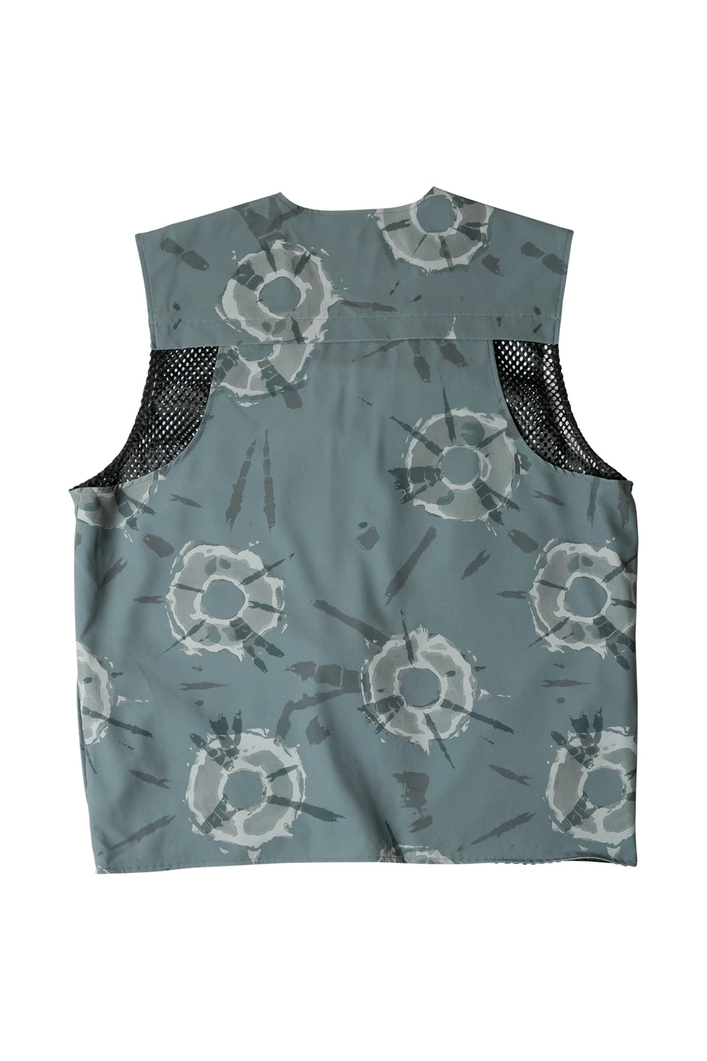 Casual fit, full zip lightweight mesh lined vest, one chest zip pocket with patterned webbing and two twin pleated cargo pockets with hook and loop closure (one additional mesh pocket), utility loop bar tacked above chest pockets, lower pleated cargo pocket (two additional mesh pockets) with hook and loop closure and on seam hand pockets, back mesh gusseted panels.