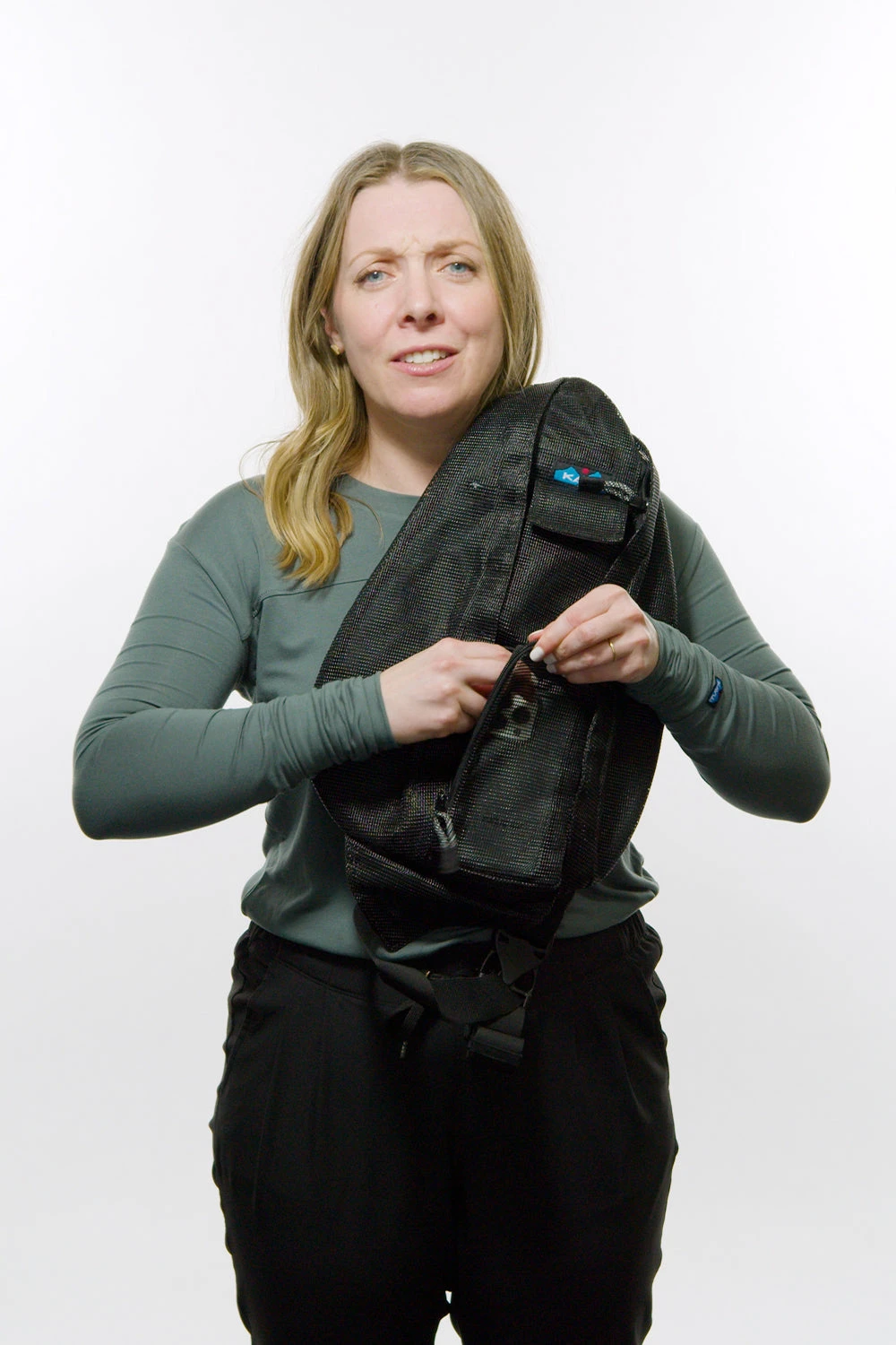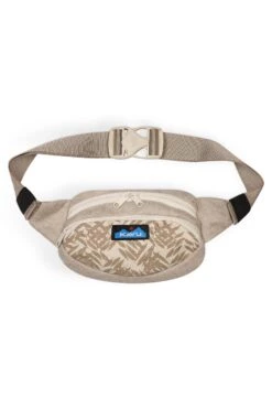 Sling pack with adjustable rope shoulder strap and side release buckle, elastic webbing keeper at strap end, two vertical zip compartments, two key or cell phone pockets, padded back with KAVU embroidery.