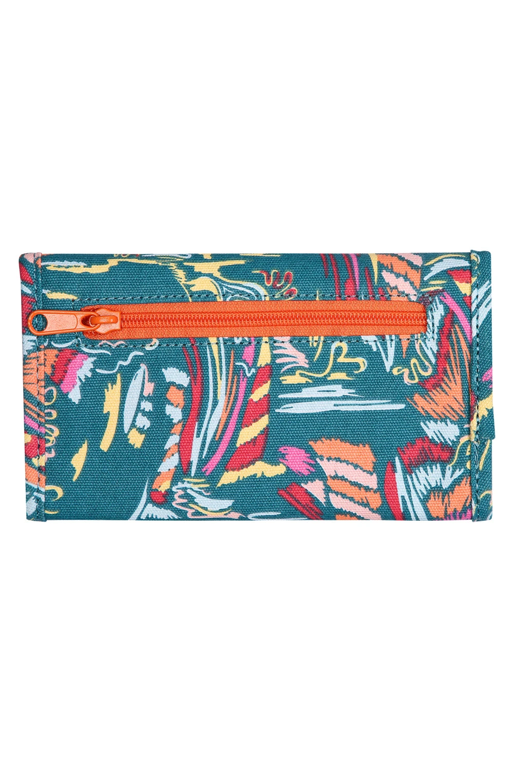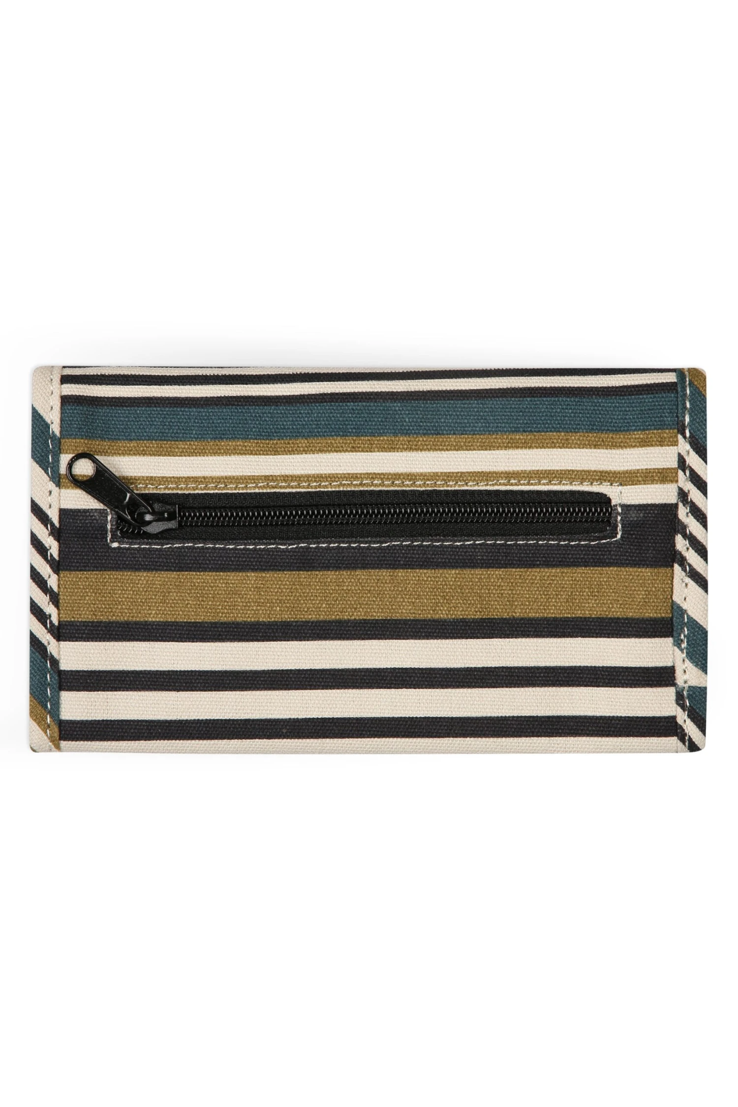 Tri-fold wallet, snap closure, one external zip pocket, internal checkbook and pen holder, multiple internal cash, card, ID slots.