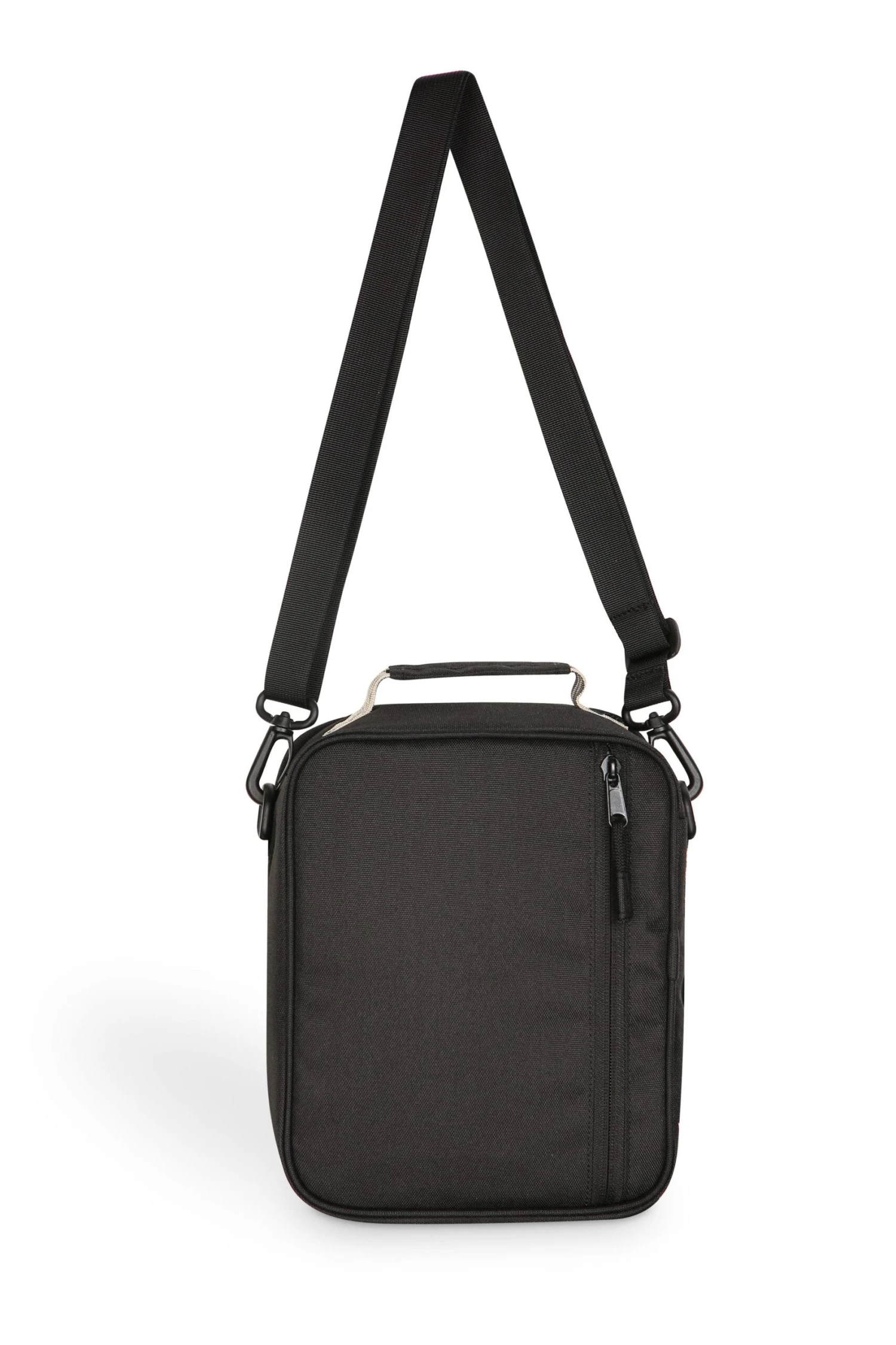 Fully insulated/padded cooler bag, cross body adjustable and detachable shoulder strap, plastic d-ring and spring hook hardware, fixed pattern webbing hand strap with pinched handle, main compartment with two-way zip closure, rope loop zip pulls, exterior hook and loop slip and zip pockets, interior mesh zip pocket. Designed to hold ice packs, not loose ice.