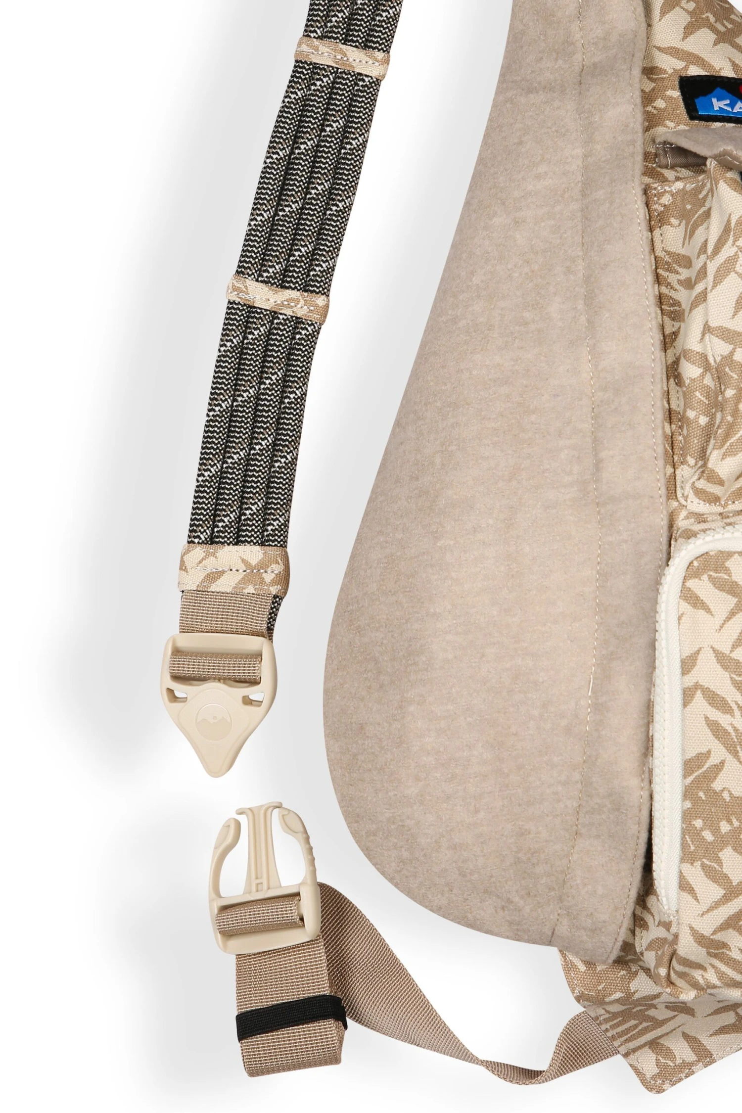 Sling pack with adjustable rope shoulder strap and side release buckle, elastic webbing keeper at strap end, two key or cell phone pockets with pattern webbing detail, exterior back zip pocket, interior d-ring key chain loop, padded back with KAVU embroidery.