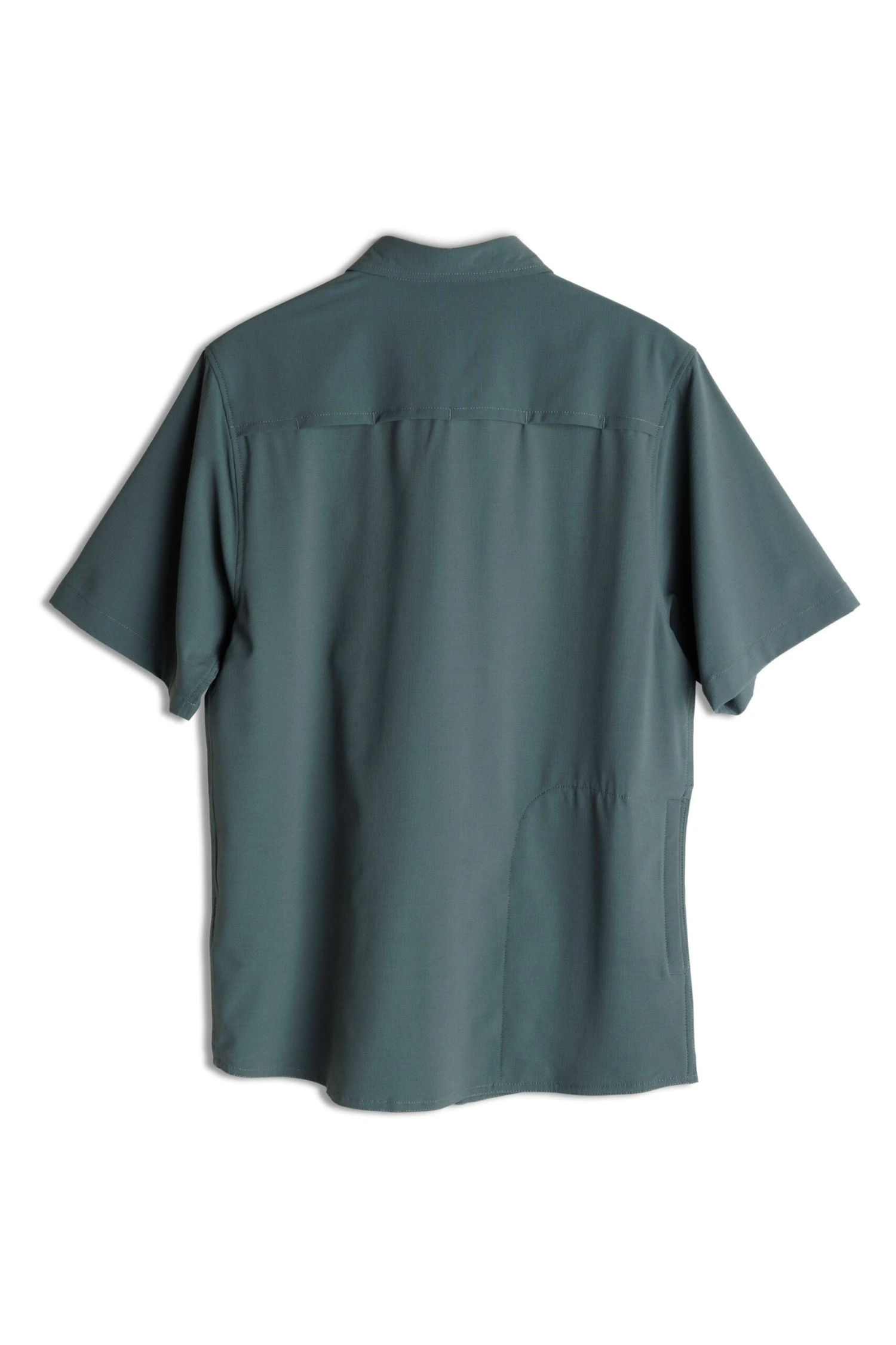Casual fit, short sleeve button up shirt, stand collar, two chest flap pockets with button closure, 25% certified recycled polyester buttons with satin finish, logo snap at hidden pocket at bottom hem, mesh lined onseam back zip pocket, mesh lined vented back yoke panel.