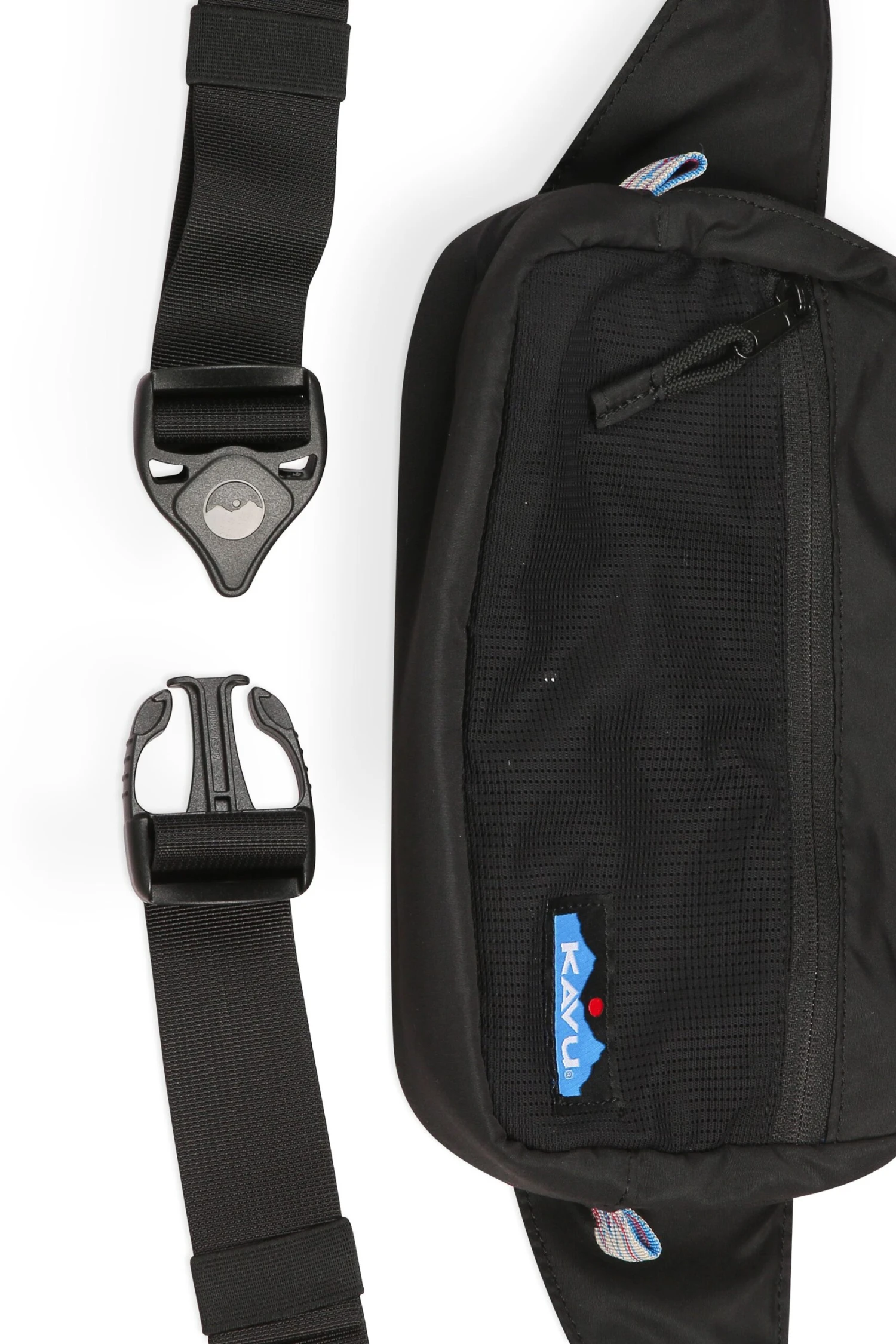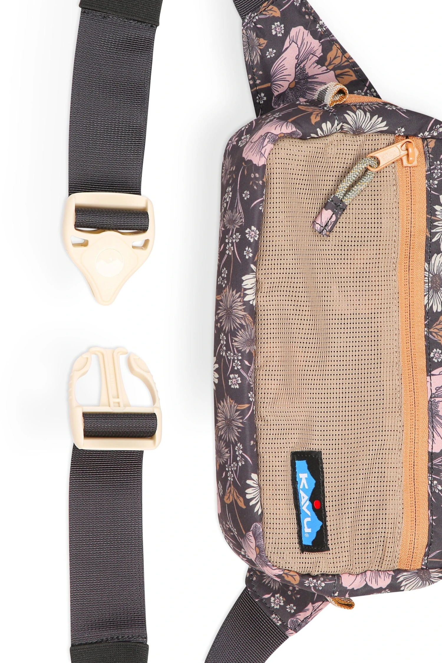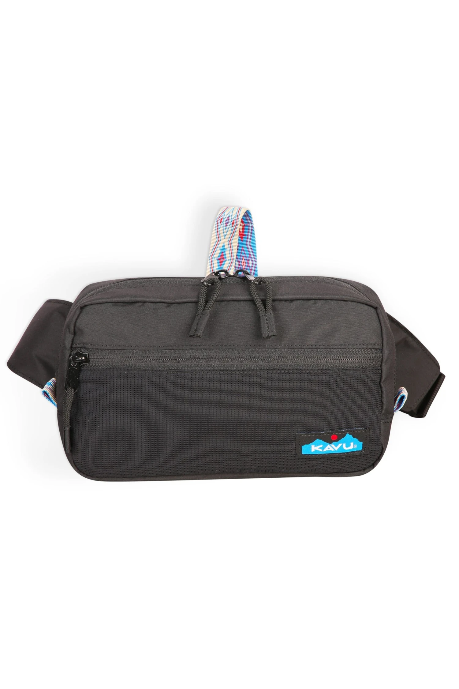 Belt bag / sling bag with adjustable straps and side release buckle, elastic webbing keeper at strap ends, pattern webbing locker loop tab at top, main compartment with two-way zip closure, front mesh zip pocket, internal zip pocket, rope loop zip pulls.