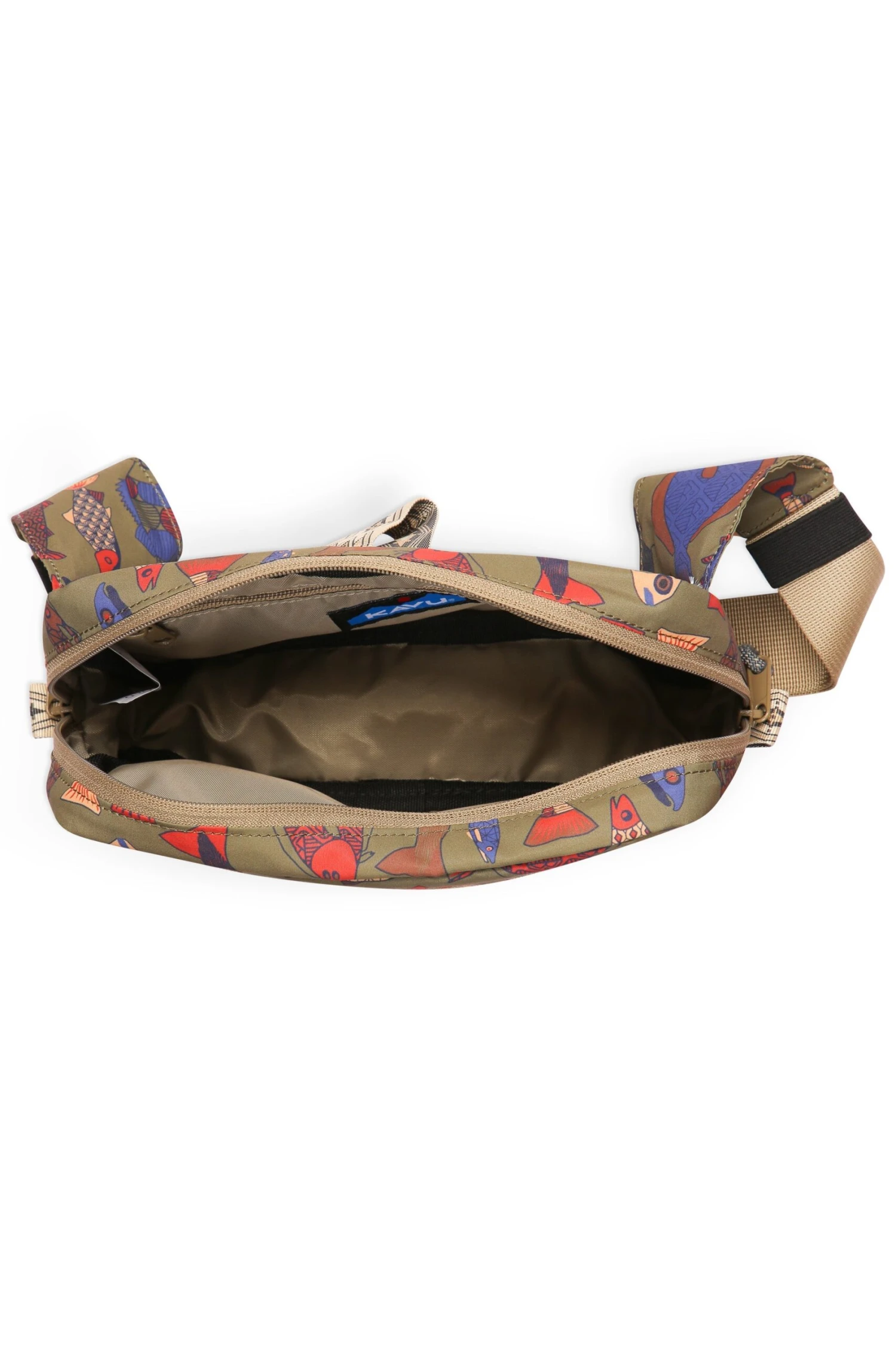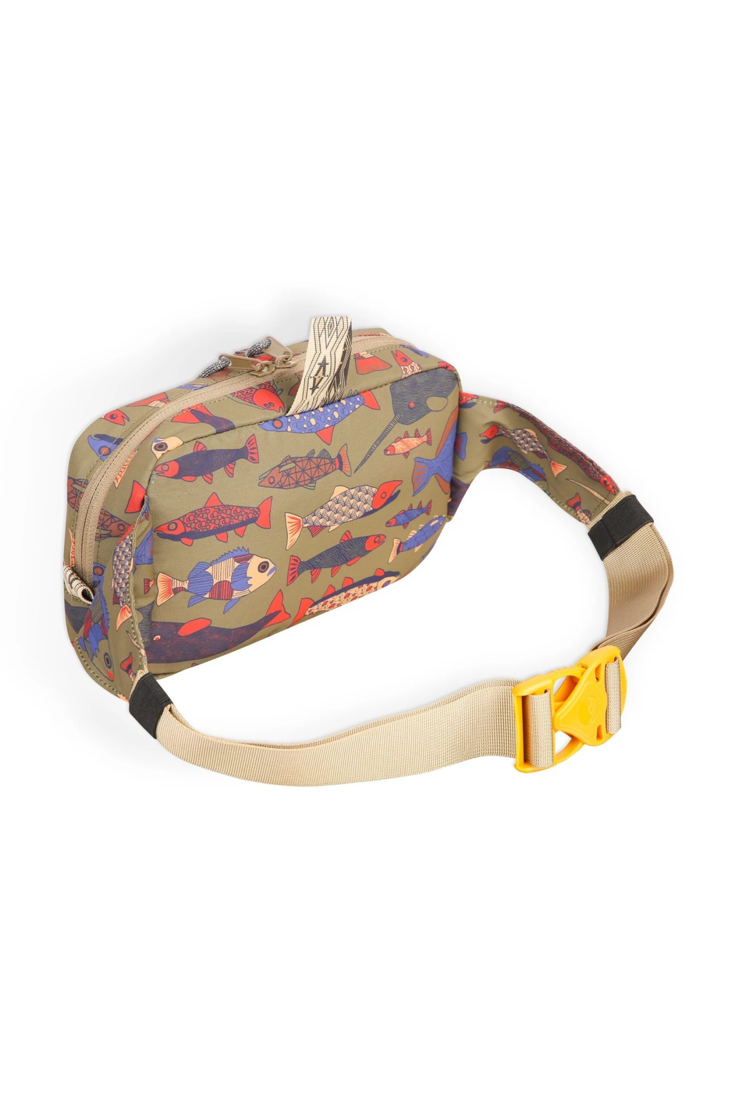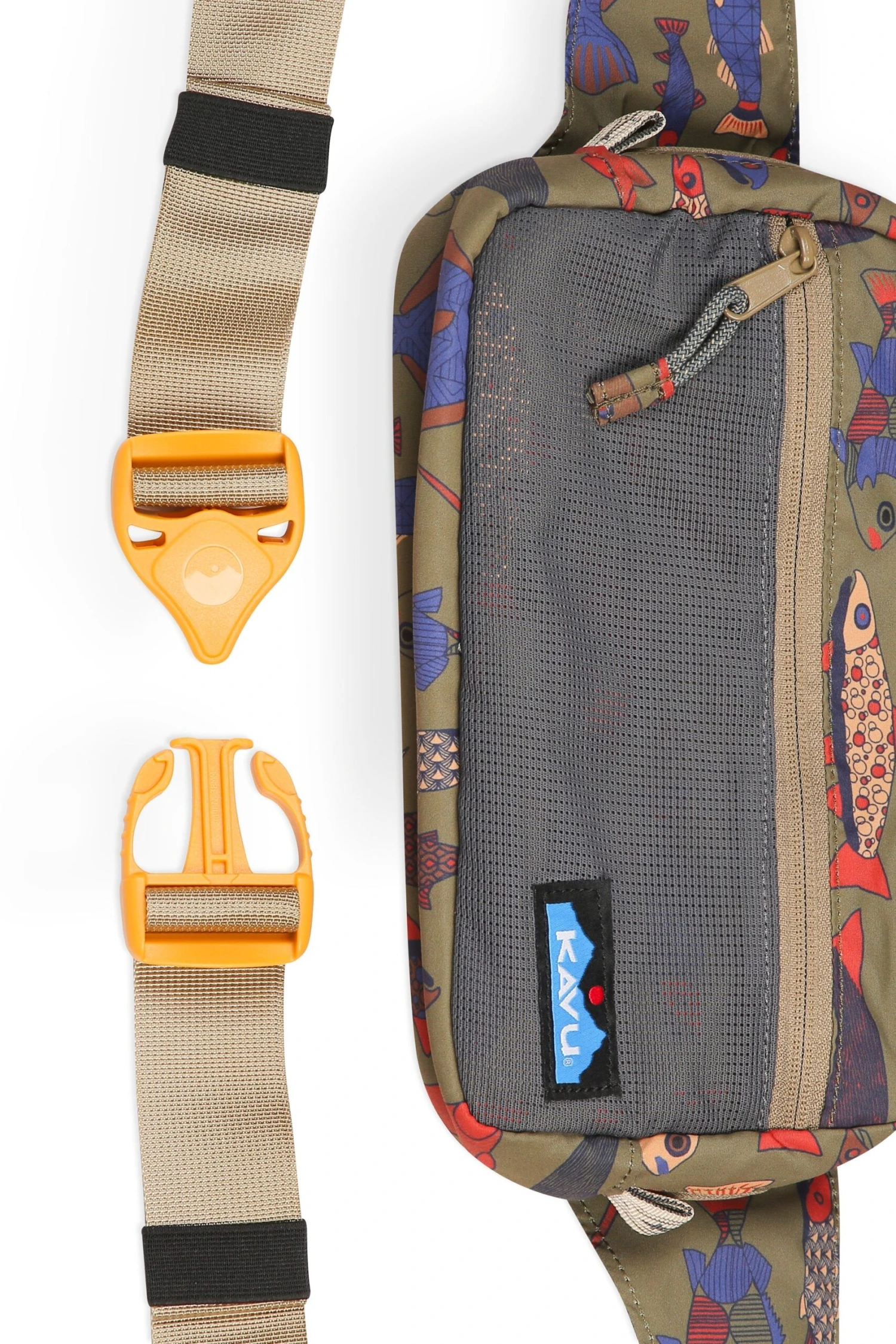 Belt bag / sling bag with adjustable straps and side release buckle, elastic webbing keeper at strap ends, pattern webbing locker loop tab at top, main compartment with two-way zip closure, front mesh zip pocket, internal zip pocket, rope loop zip pulls.