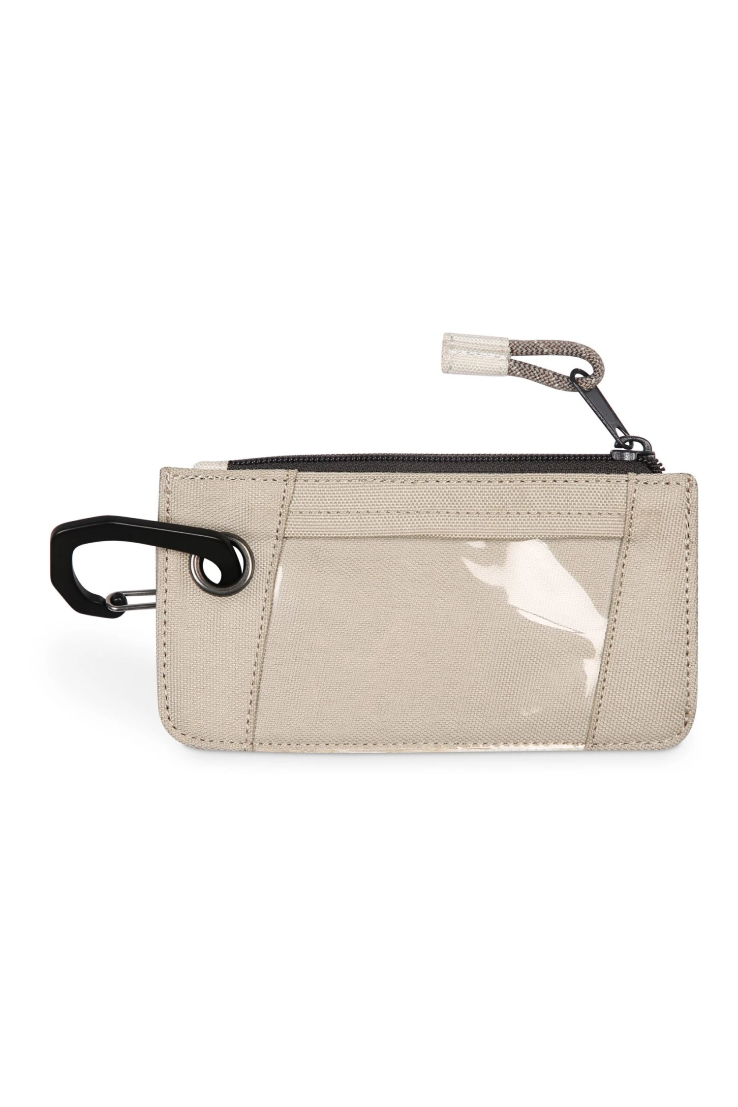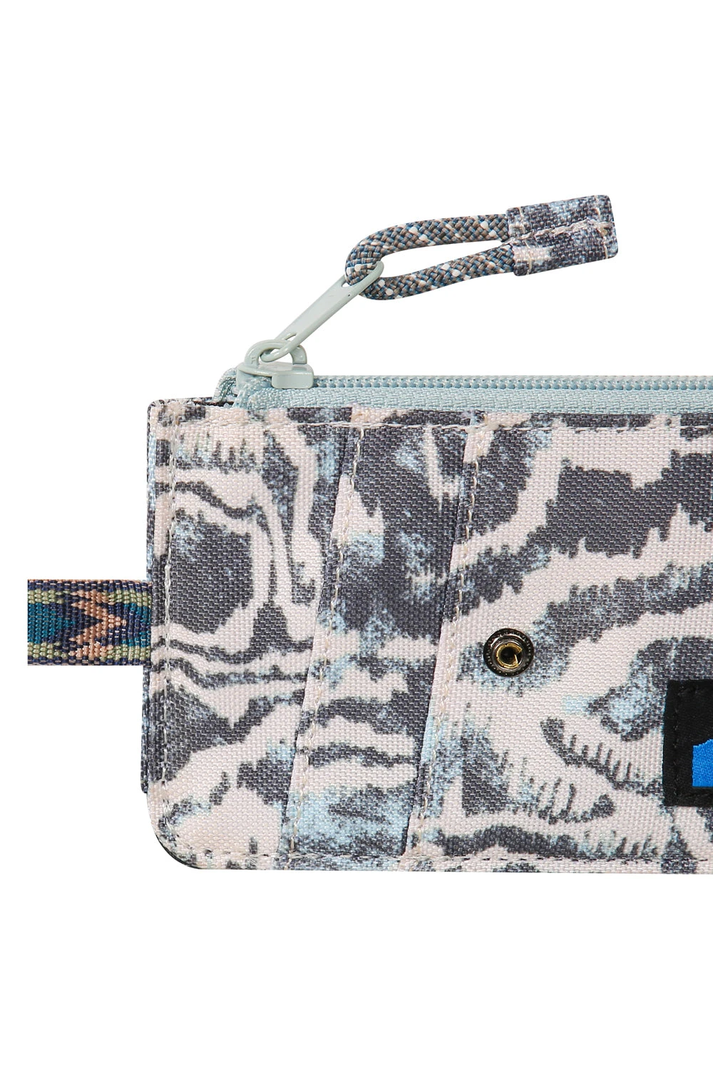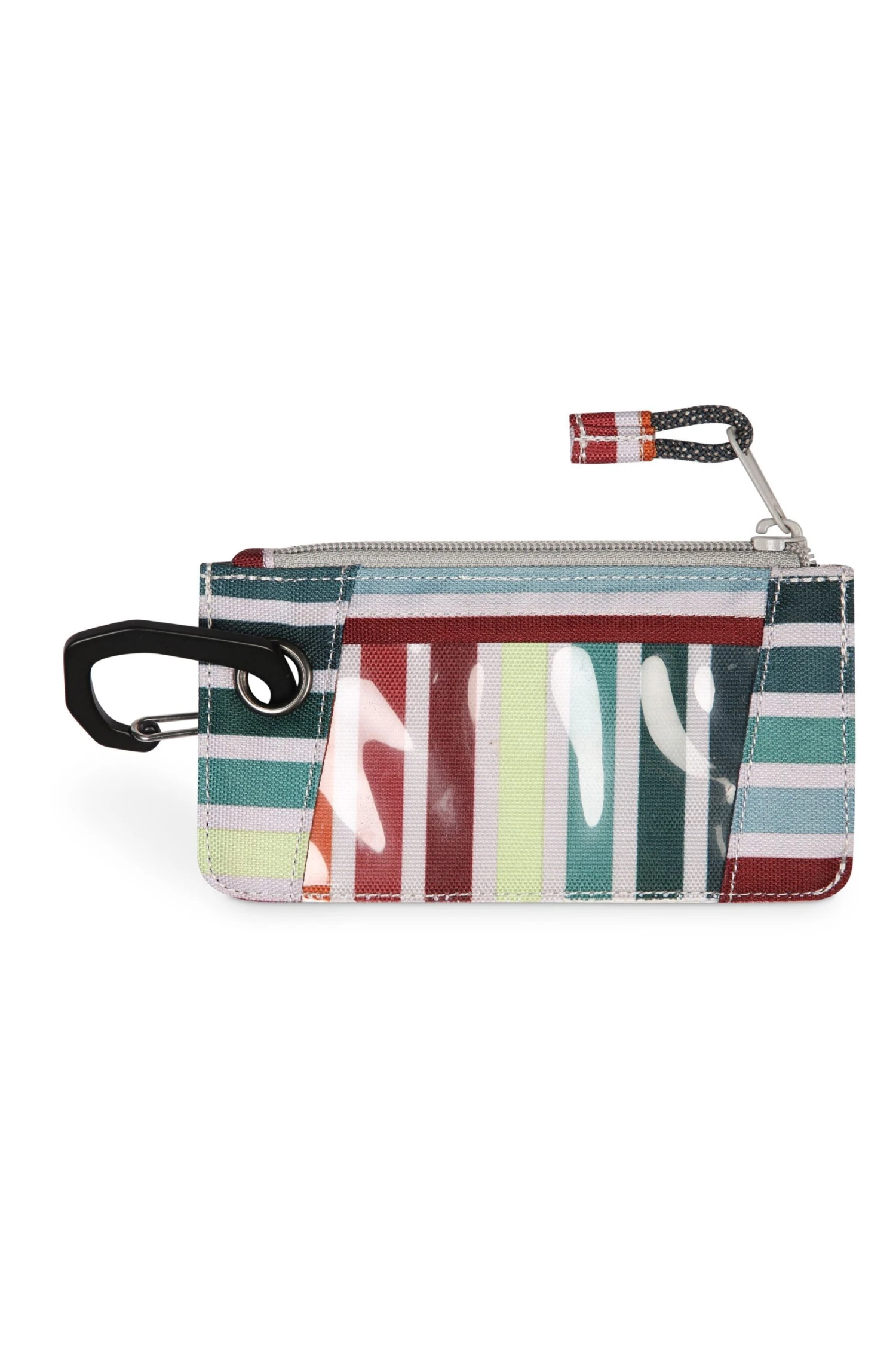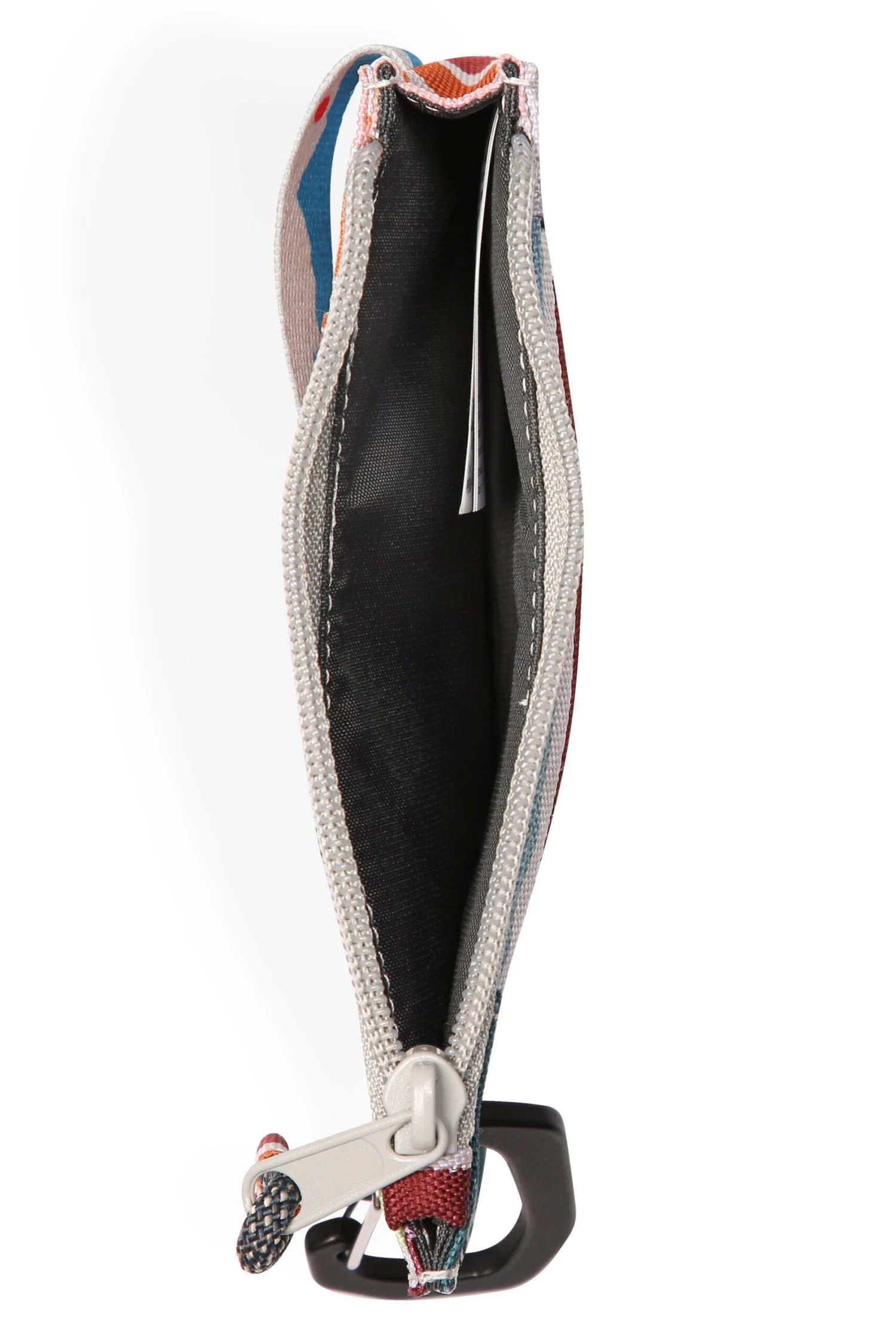 Double sided wallet with metal carabineer clip key ring, one main zip compartment with rope loop zip pull, exterior window slot and card slots with pattern webbing strap and snap closure.