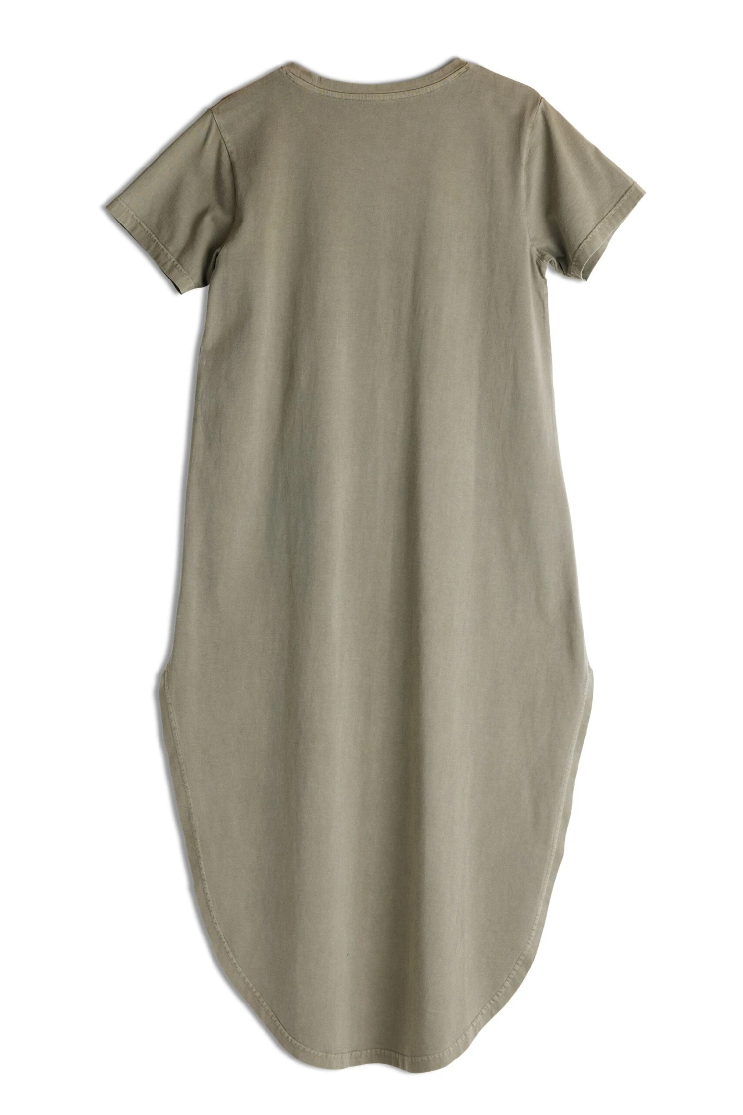 Relaxed fit, short sleeve t-shirt dress, self-fabric crew neckline, on seam hand pockets, deep curved hem, length hits mid-calf, heat transfer back neck label.