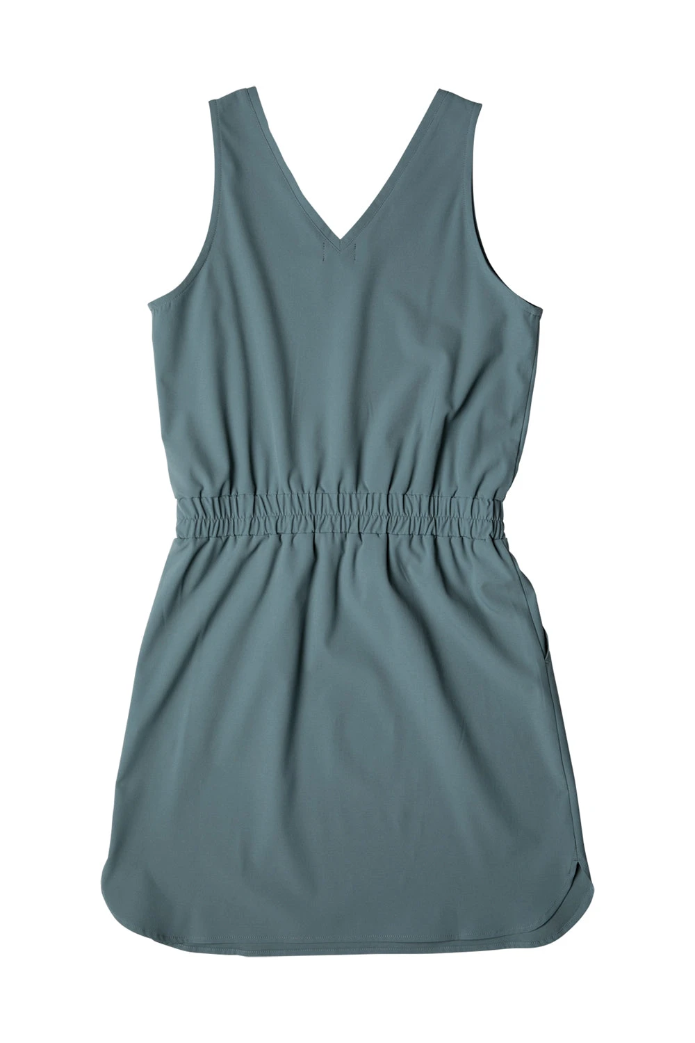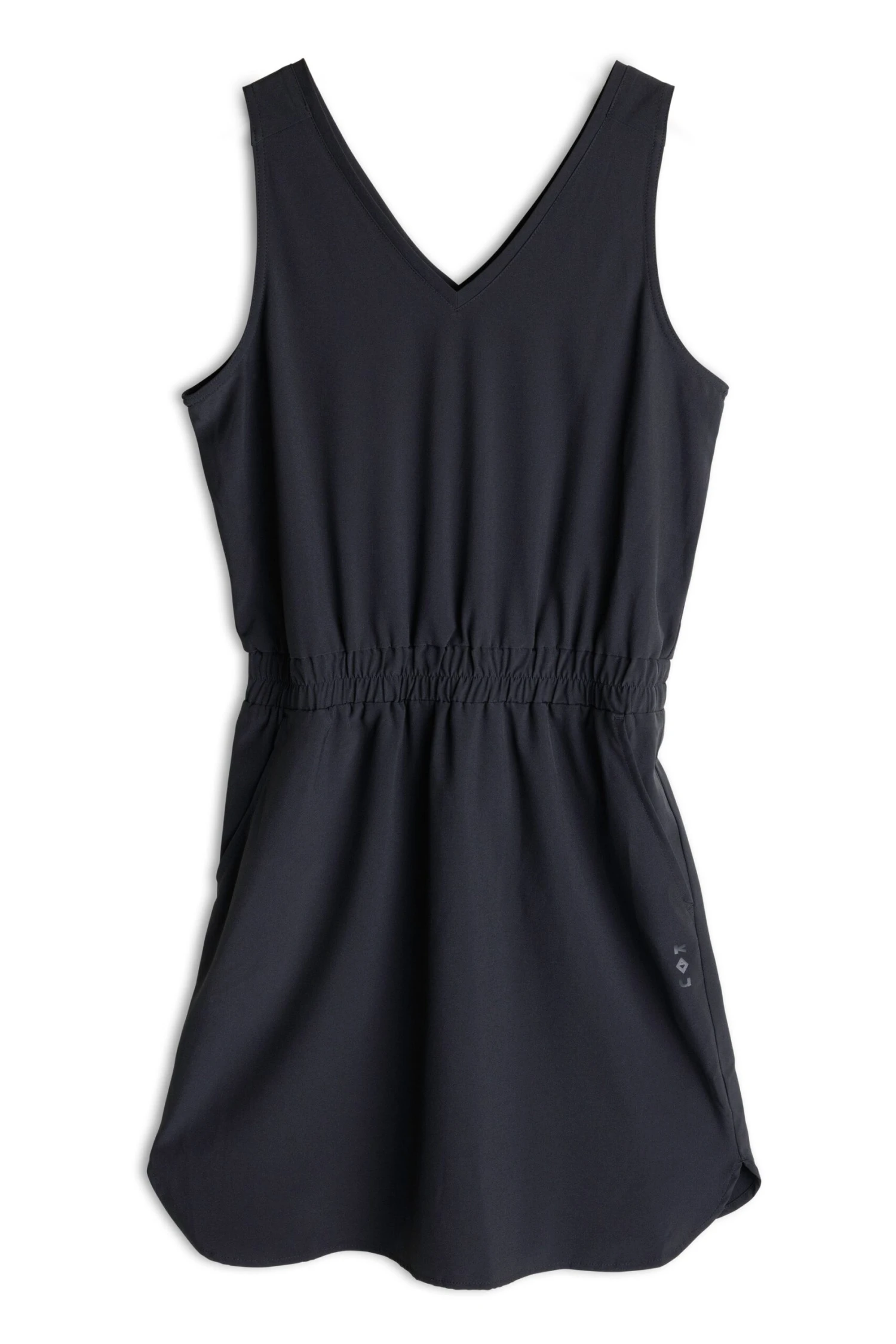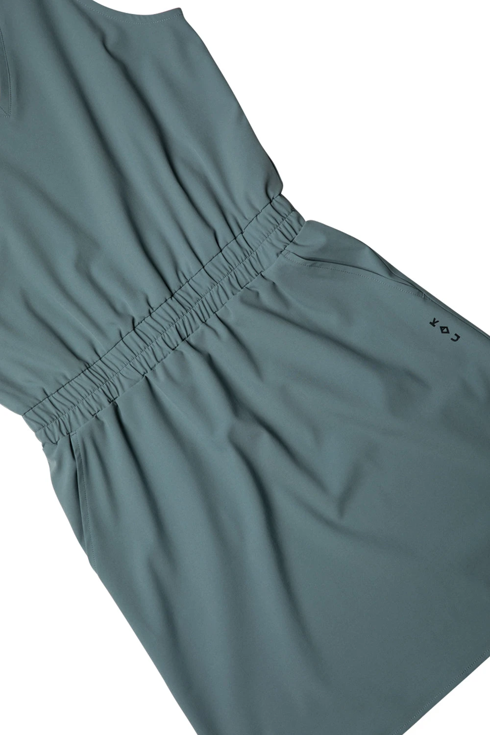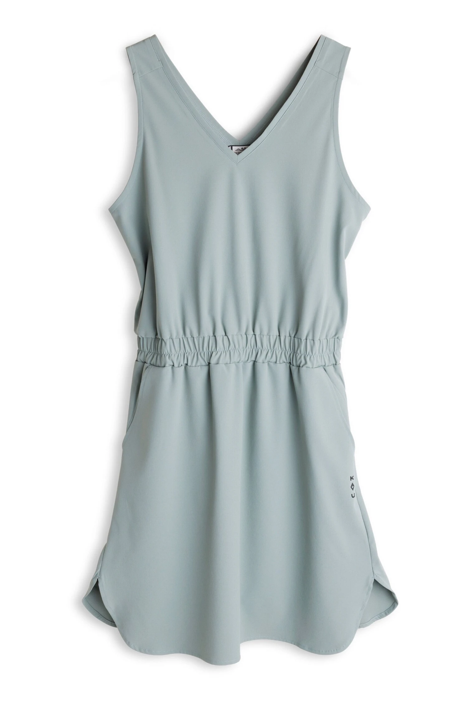 Semi-fitted sleeveless dress, elastic waist, v-neckline, front pockets, curved hem, length hits mid-thigh.