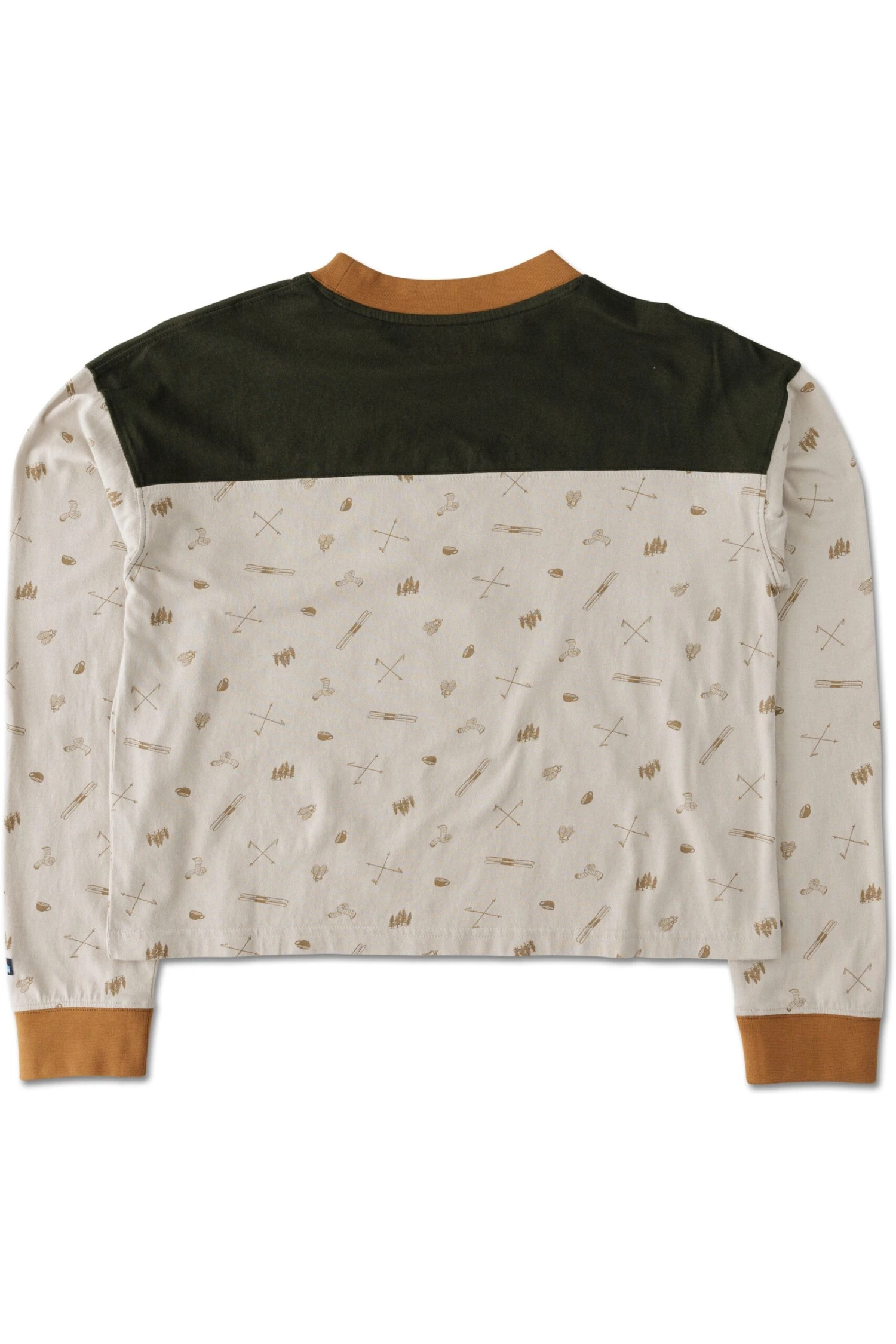 Relaxed fit, long sleeve cropped top, crew neckline, front and back yoke seam styling, screen print on center front chest, ribbed sleeve cuffs, straight hem, heat transfer back neck label.