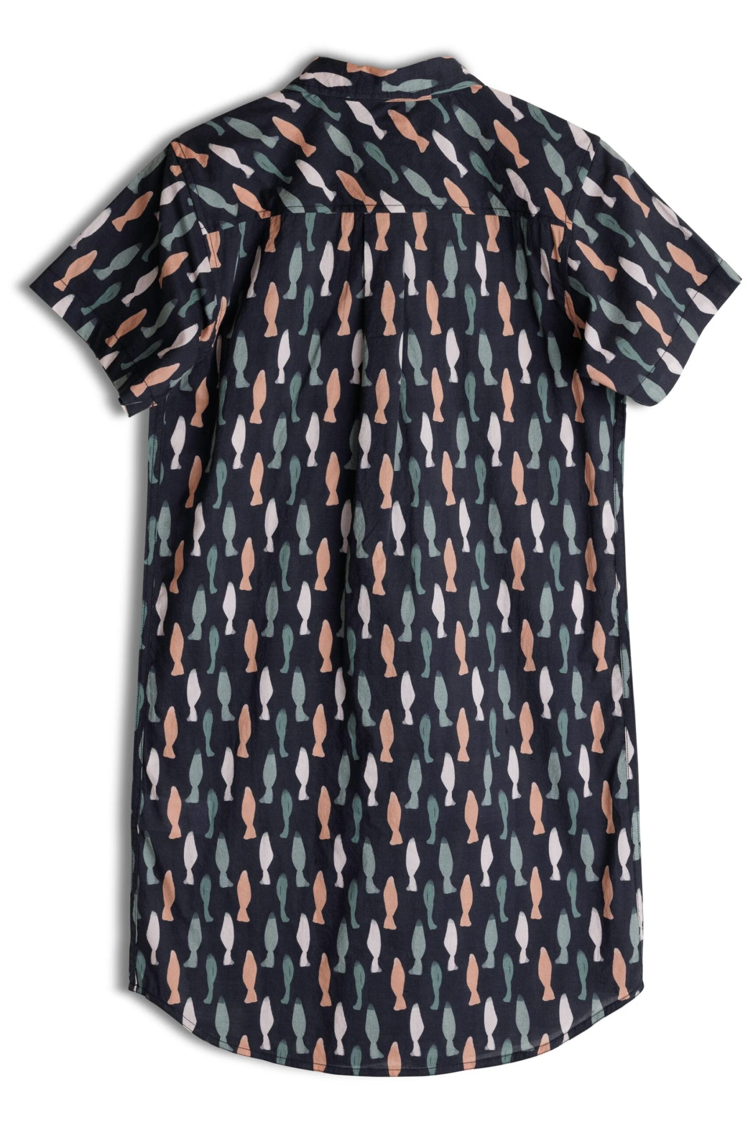 Boyfriend fit, short sleeve button up shirt dress, stand collar, one chest pocket, 25% certified recycled polyester matte buttons, back yoke panel with center back box pleat, curved hem, length hits mid-thigh.