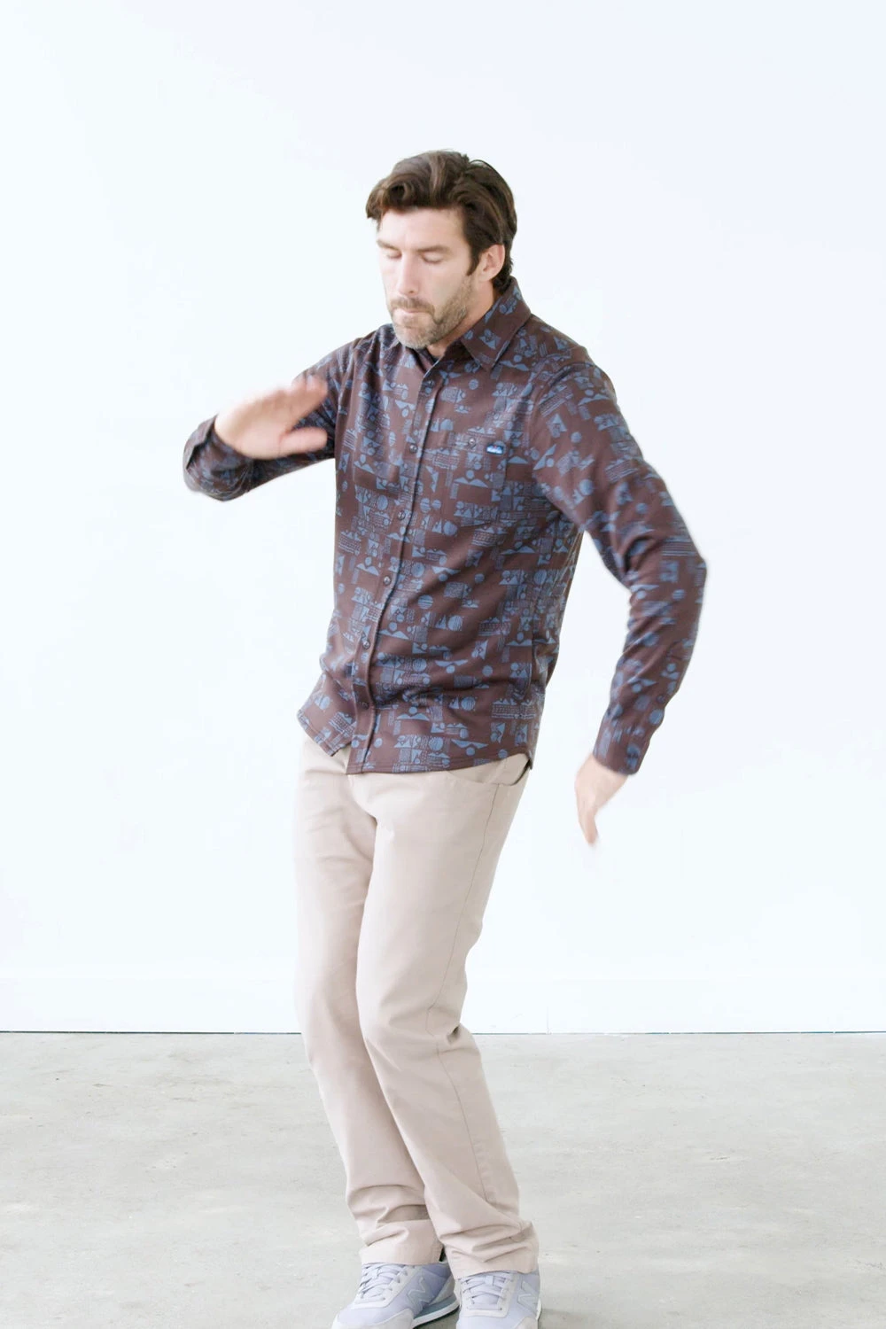 The Hamilton is a the new kid on the knit block. This long sleeve button up shirt is made with a gorgeous birdseye jacquard knit poly stretch. Say that three times fast. KAVU design built this shacket beauty step by step with fish-eye 2 hole faux grey horn buttons, on seam hand pockets, a chest patch pocket with a pen slot, and a CB locker loop.