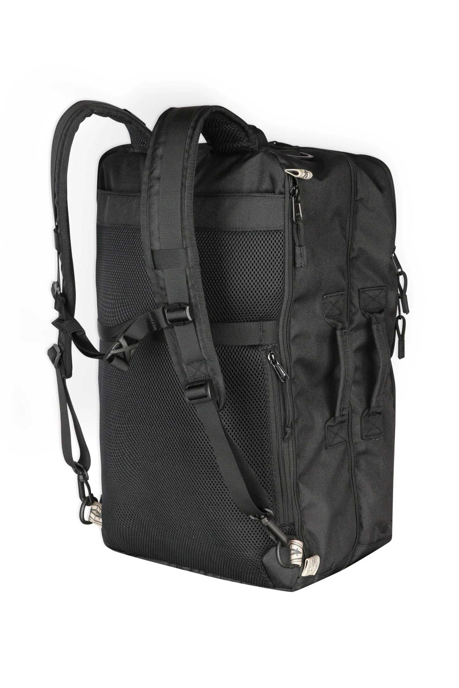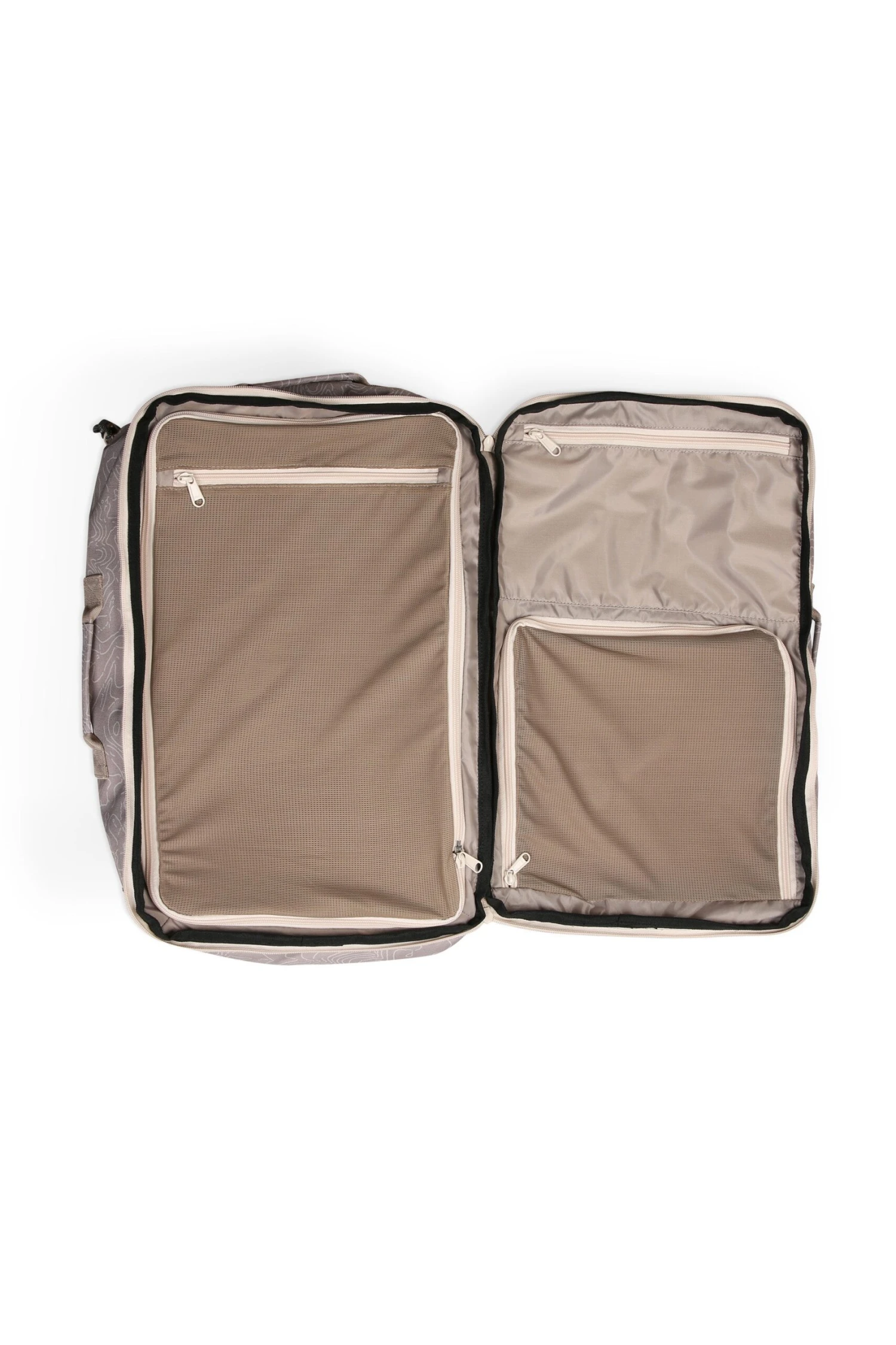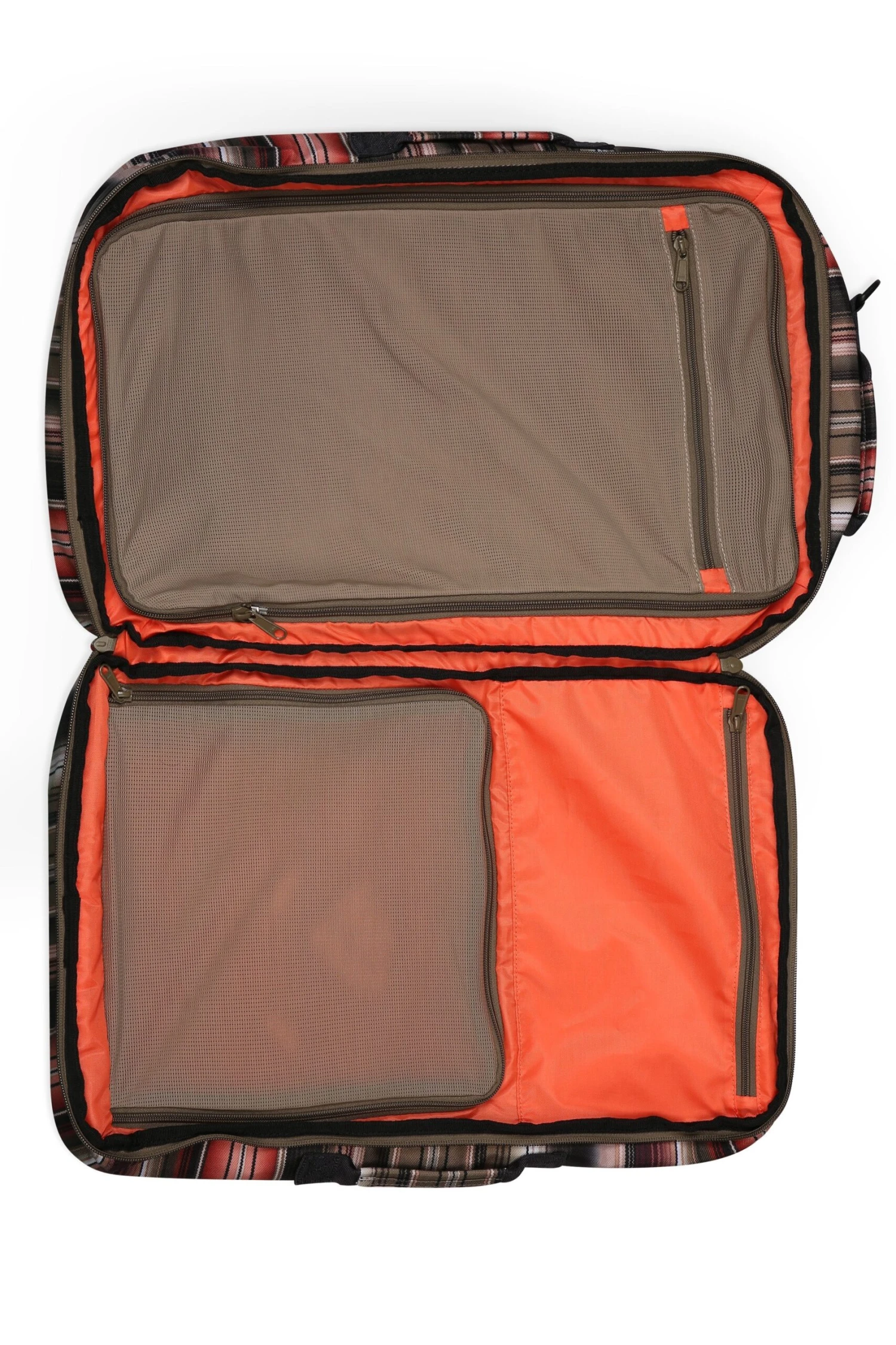 The ultimate backpack travel hauler, clam-shell style main compartment with two-way zip closure and side entry access with padded laptop sleeve, adjustable padded backpack shoulder straps that can store in zip pocket when not in use and it’s easy to check on an airplane, chest straps with side release buckles, plastic D-ring and spring hook hardware, one fixed hand strap at top and two grab handles on each side, soft lined top zip pocket with key fob, one large billowed front zip pocket with daisy chain pattern webbing detail, side mesh pocket, padded bottom and back panel with hidden security zip pocket, rope loop zip pulls, main compartment fully opens flat to a multi compartment organizational design (one small detail pocket, two zip mesh pockets and one removable mesh laundry bag).