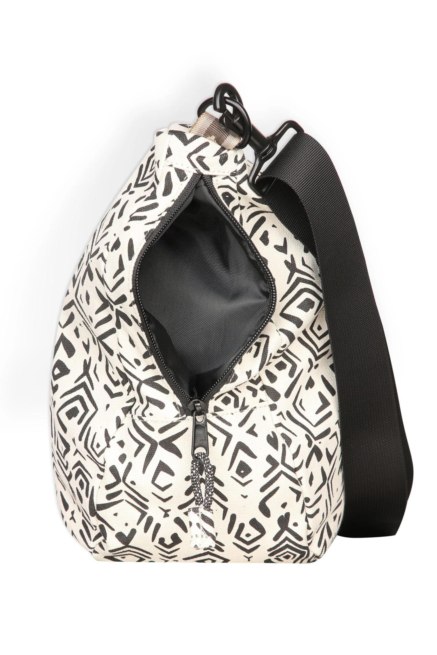 Cross body hobo bag with adjustable webbing shoulder strap that can detach, metal d-ring and snap hook hardware, main compartment with 2-way zip closure, side zip pocket, internal zip pocket and pattern webbing key fob clip, rope loop zip pulls.