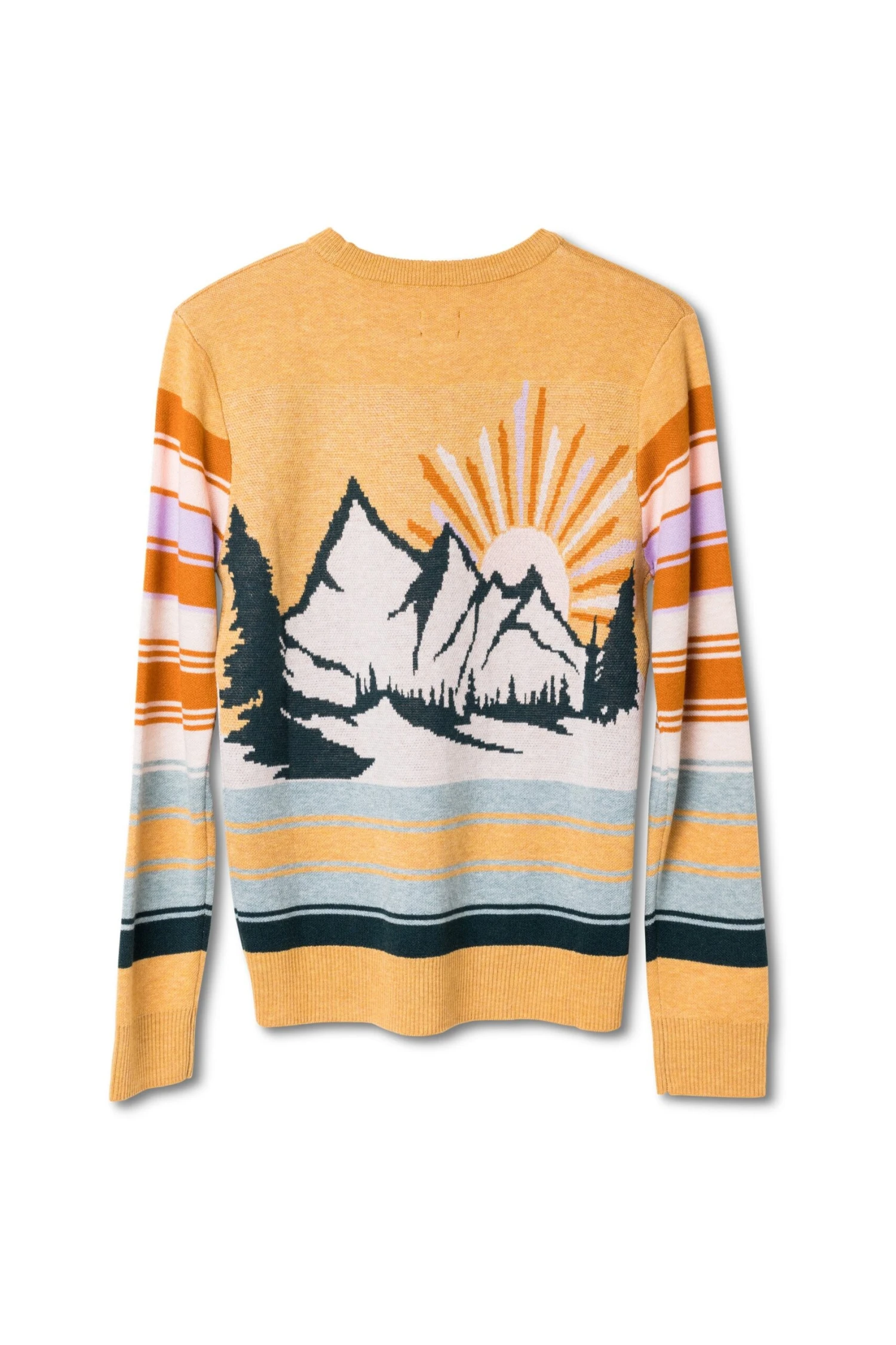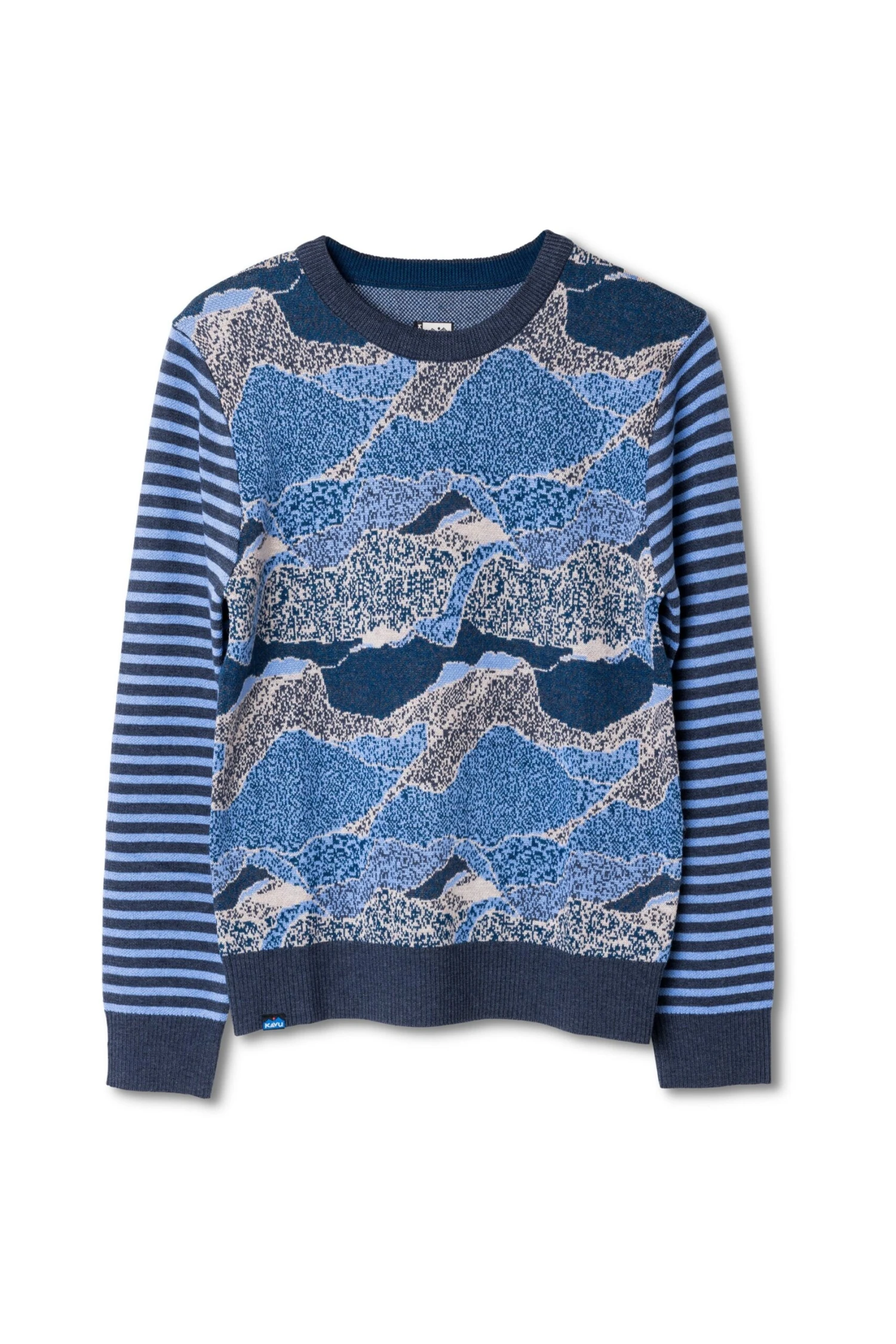 Semi-fitted, birdseye jacquard fully fashioned crew neck sweater, ribbed collar, cuffs, and hem, hip length.