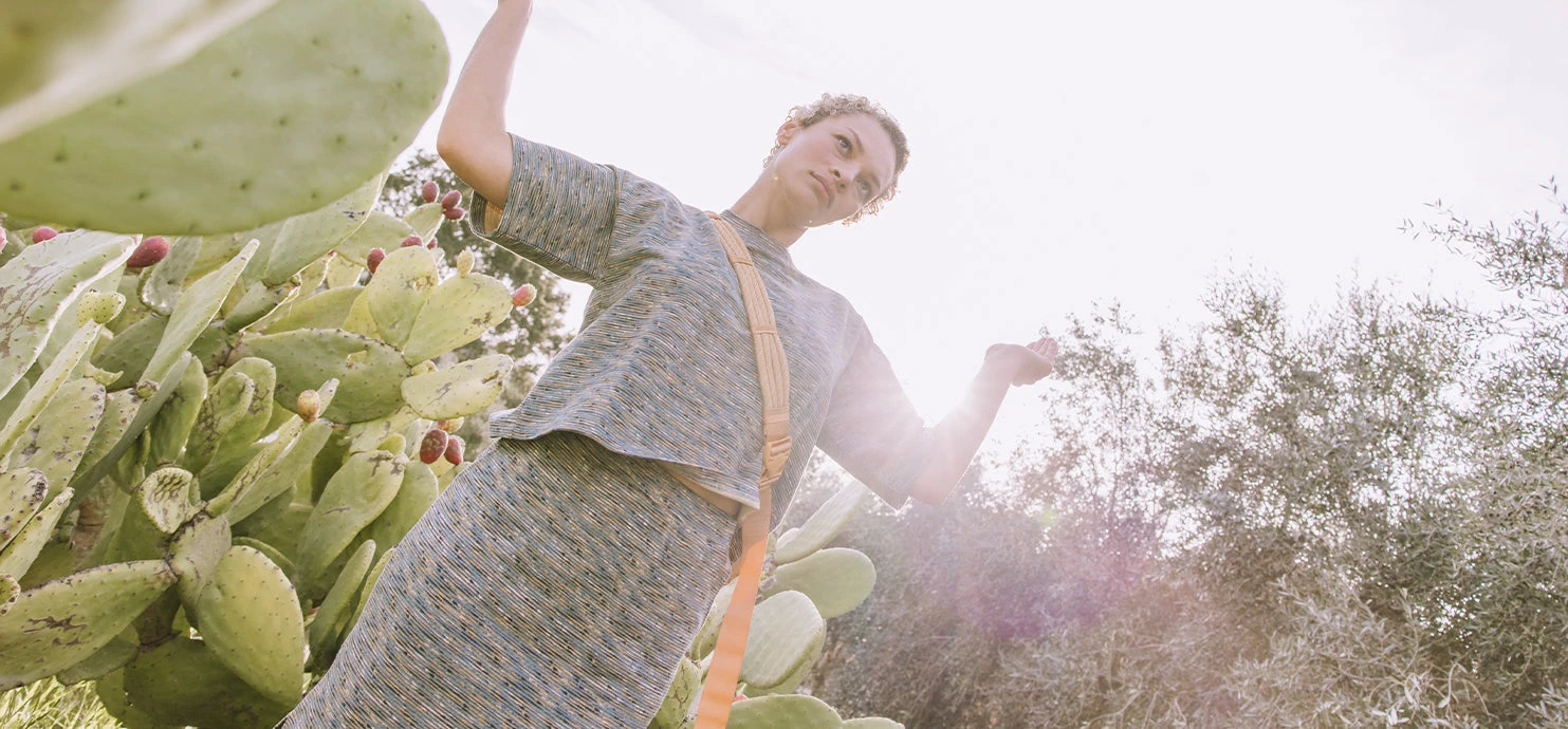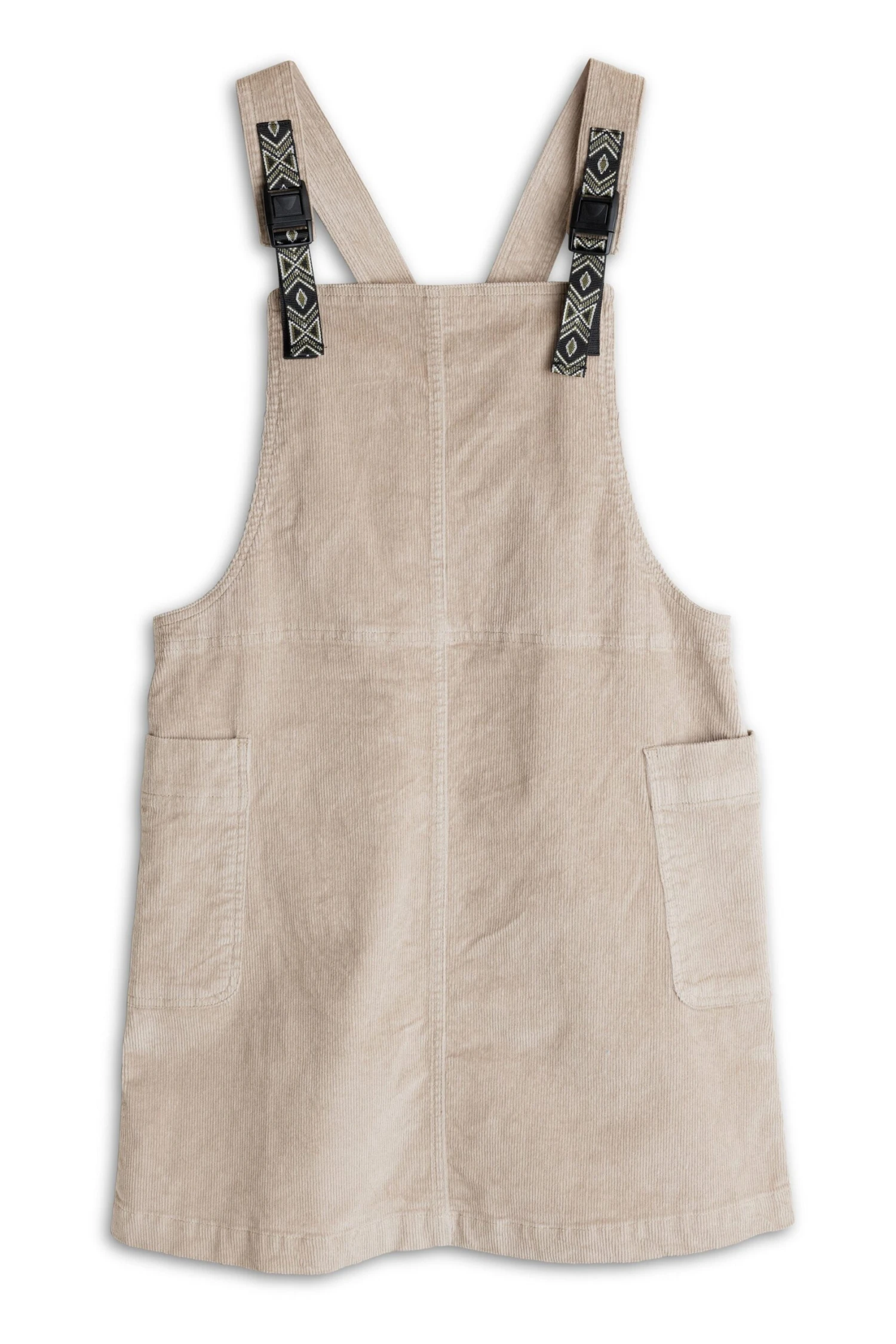 Relaxed fit jumper dress, adjustable webbing shoulder straps and buckle closure, two side patch pockets, length hits mid-thigh.