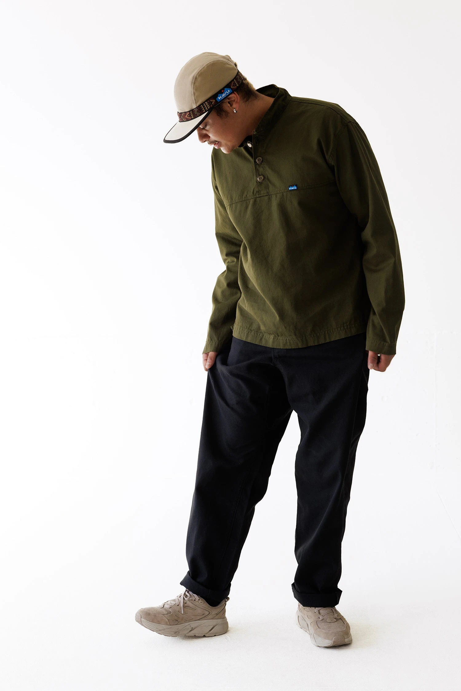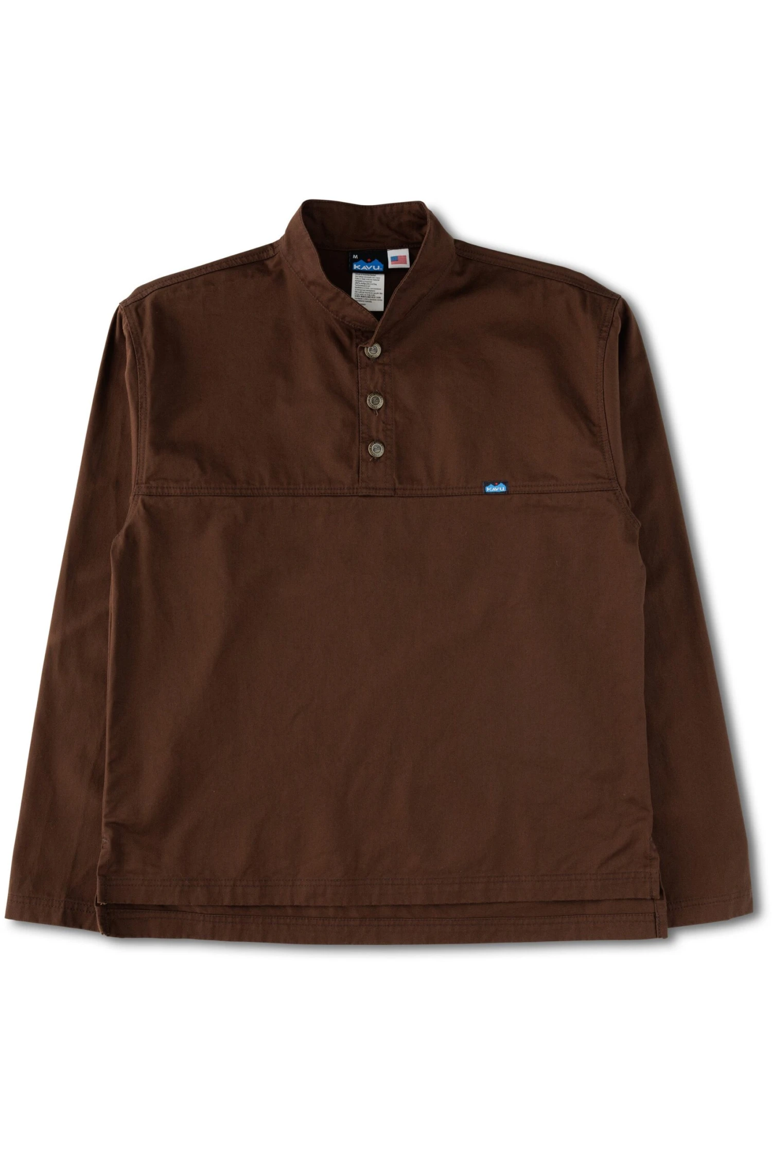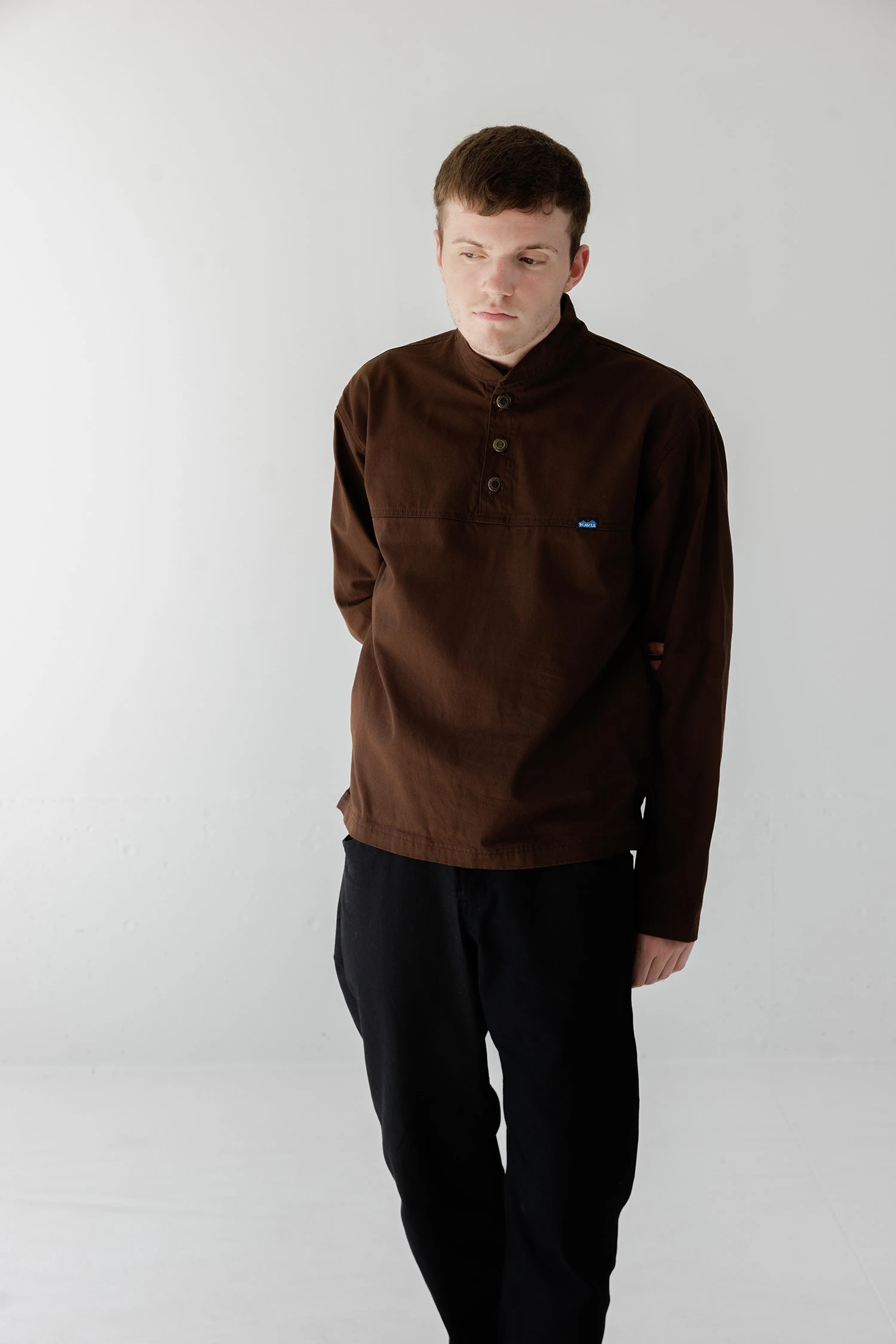 Casual fit, long sleeve popover shirt, mandarin collar, half placket with logo shank buttons, front chest yoke with logo label, high low hem with side vents, thick thread and double needle reinforced seams