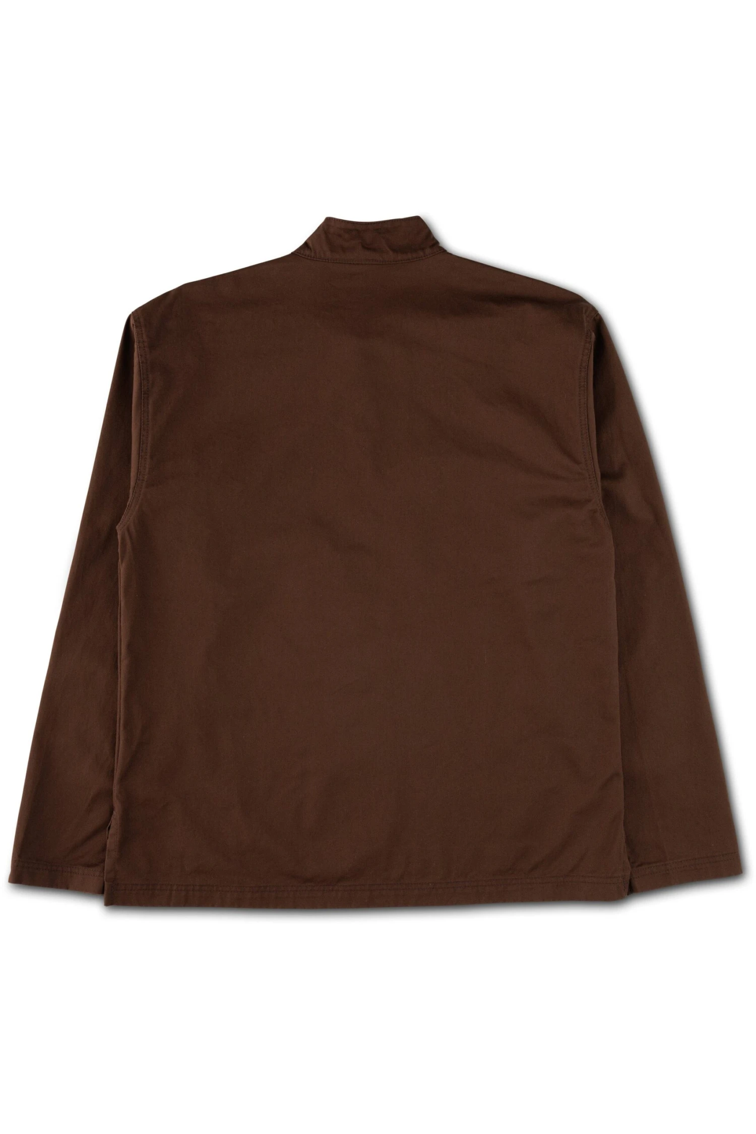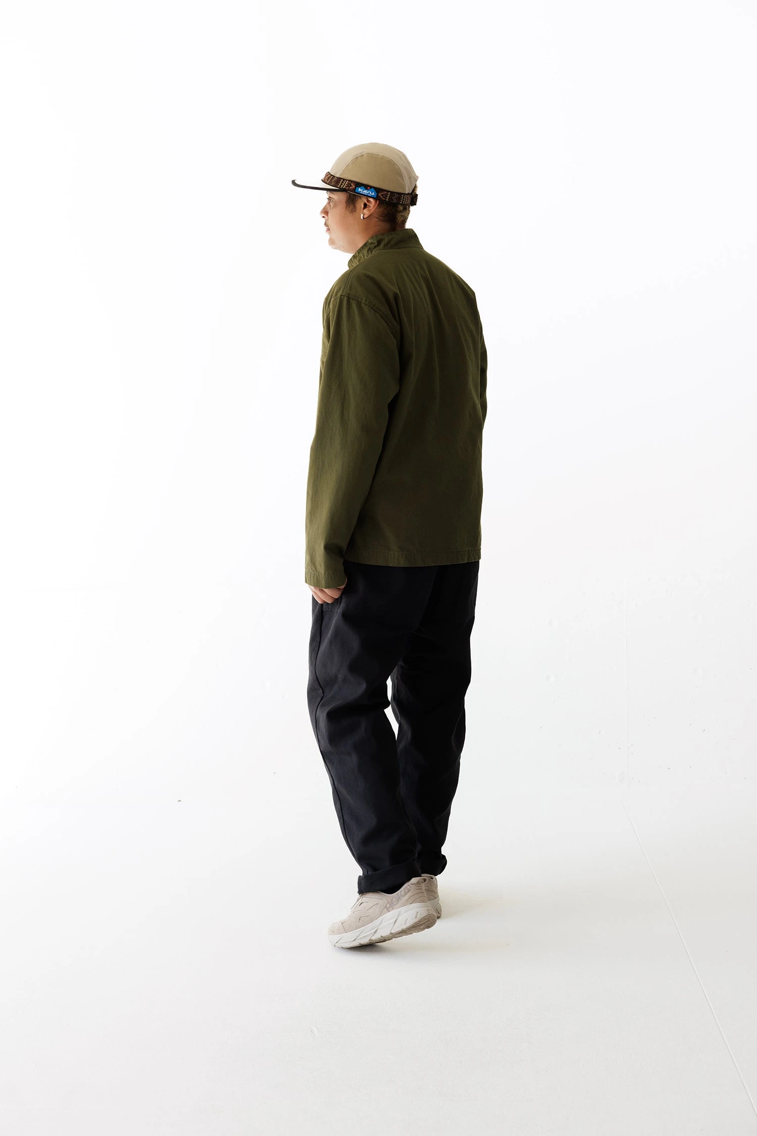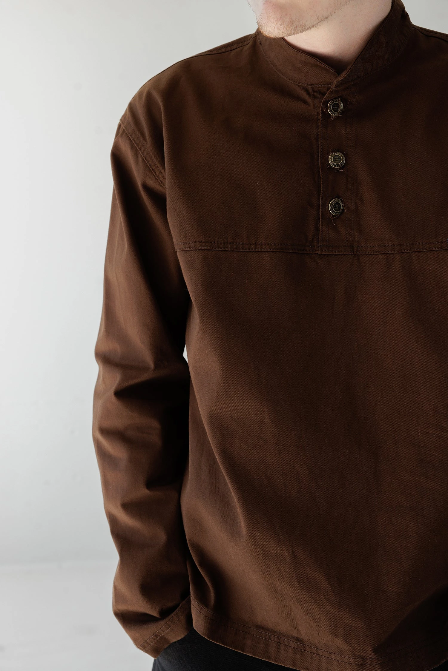 Casual fit, long sleeve popover shirt, mandarin collar, half placket with logo shank buttons, front chest yoke with logo label, high low hem with side vents, thick thread and double needle reinforced seams