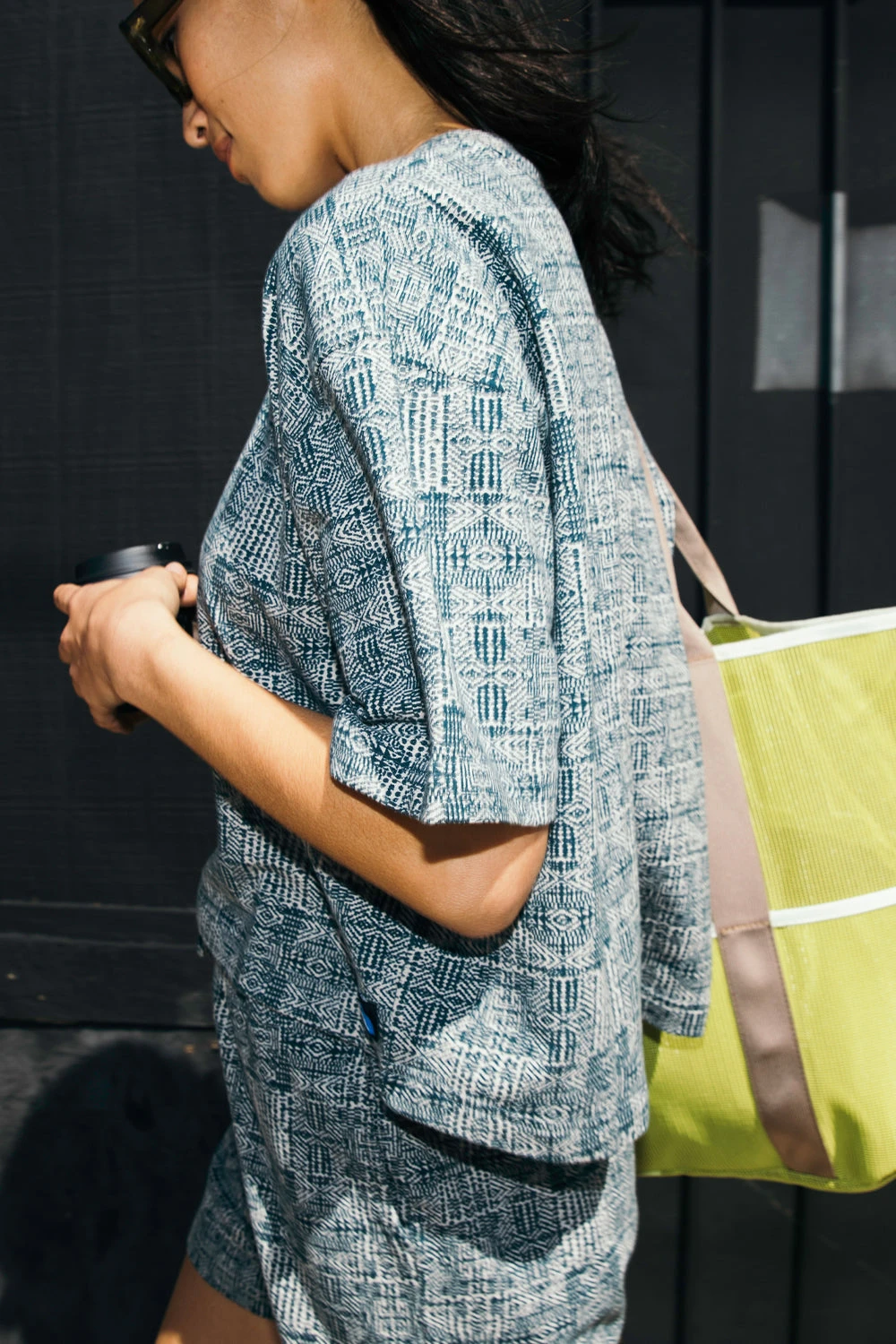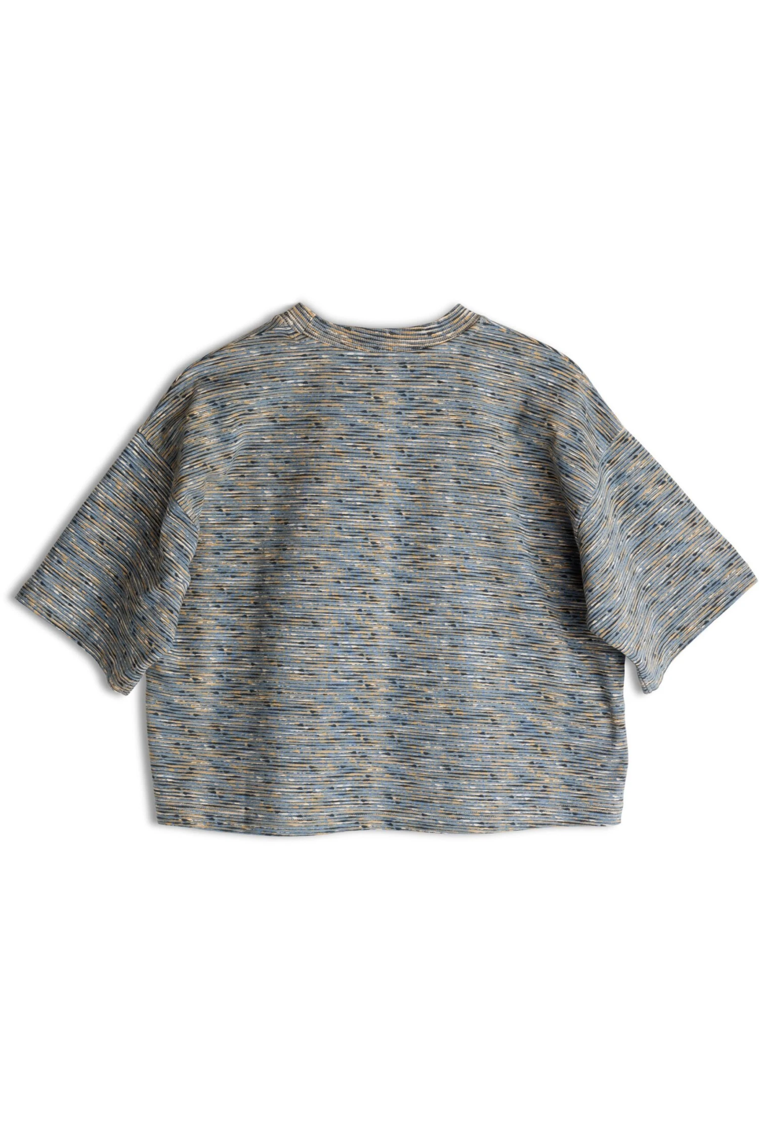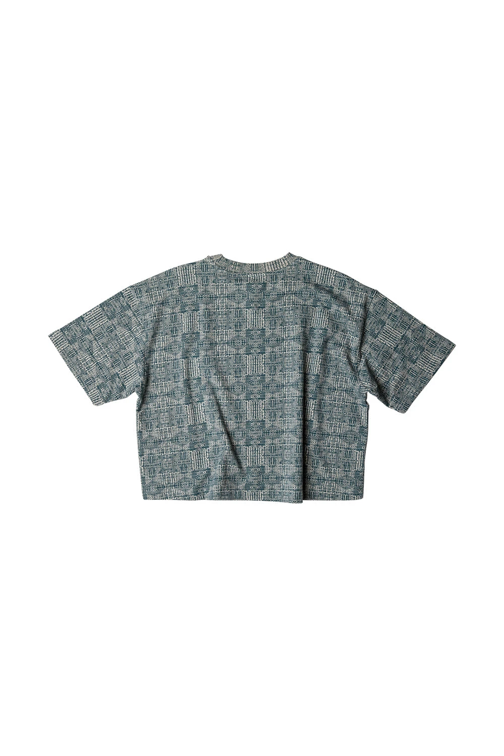 Relaxed fit, short sleeve cropped top, ribbed knit crew neckline, drop shoulder silhouette, straight hem, heat transfer back neck label.