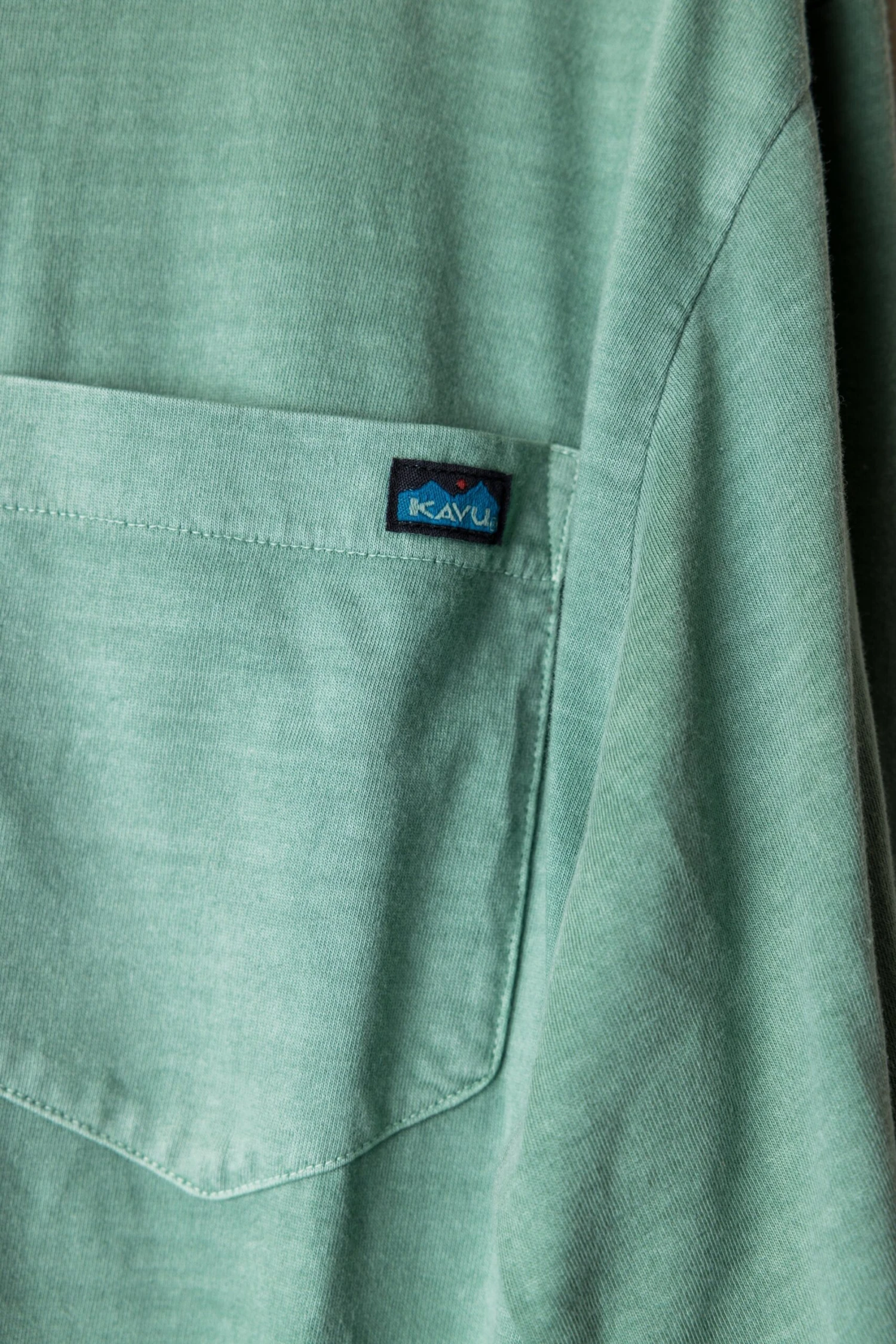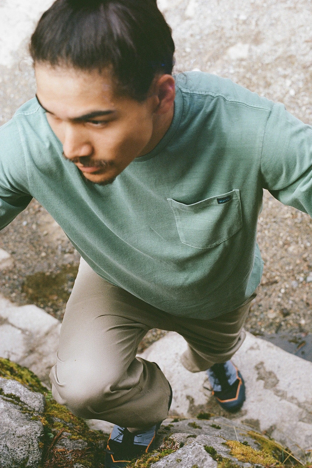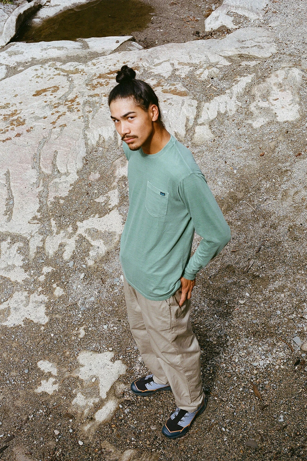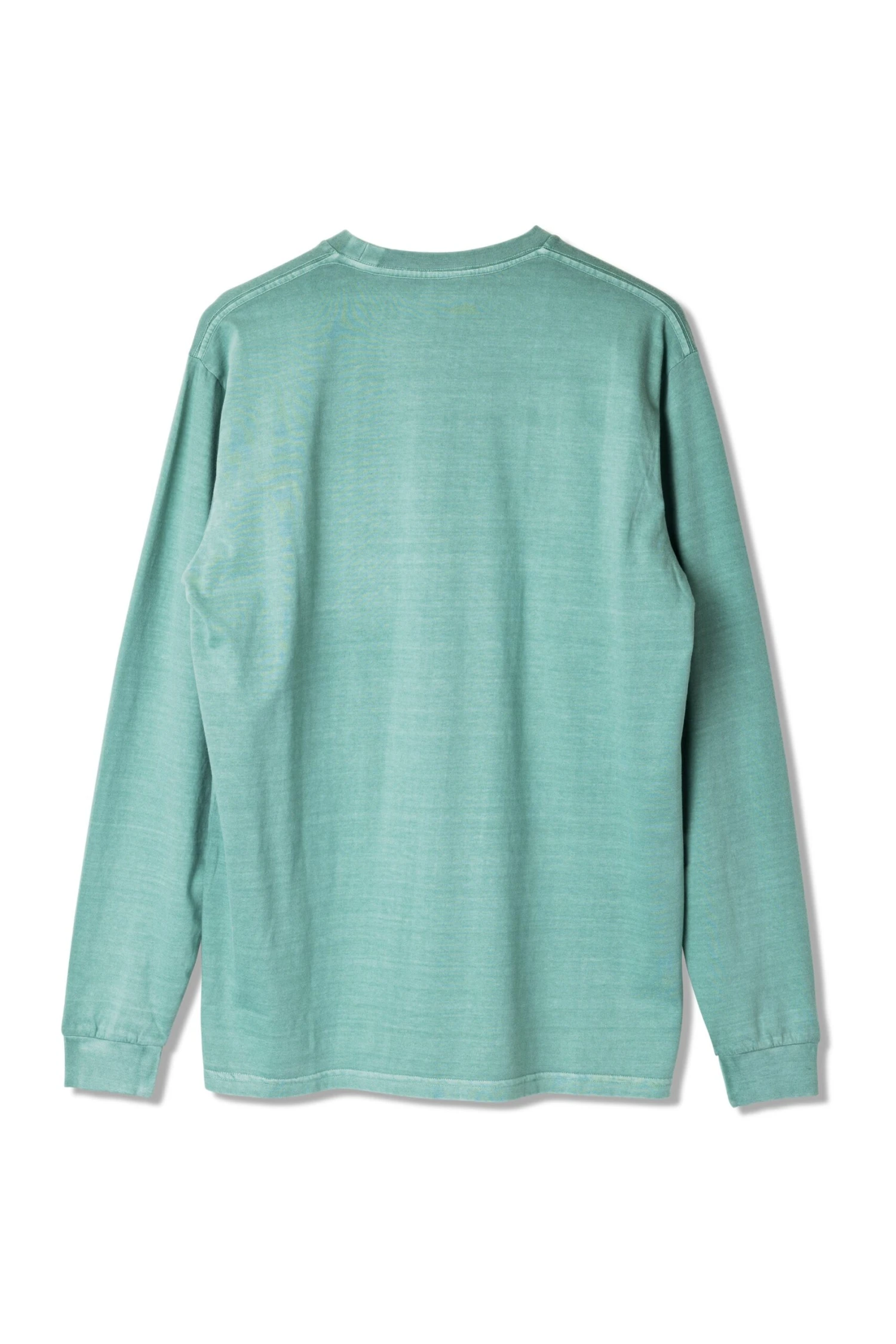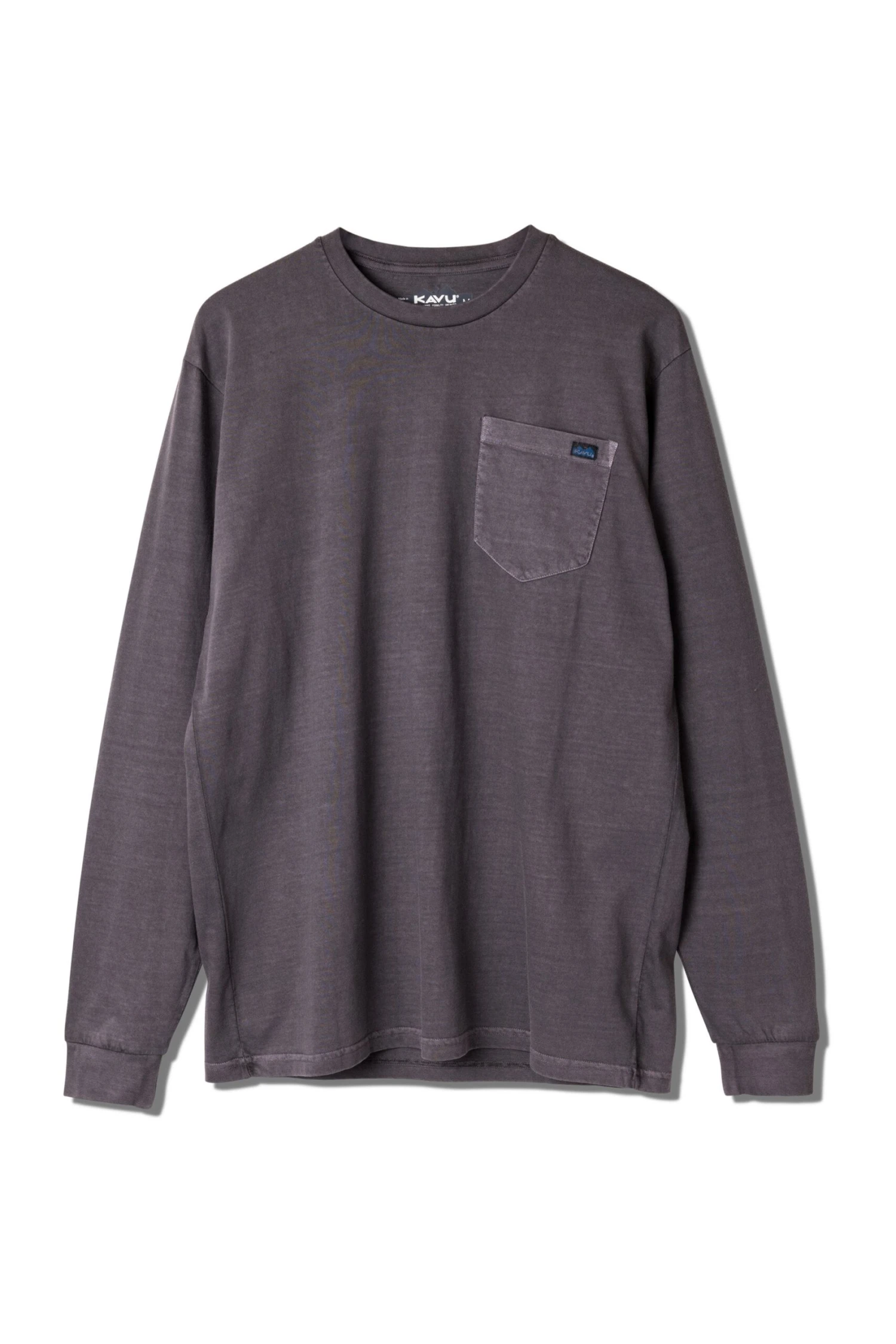 Casual fit, long sleeve crew neck t-shirt, chest pocket, heat transfer back neck label.