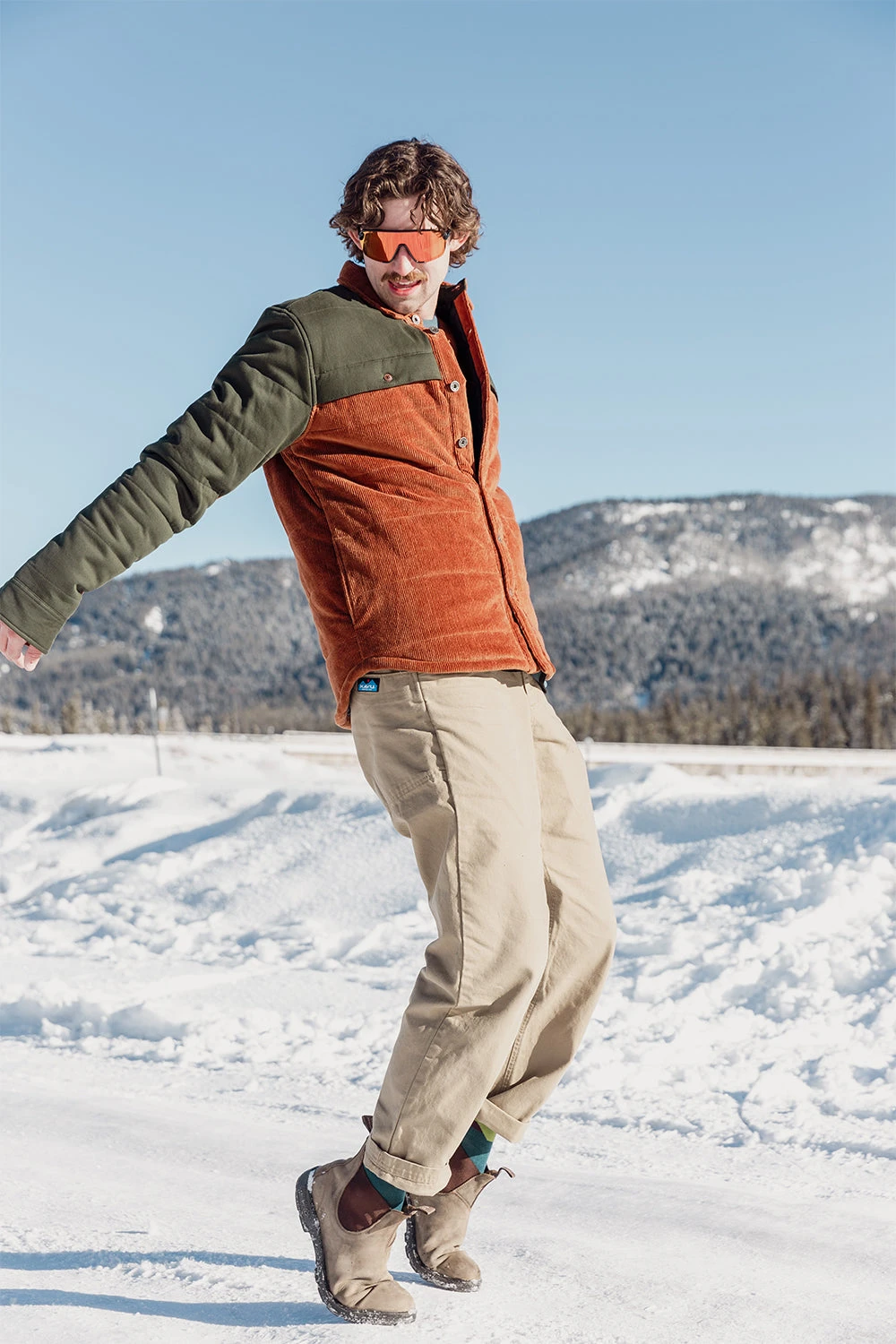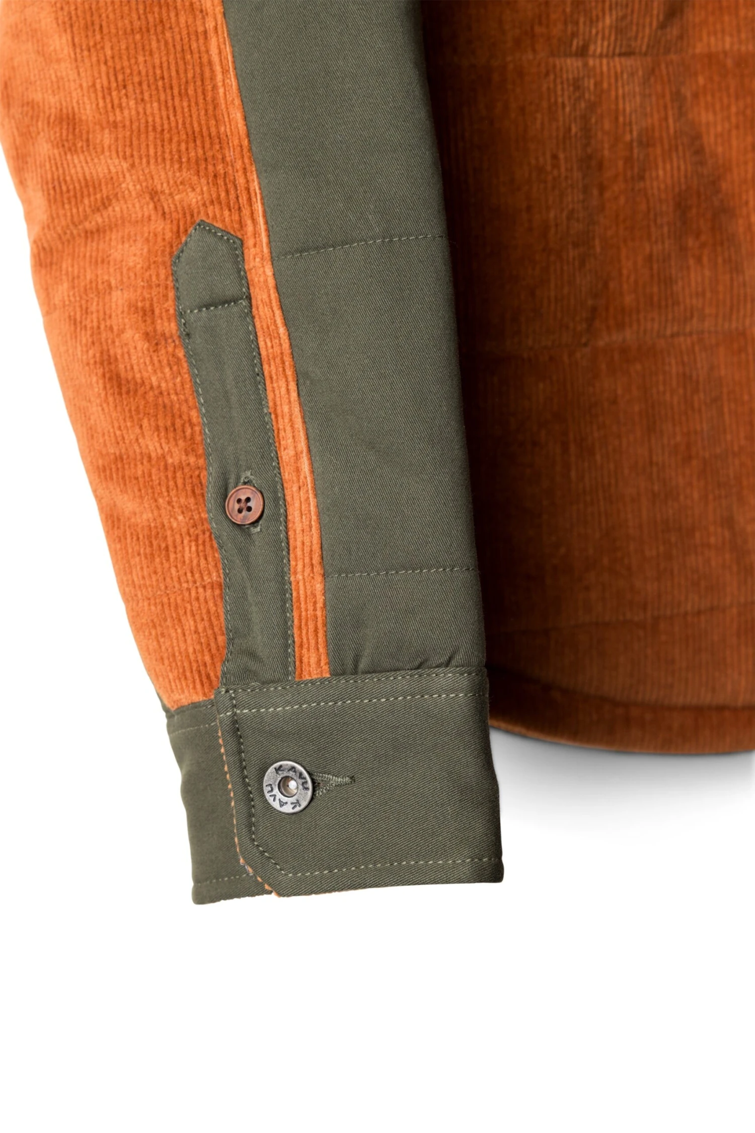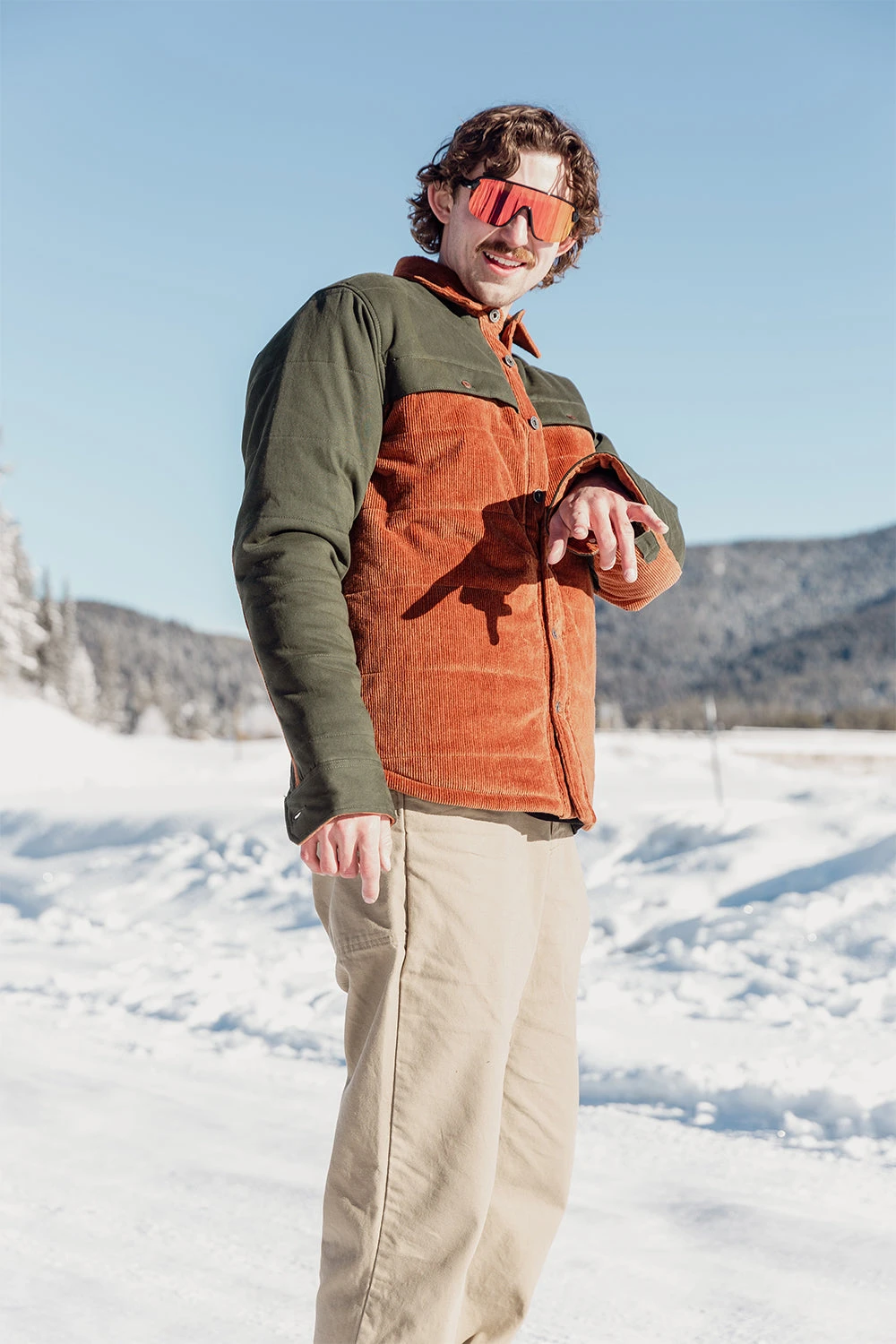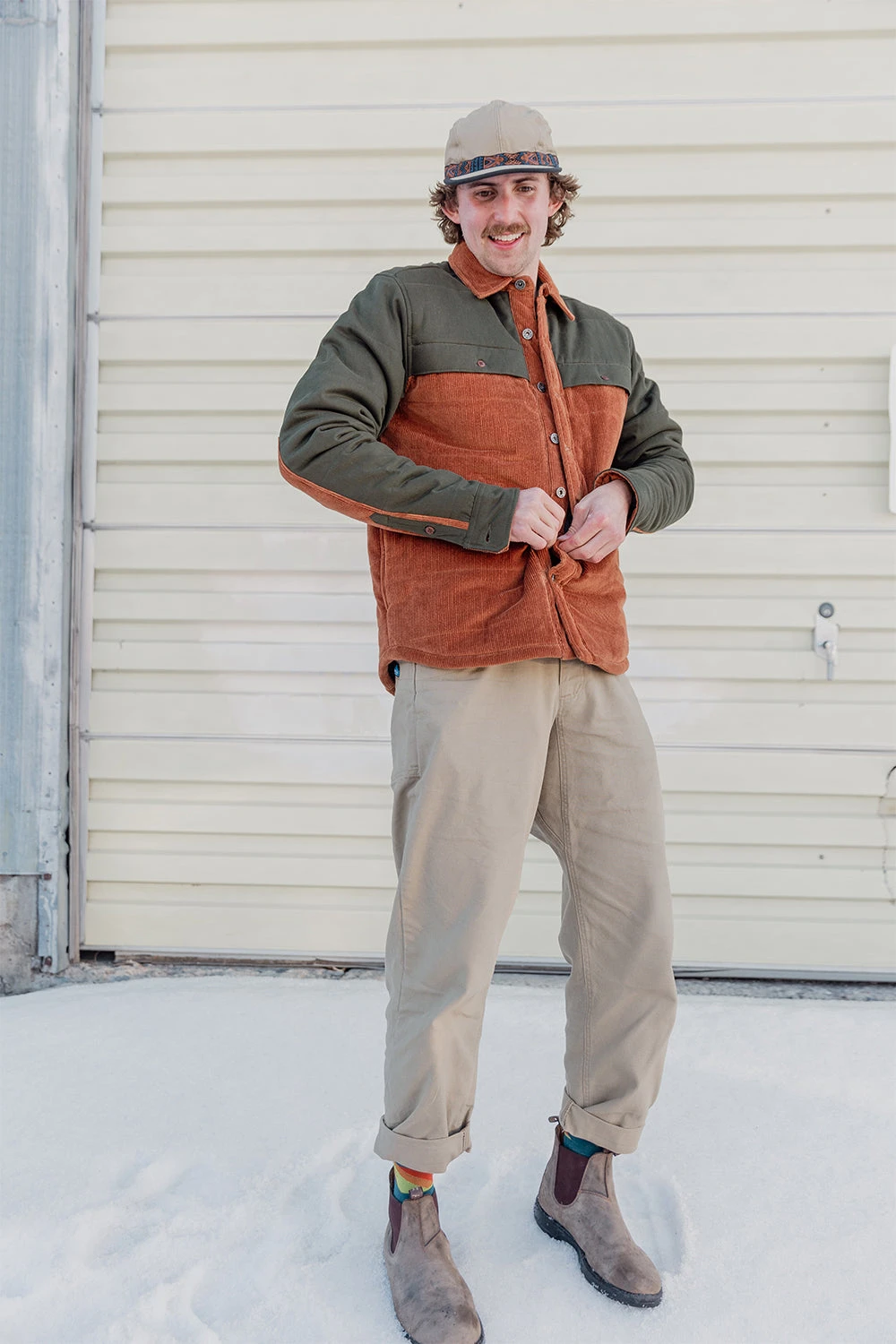When we’re in the other favorite “Rainy City” we want to do three things; sample the latest hoppy batch at Track Brewing Company, snag a curry at Yadgar Cafe, and look good. This long sleeve insulated shirt jacket has horizontal baffles, elbow patch, and constructed of clever 9 wale stretch corduroy.