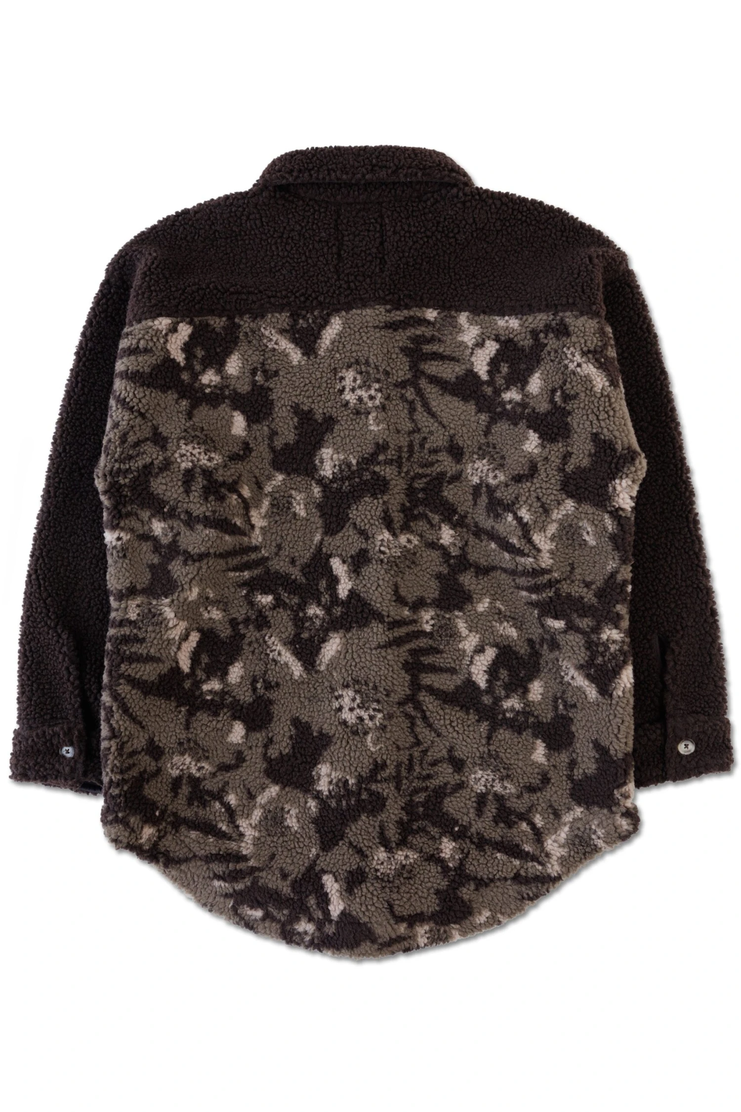 Relaxed fit, long sleeve button up fleece shirt jacket, stand collar with button closure, two chest flap pockets, single welt hand pockets, adjustable cuffs, back yoke, deep curved hem.