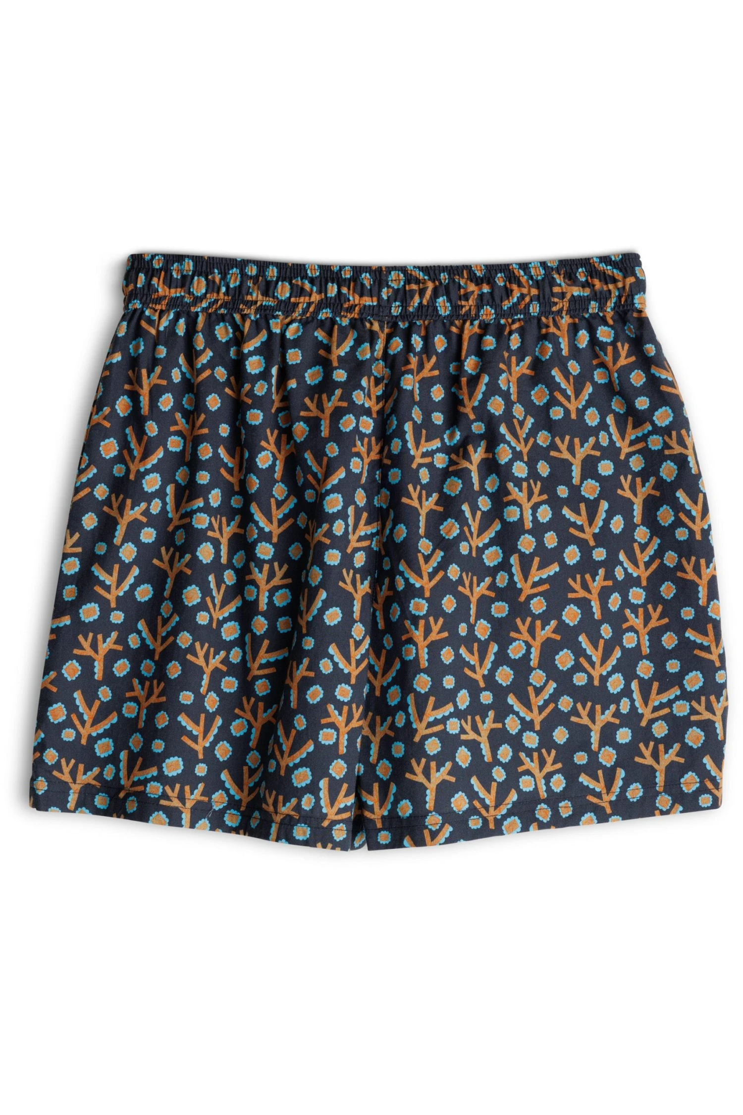 Relaxed fit mid-rise short, elastic waistband with drawstring, front pockets.