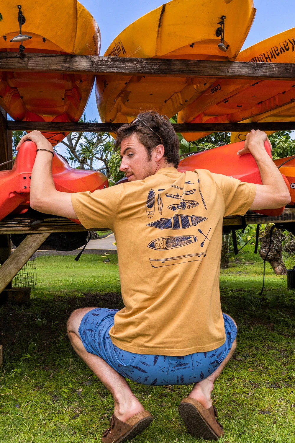 KAVU days and quality time on the water go hand in hand. Our design crew created this 100% hypoallergenic certified organic tee to show some of our favorite H2O toys including a canoe, an open water SUP board, an ocean kayak, fresh water SUP board, and river kayak.