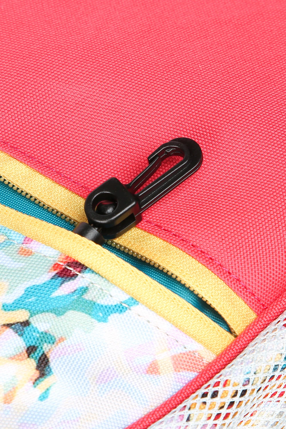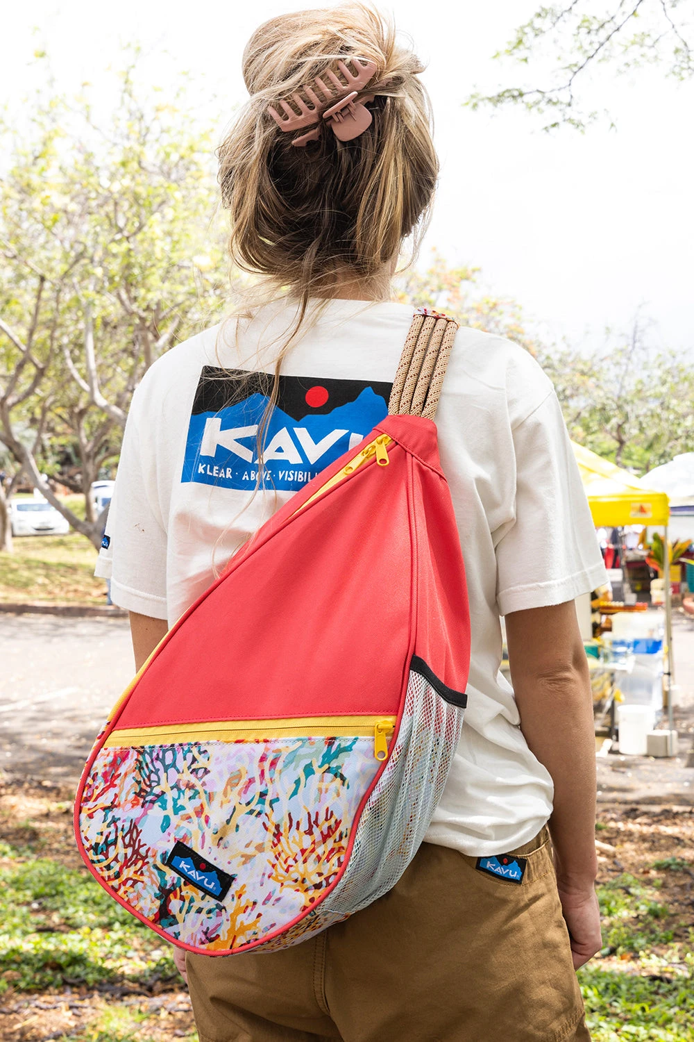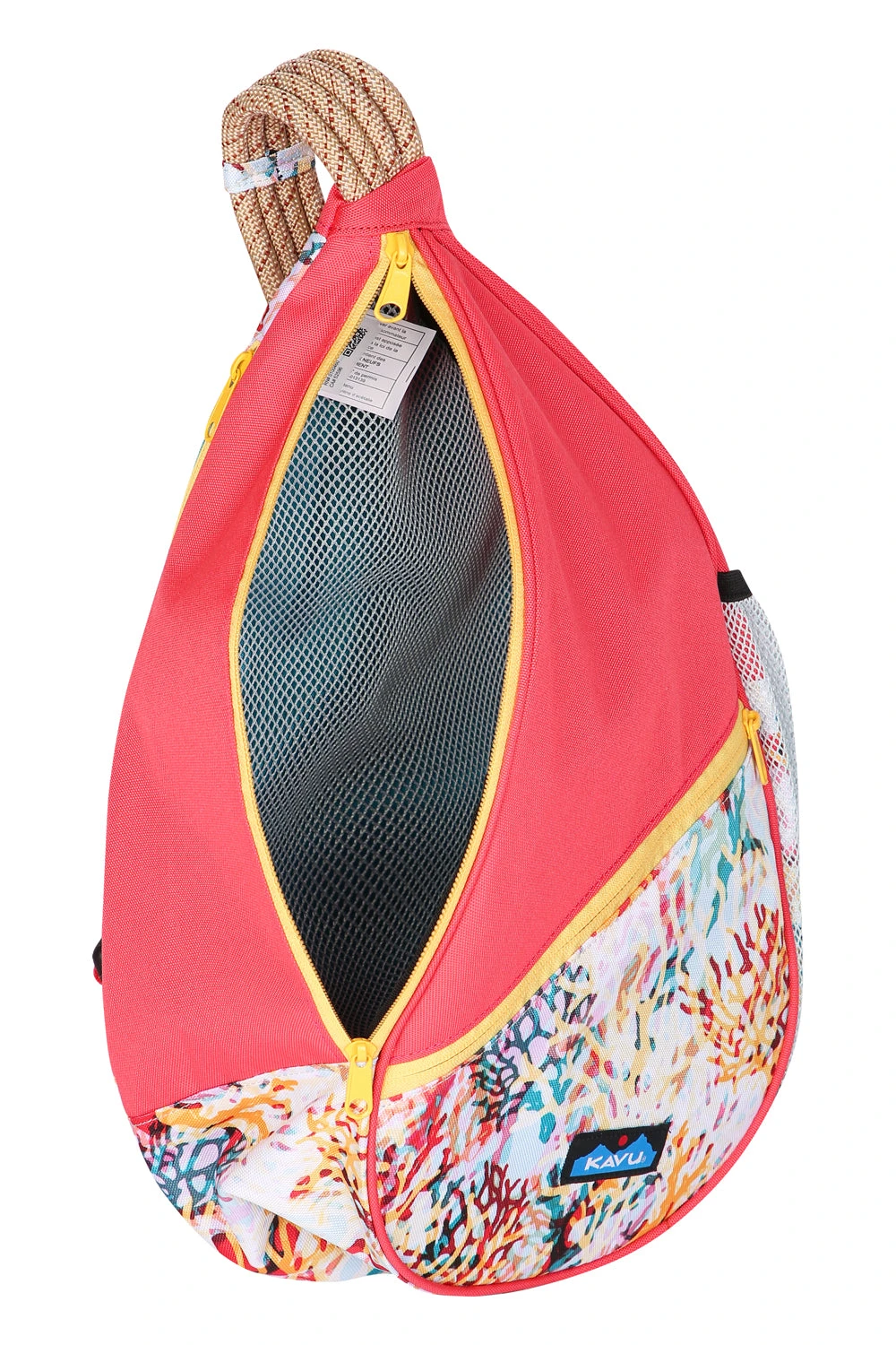 Adjustable rope shoulder strap and side release buckle, main compartment with zip closure, exterior mesh pocket, external and internal zip pockets, key clip and padded back with KAVU embroidery.