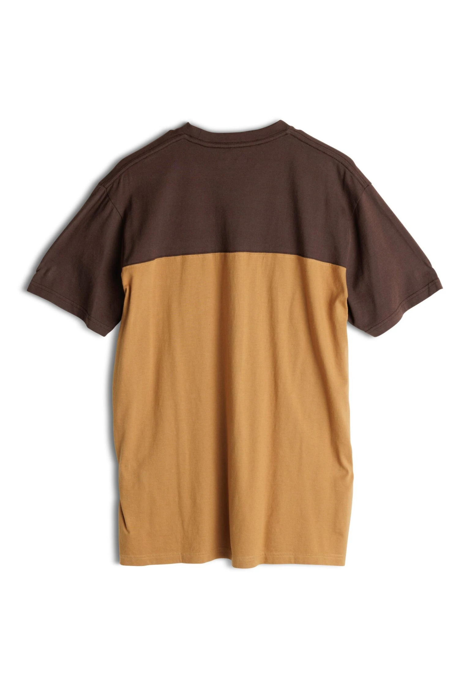 Casual fit, short sleeve crew neck color blocked t-shirt, front and back yoke seam styling, chest pocket, heat transfer back neck label.