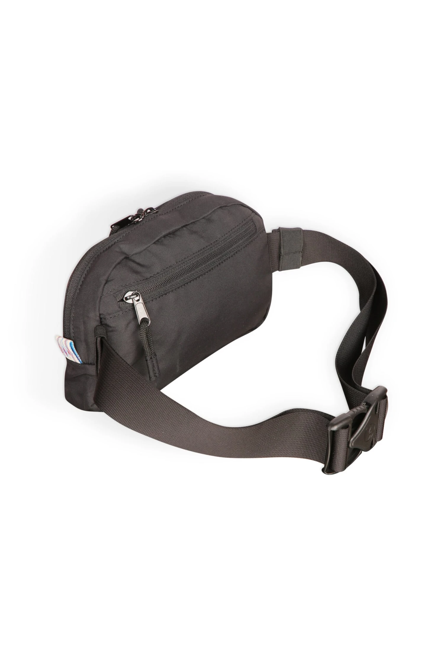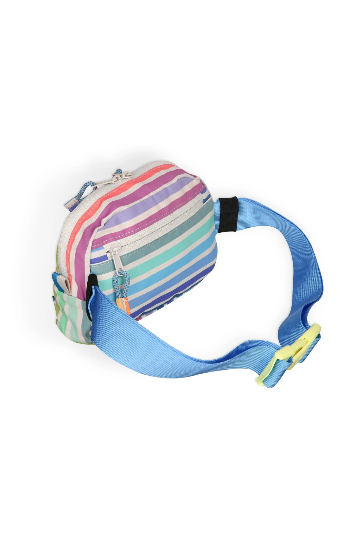 Packable belt / sling bag with adjustable straps and side release buckle, elastic webbing keeper at strap ends, pattern webbing loop tab on side, main compartment with two-way zip closure, back zip pocket which also acts as packing pocket, internal key fob clip, rope loop zip pulls.