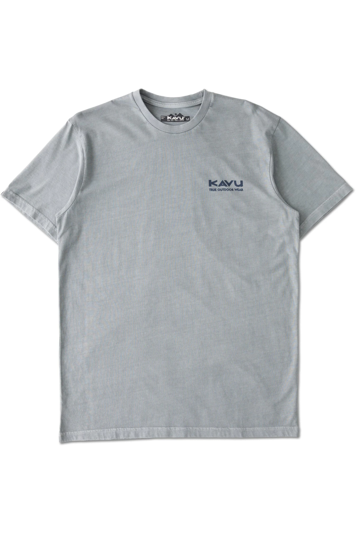 Casual fit, short sleeve t-shirt, ribbed stretch knit crew neckline, small screen print on front left chest, main screen print on center back, heat transfer back neck label