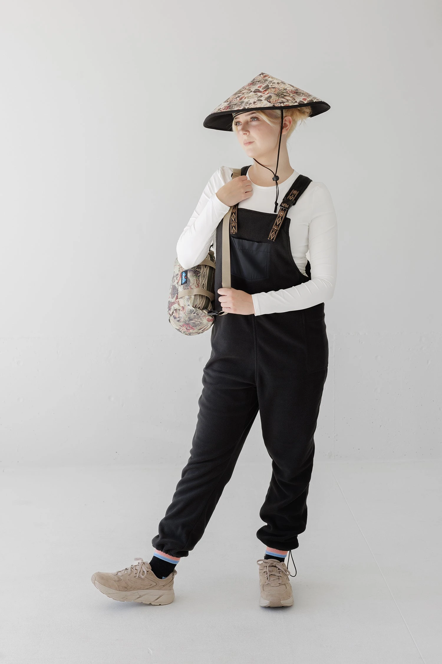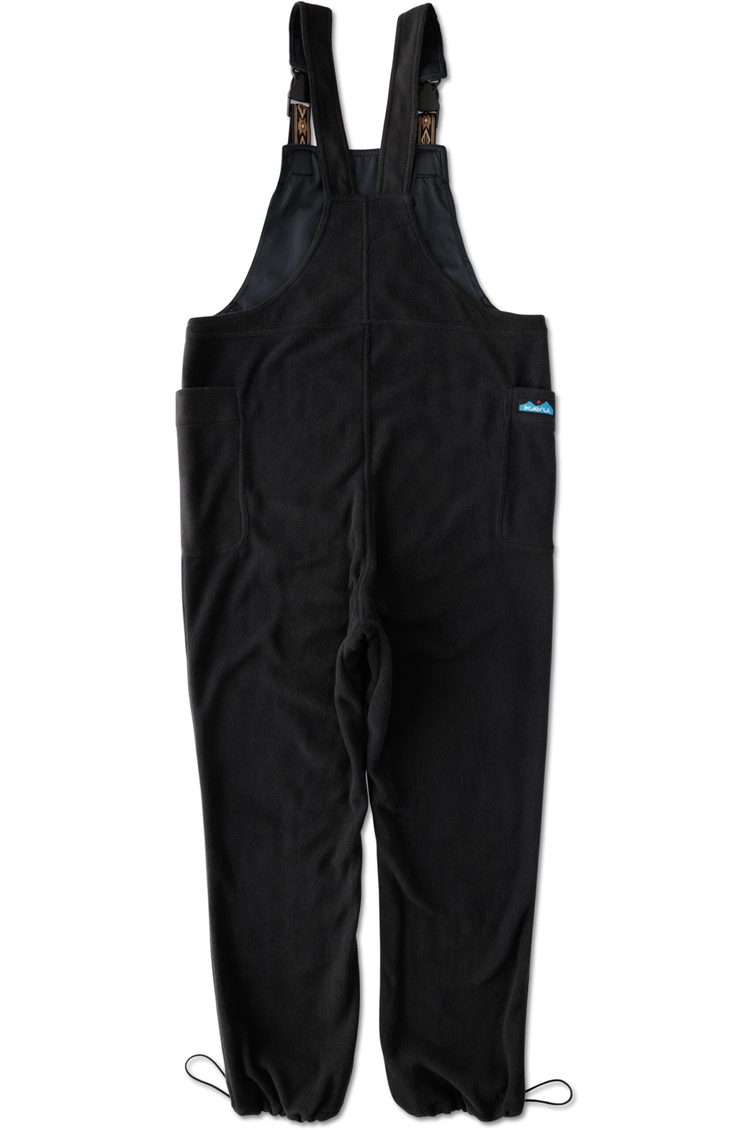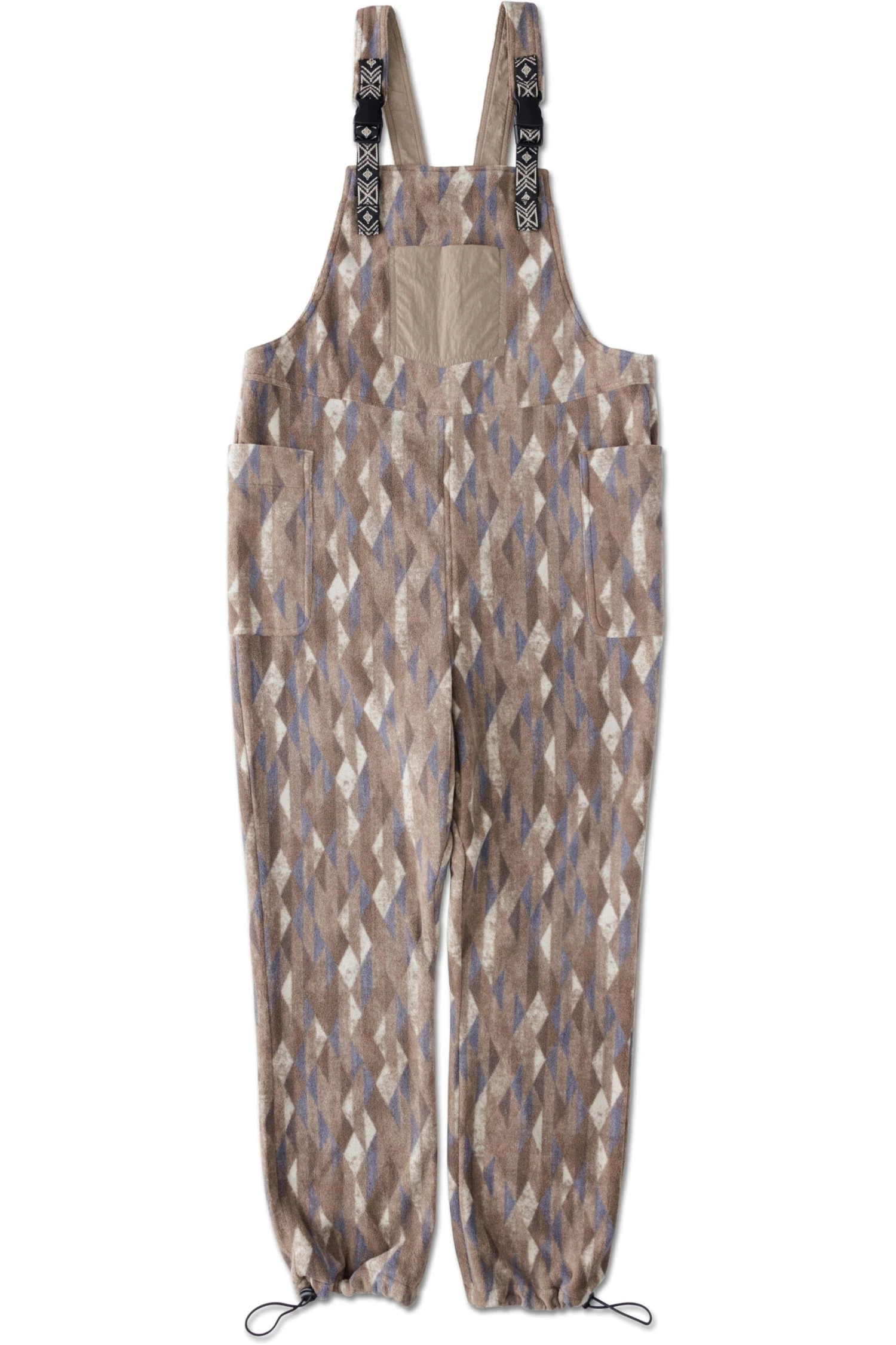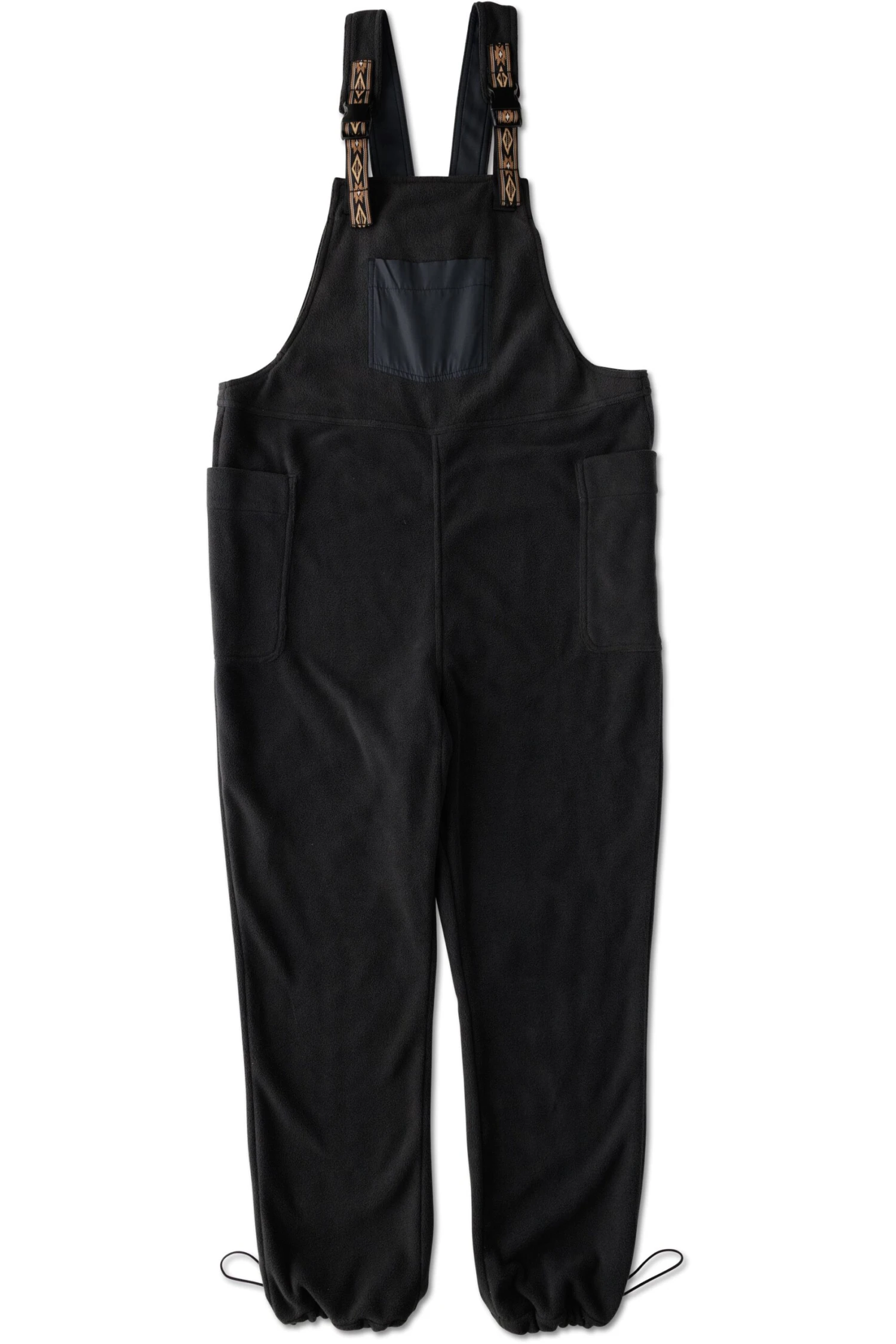 Relaxed fit overall with adjustable webbing shoulder straps and buckle closure, patch pocket with hidden pass thru pocket on bib, two side patch pockets, bungee cord with cord lock at hem cuffs.
