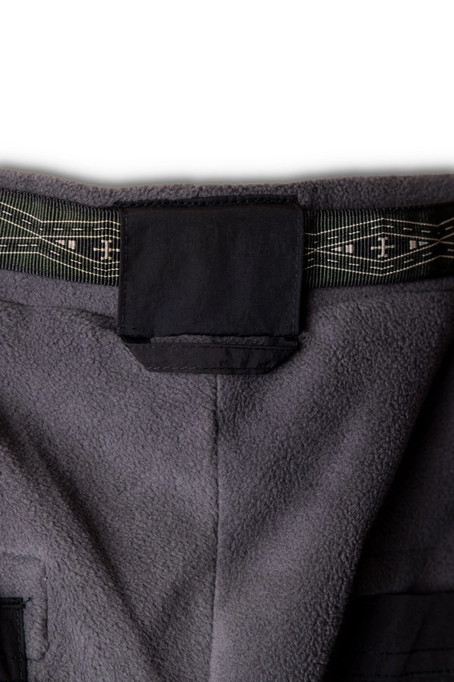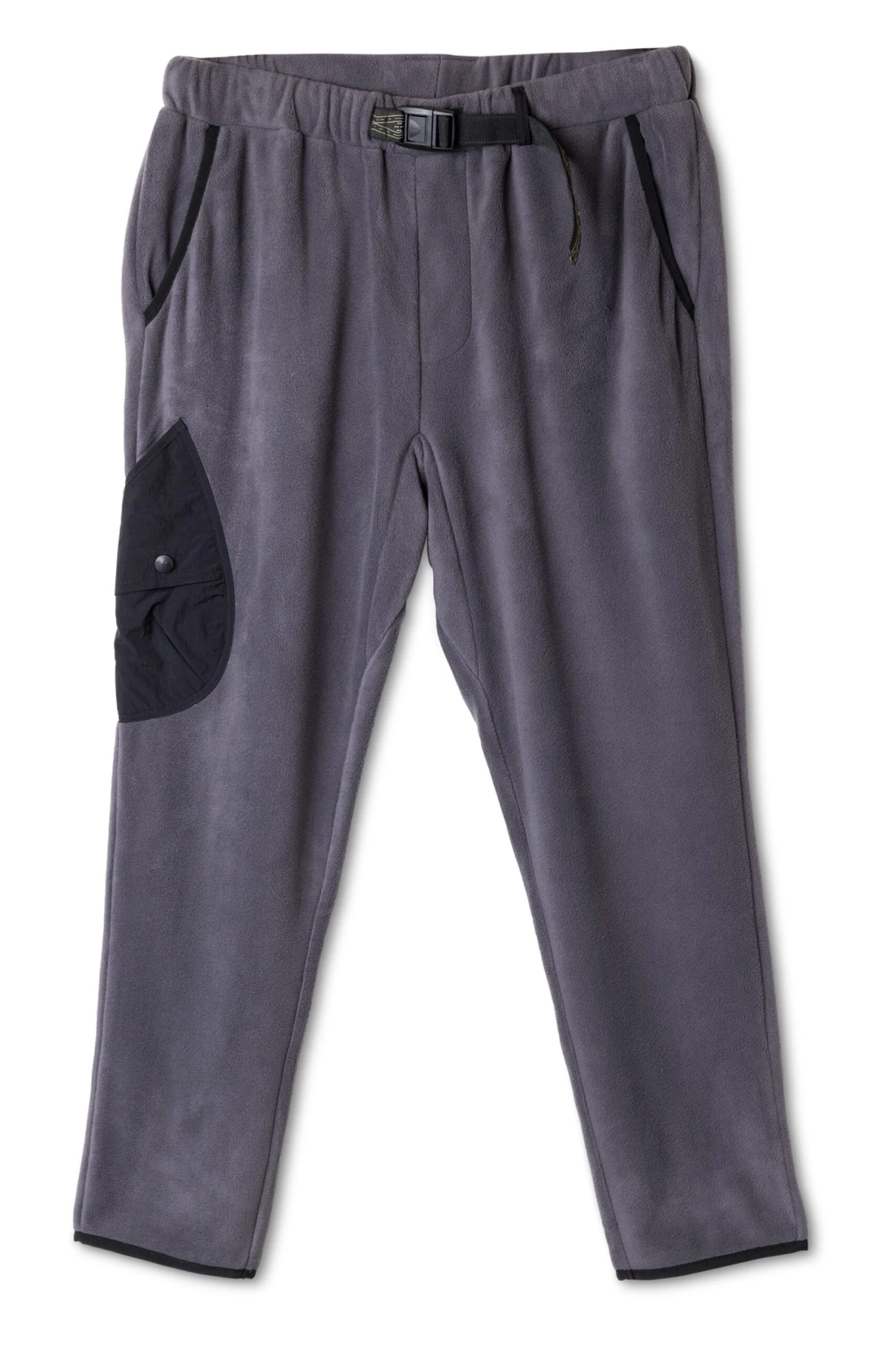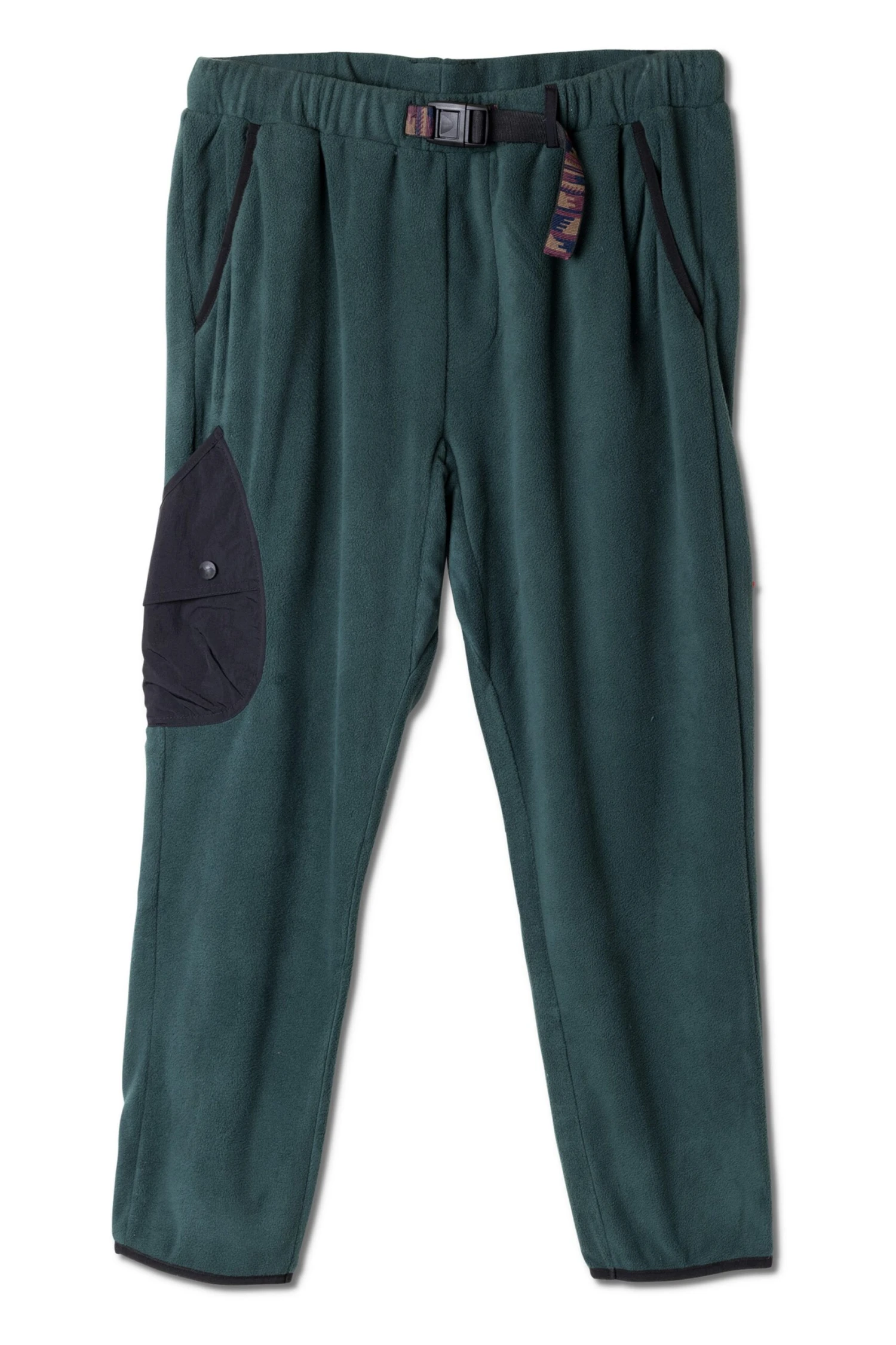 Relaxed fit, elastic waist pant with built-in patterned webbing belt and YKK center release buckle, center locker loop at center back belt loop, faux fly, gusset, jersey lined front hand pockets with elastic binding detail, hemmed to the outside with articulated darts at back woven patch pockets, single cargo pocket with top entry opening, second cargo opening with flap at center with snap closure, elastic binding on hem.
