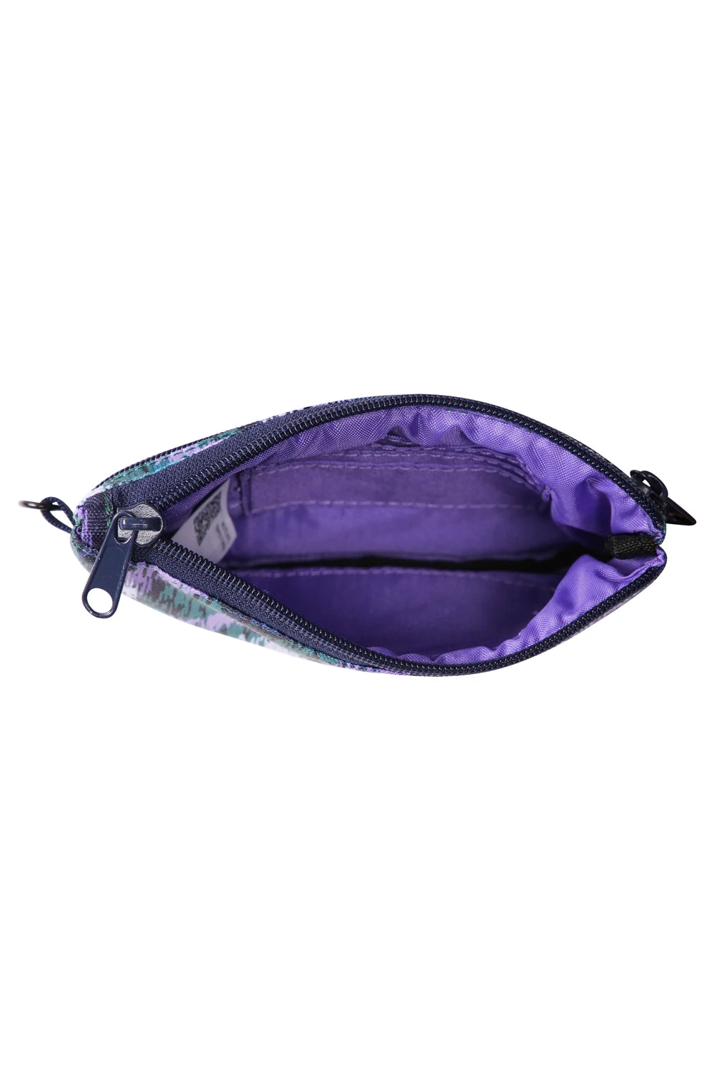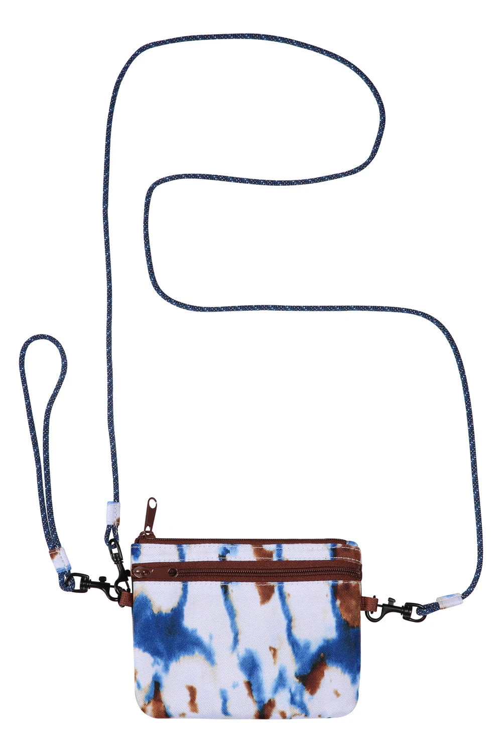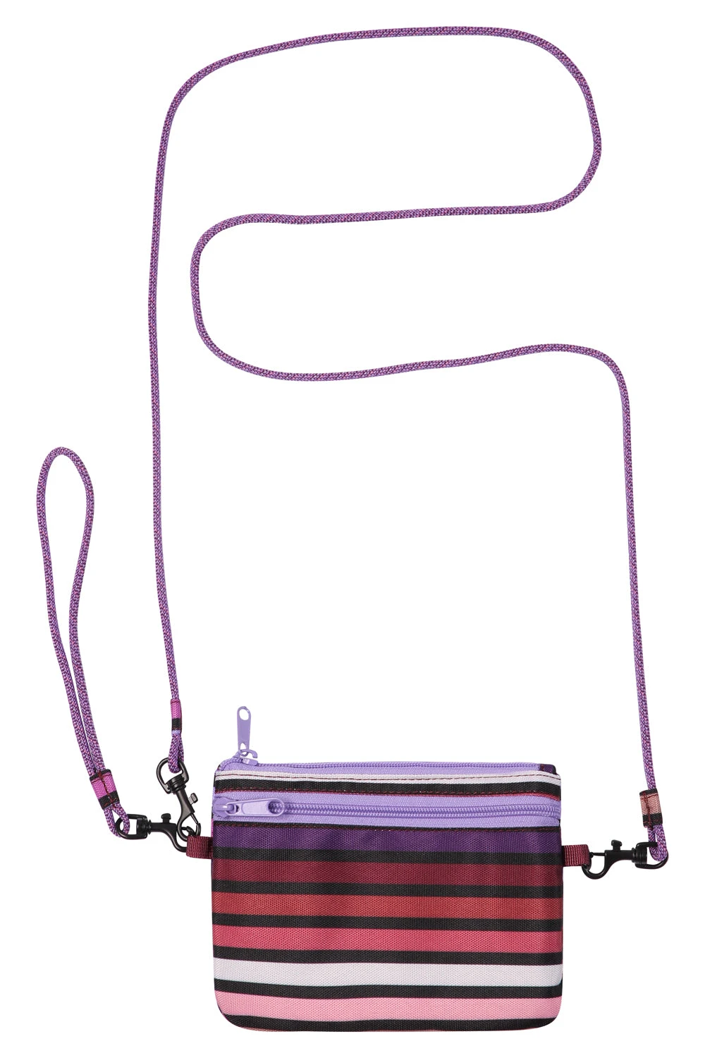 Cross body wallet, fixed rope wrist and shoulder strap that can detach with metal spring hook hardware, main compartment with zip closure and multiple cash and card slots, back exterior zip pocket.