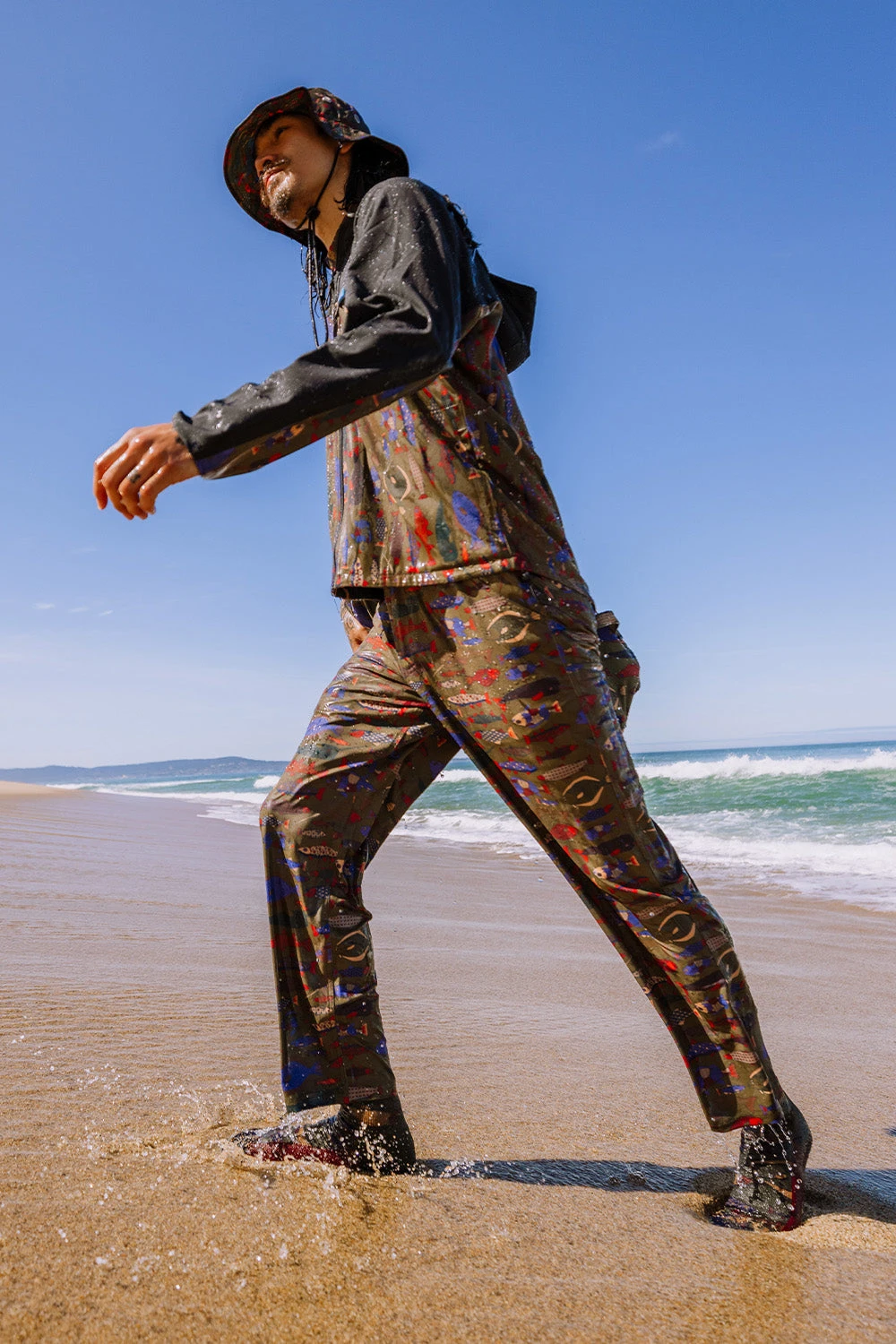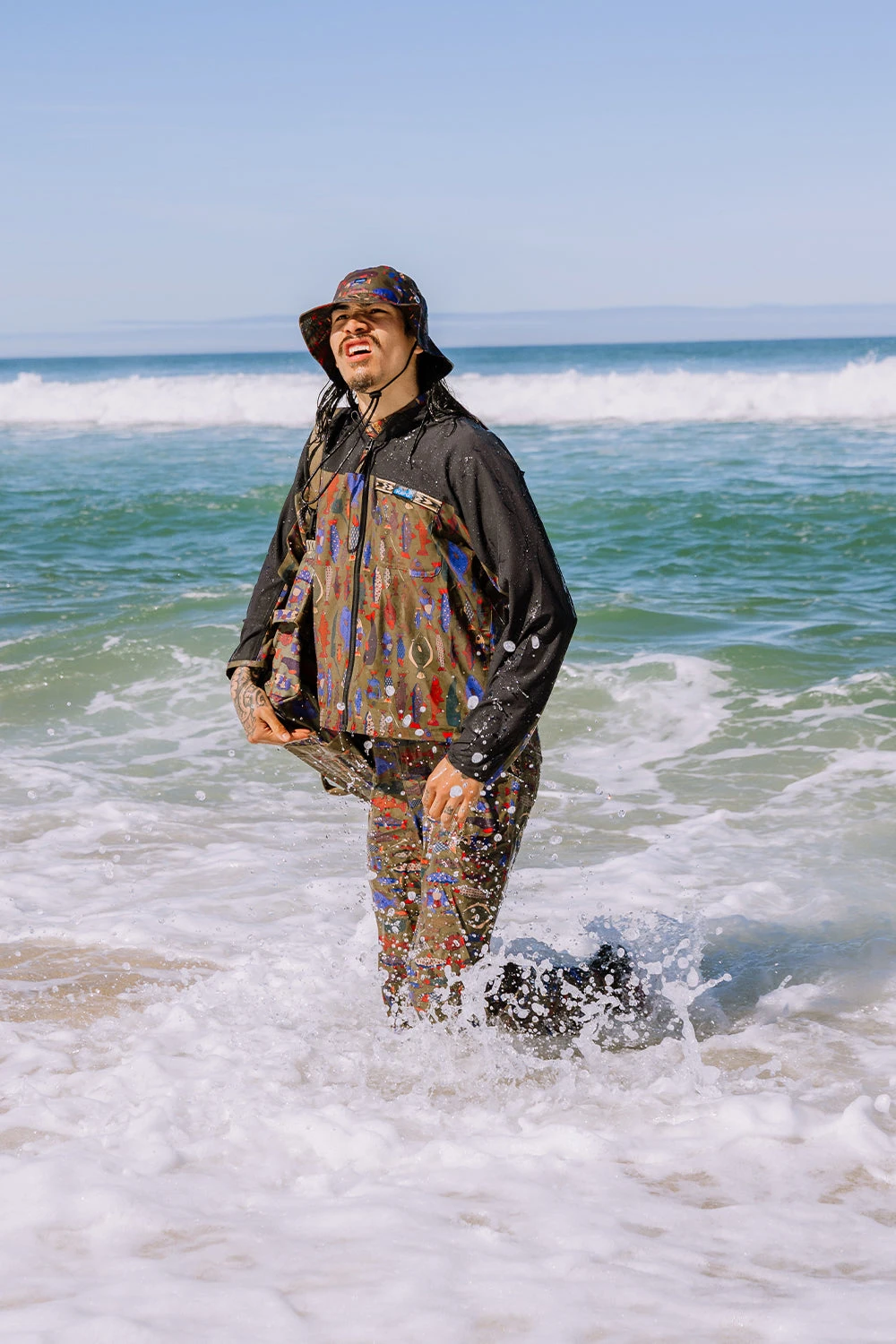 Fabric: 5oz 92% polyester 8% spandex 2-way stretch woven – UPF 50+, quick dry – color blocked and digital printed.