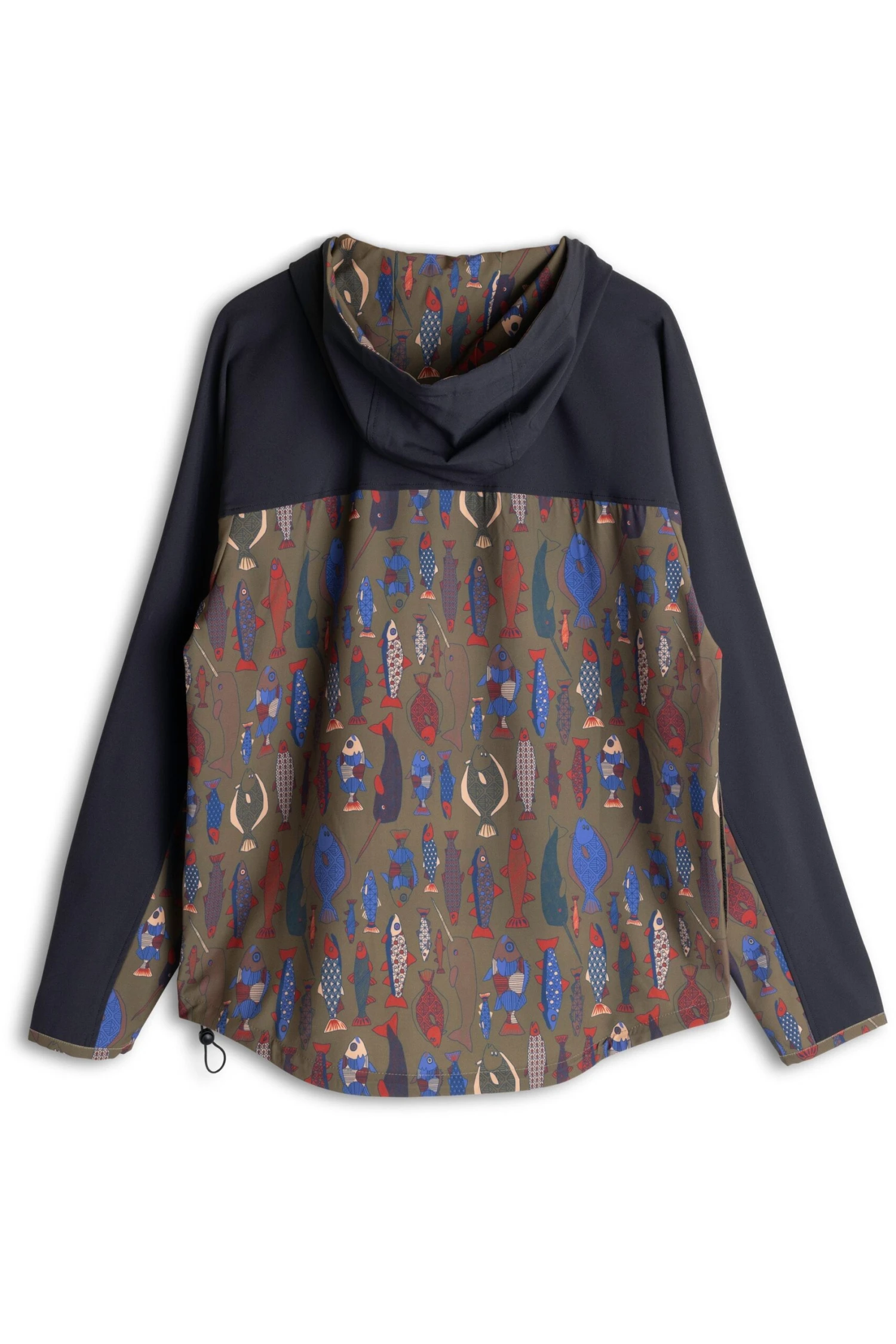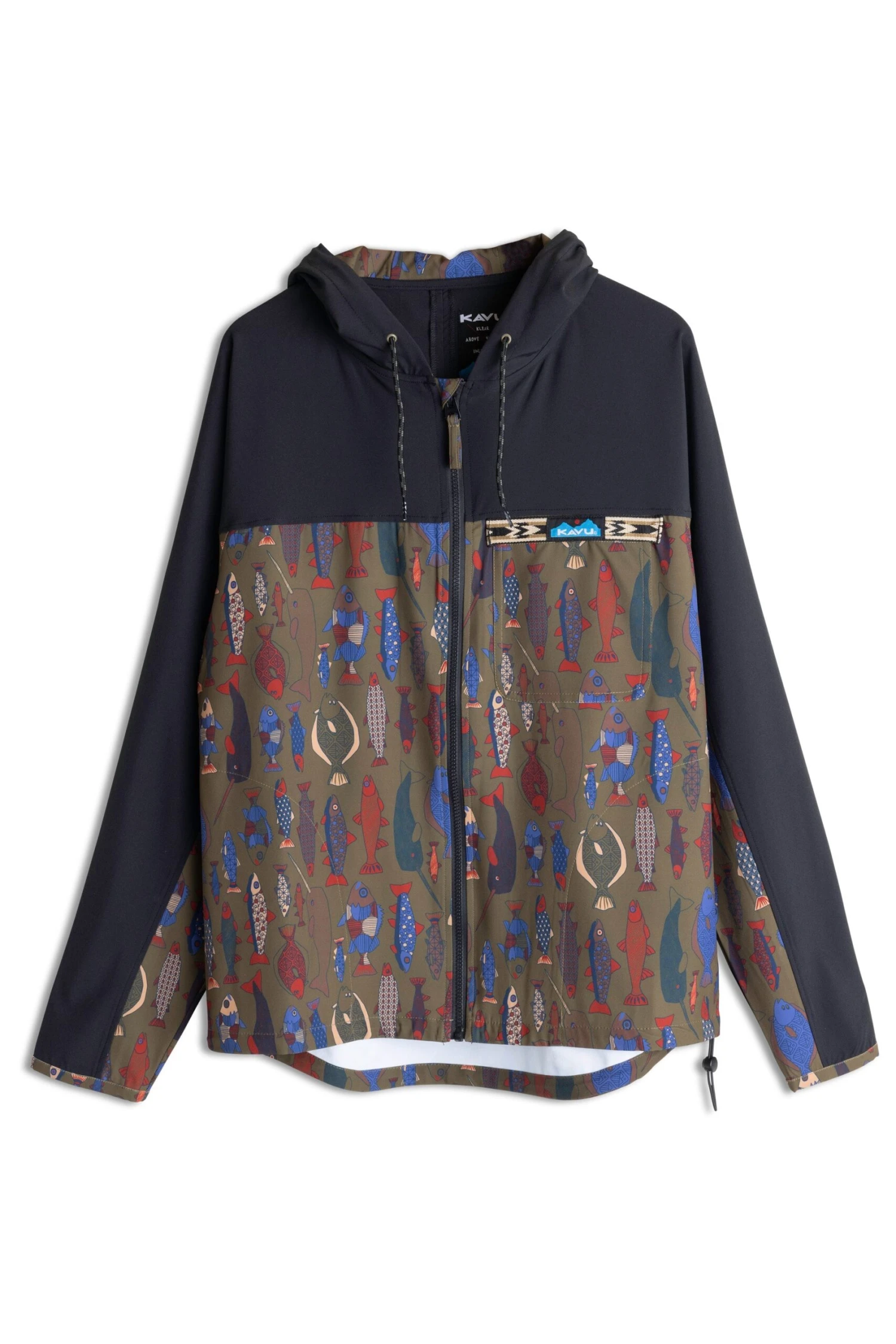 Casual fit, full zip light weight jacket, three panel hood with drawcord and logo printed aglets, interior self-fabric neck tape, front chest pocket with patterned webbing detail and hook and loop closure, mesh lined hand pockets, gusseted underarms, back drop tailed hem and bungee cord with cinch lock.