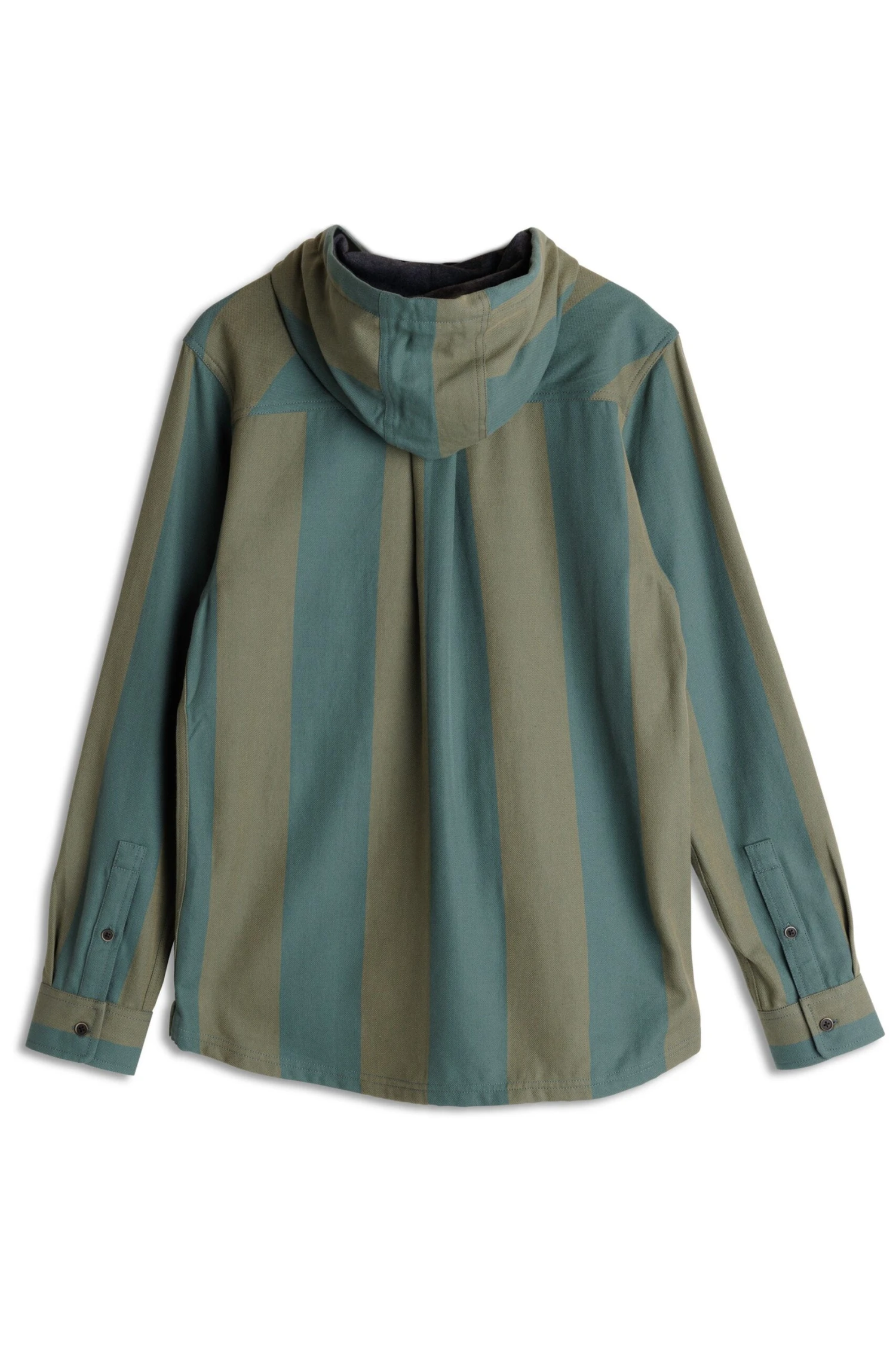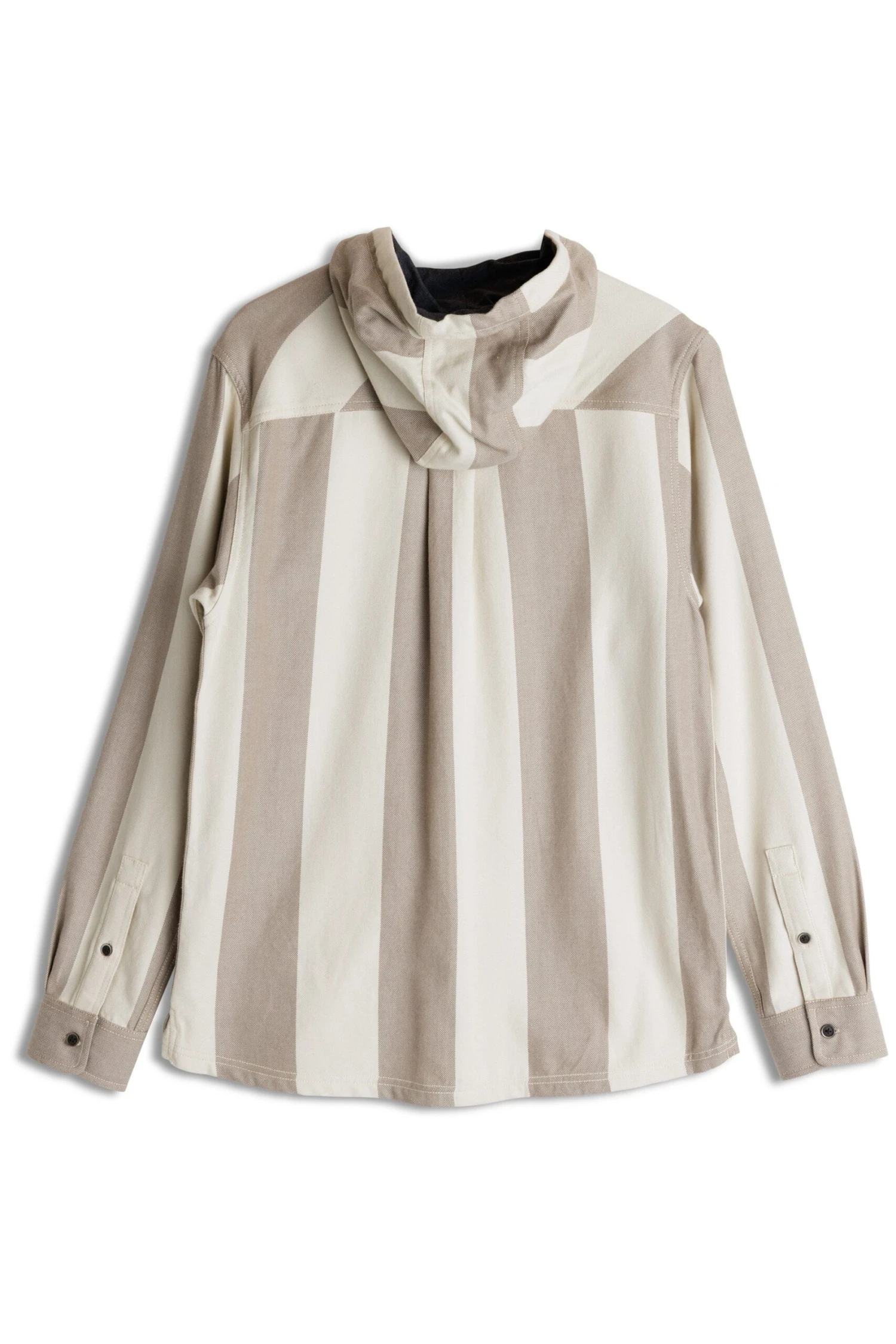 Casual fit, full zip light weight shirt jacket, three panel jersey lined hood with drawcord and interior self-fabric neck tape, single chest flap pocket with button closure, jersey lined hand pockets and sleeve cuffs, back bias cut yoke with center back box pleat, 25% certified recycled polyester faux horn buttons with matte finish, curved hem with side vents.
