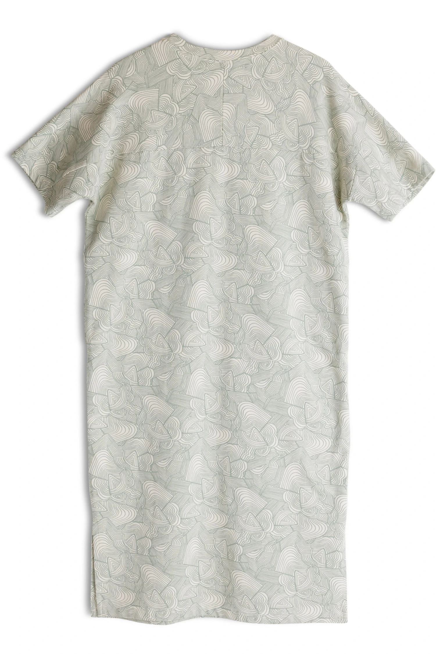 Relaxed fit, short sleeve t-shirt dress, self-fabric crew neckline, front and back yoke, on seam hand pockets, straight hem with side vents, length hits at knee, heat transfer back neck label.