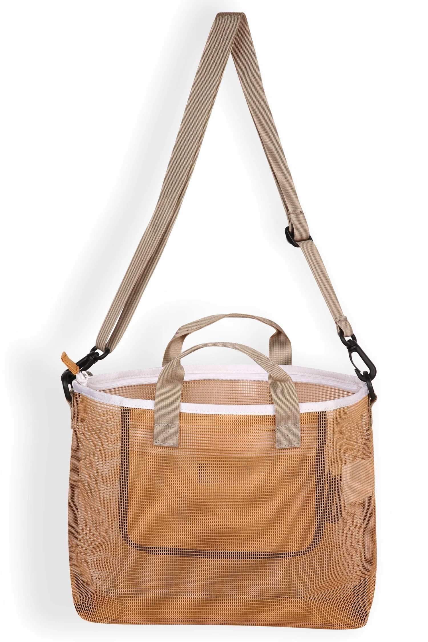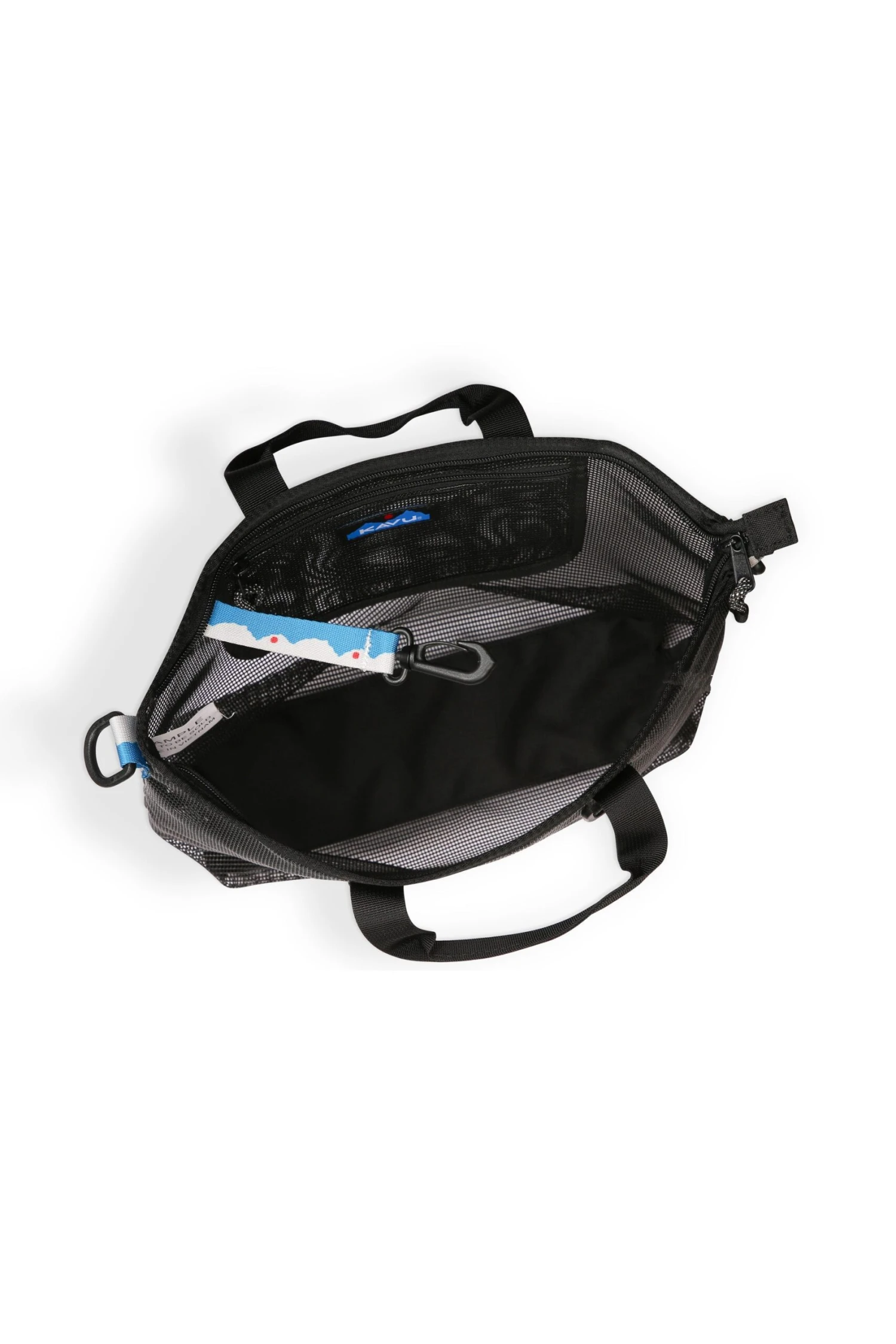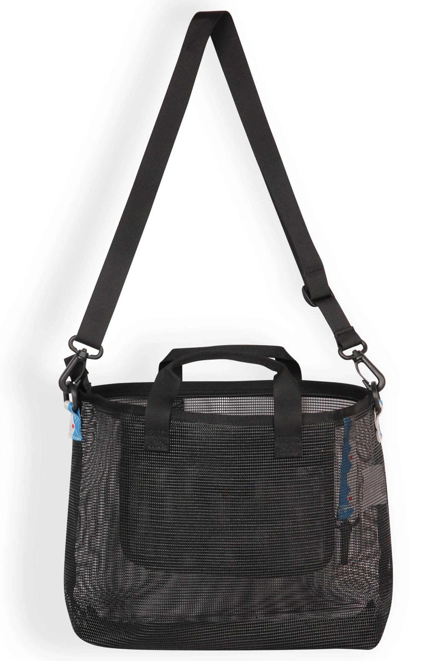 Small tote, adjustable webbing shoulder strap that can detach, plastic d-ring and snap hook hardware, fixed webbing shoulder straps secured with box stitch, one main compartment with two-way zip closure and rope loop zip pulls, internal zip mesh pocket and pattern webbing key fob clip loop.