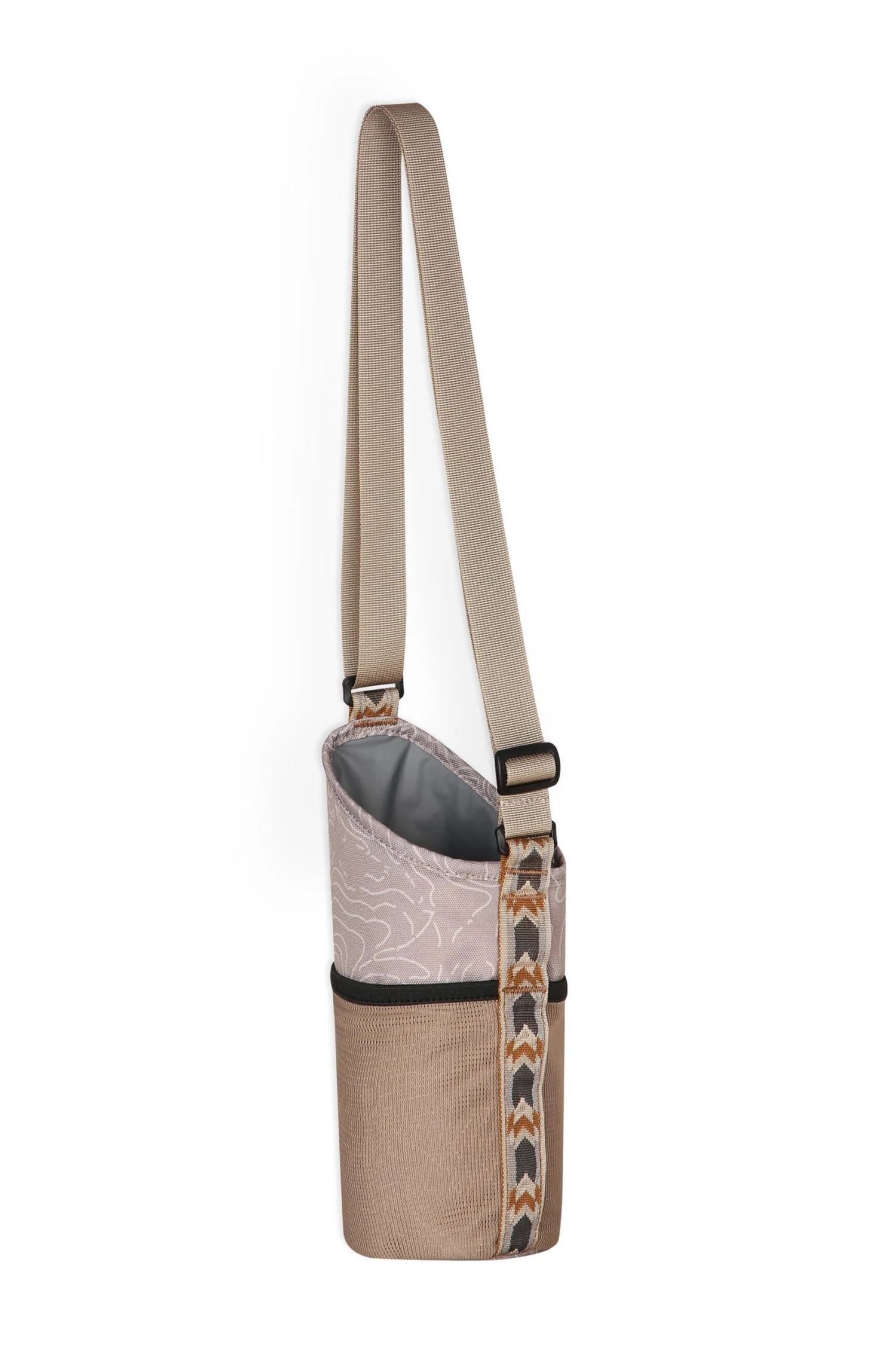 Fully insulated/padded beverage bottle sling, cross body adjustable webbing shoulder strap, rectangular plastic ring & tri slide hardware, stretch mesh exterior pocket, pattern webbing daisy chain detail, fits up to 32 fl oz water bottle.