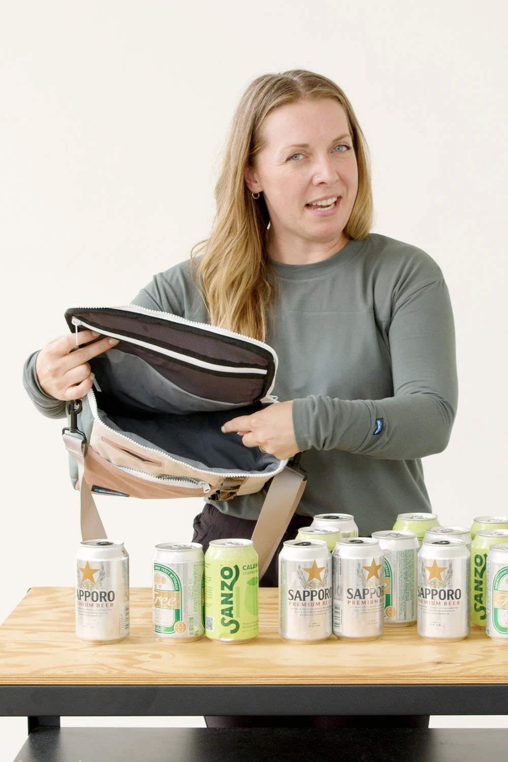 Fully insulated/padded cooler bag, cross body adjustable and detachable shoulder strap, metal d-ring and spring hook hardware, fixed hand strap with padded grip, vertical rigging straps, main compartment with zip closure, exterior zip and welt pockets, interior mesh zip pocket. Designed to hold ice packs, not loose ice.