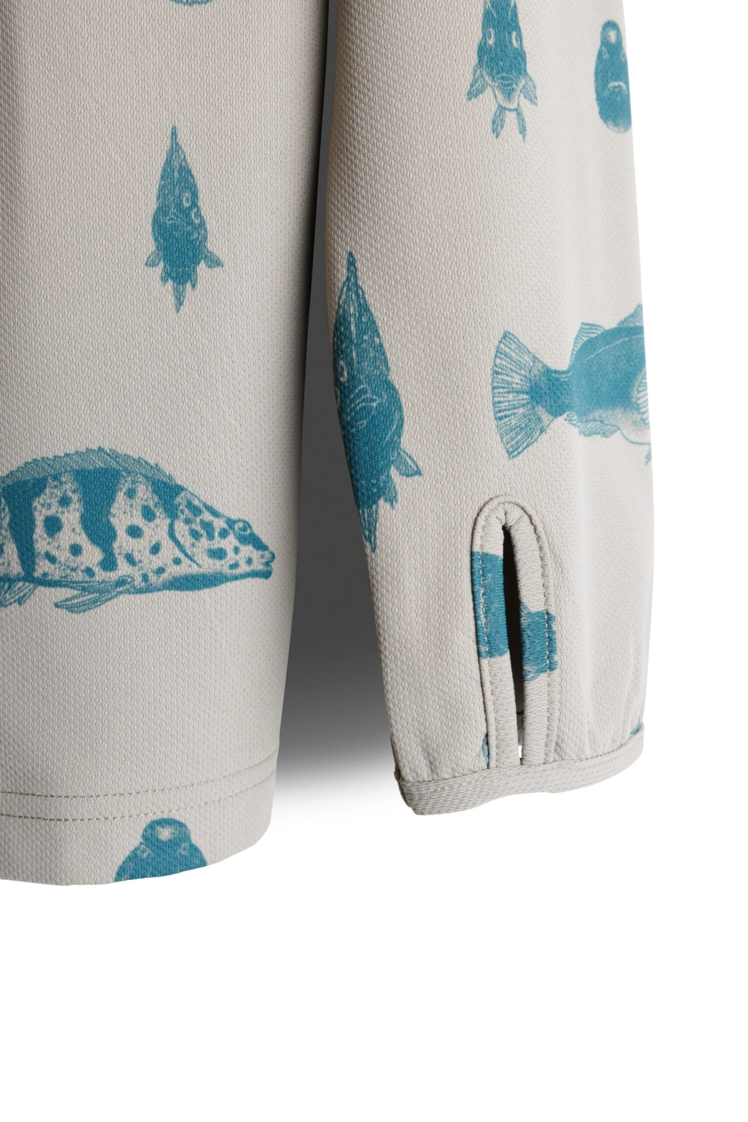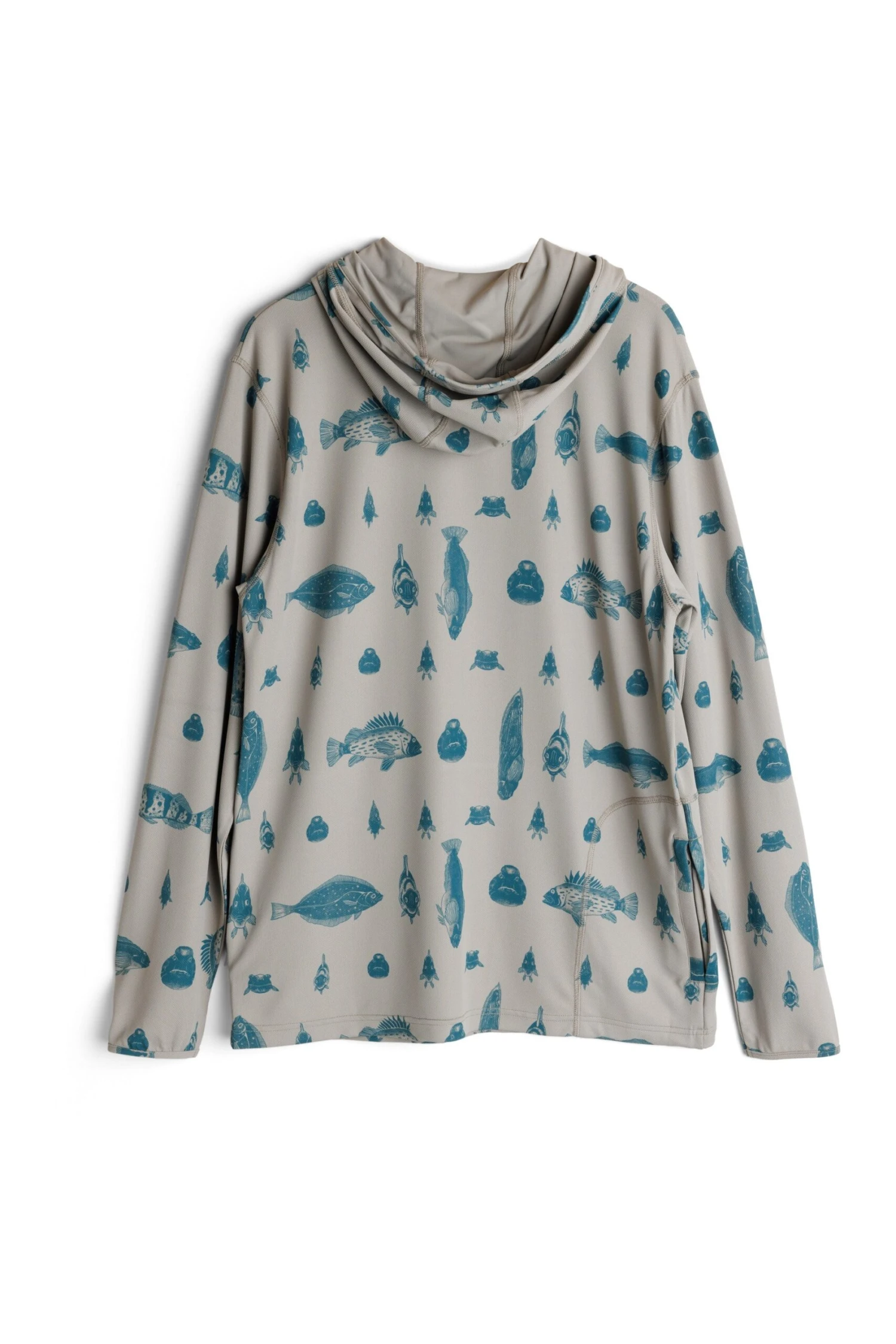 Casual fit, long sleeve hooded sun shirt, drawcord, pass through hand pocket, thumb loop at cuff, back security zip pocket, shirt is packable into back zip self-fabric pocket bag, straight hem, 4 needle flatlock stitch seams, transfer back neck label.