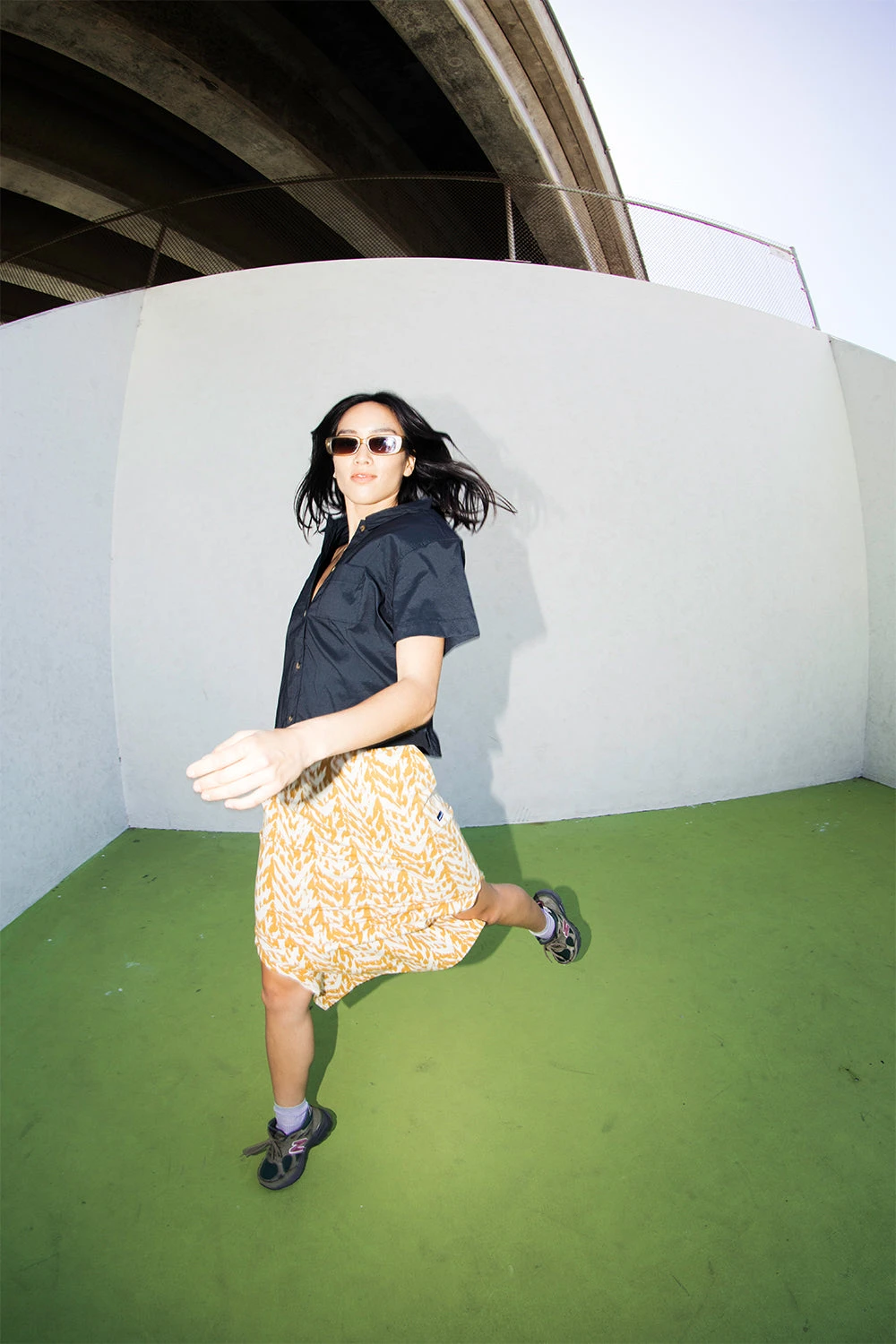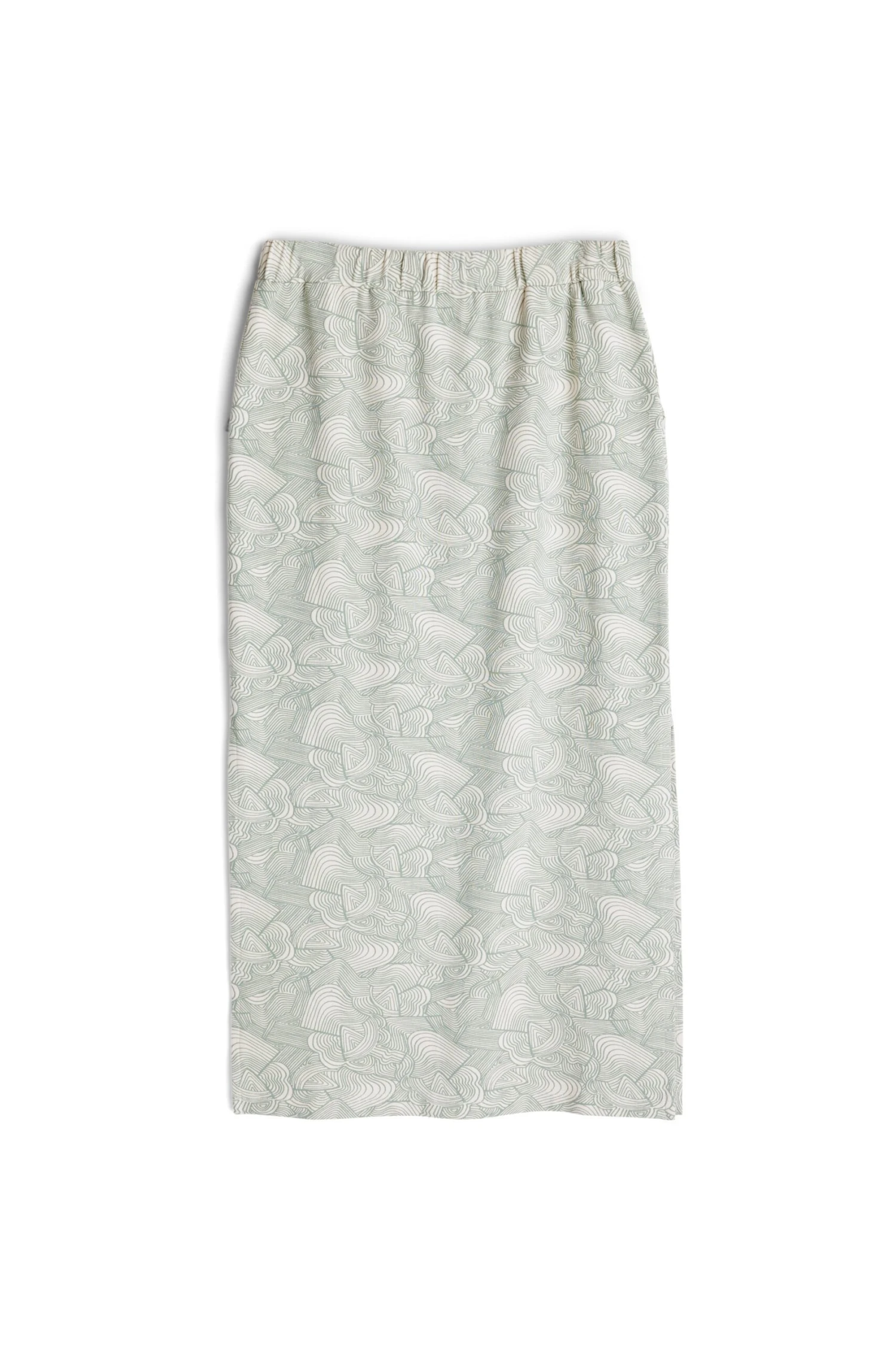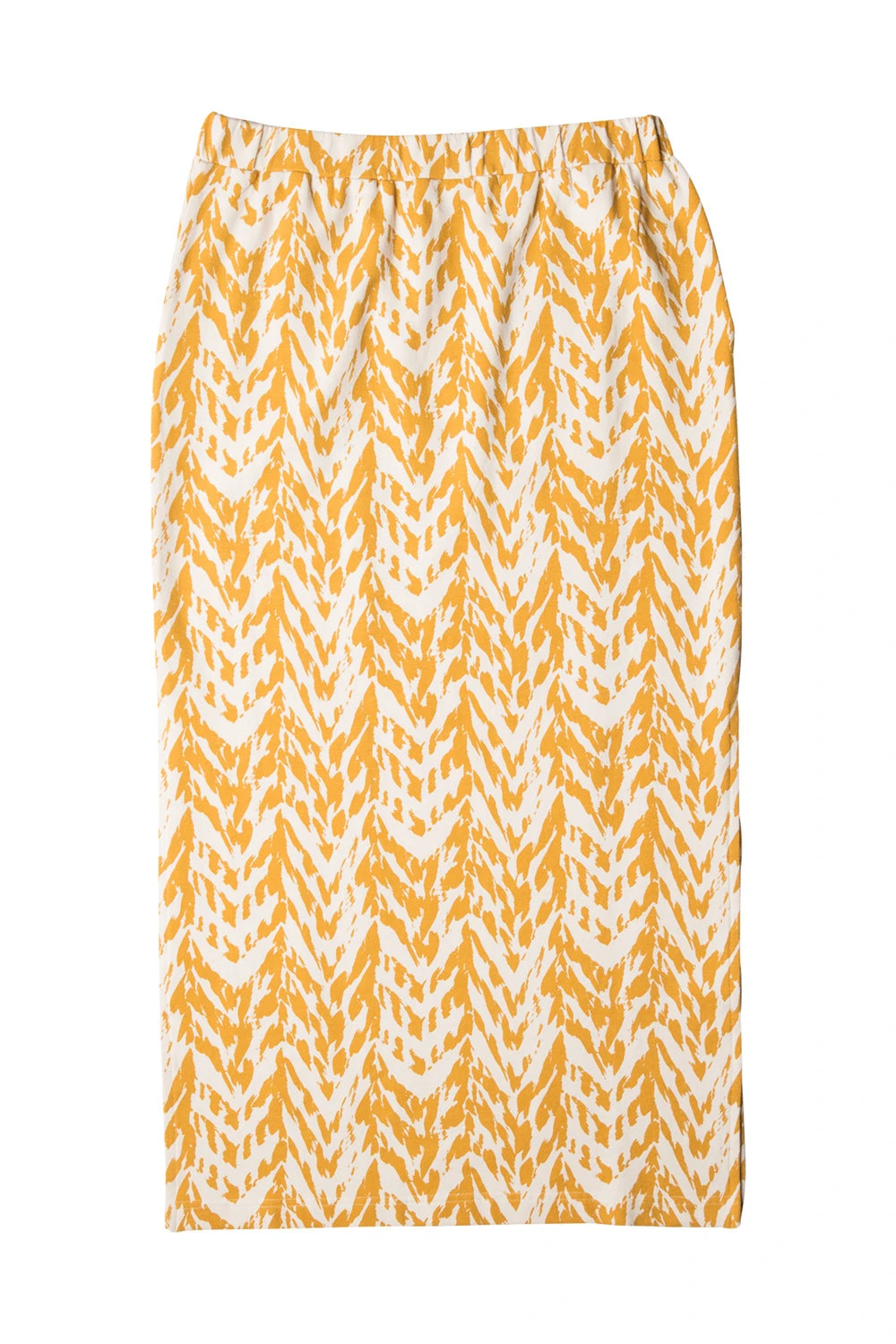 Semi-fitted midi skirt, elastic waistband, front pockets, straight hem with deep side vents, length hits mid-calf.