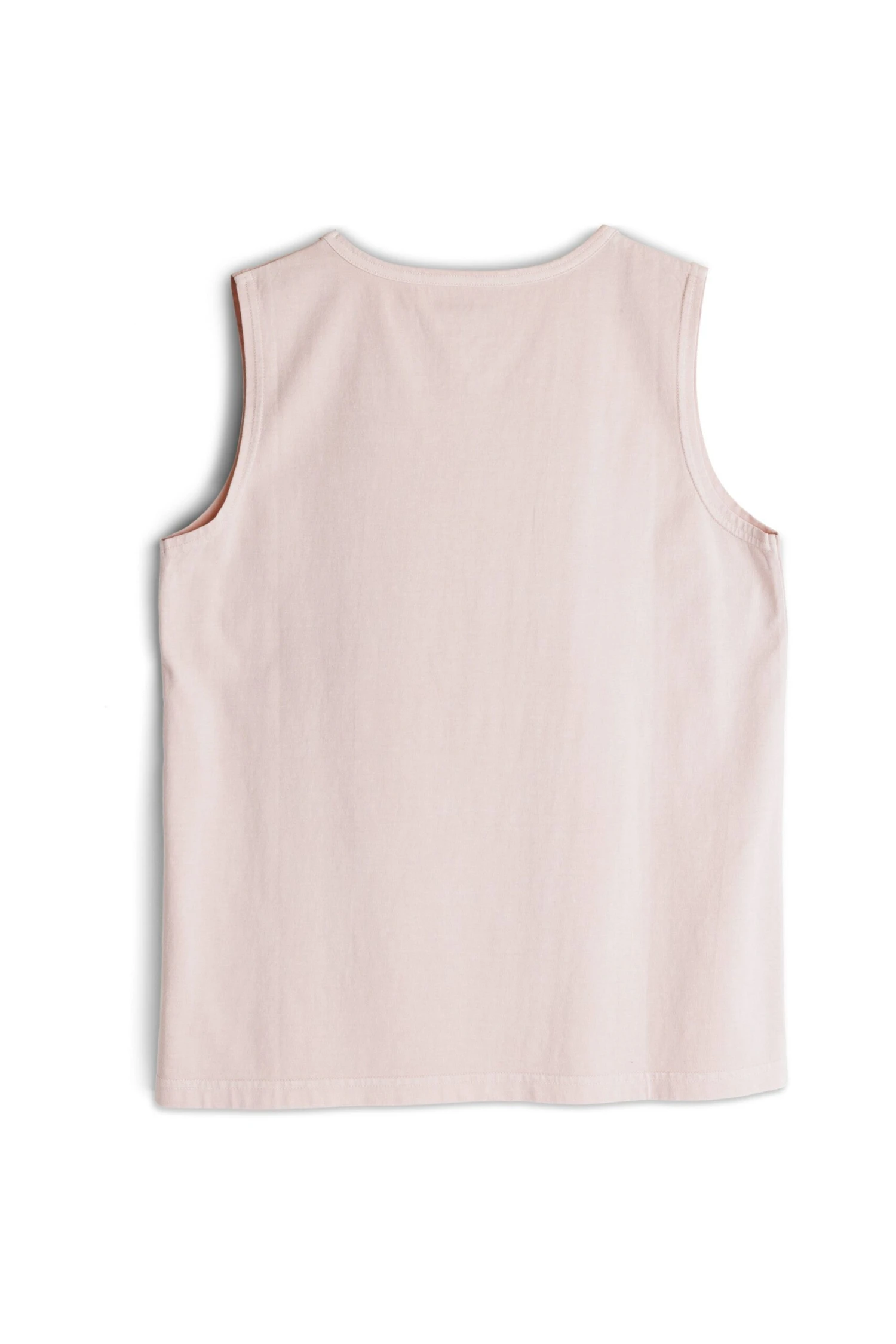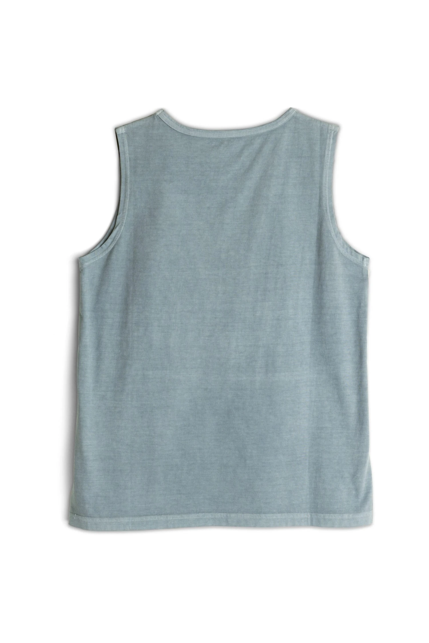 Semi-fitted tank top, self-fabric binding at crew neckline, screen print on center front chest, straight hem, heat transfer back neck label.