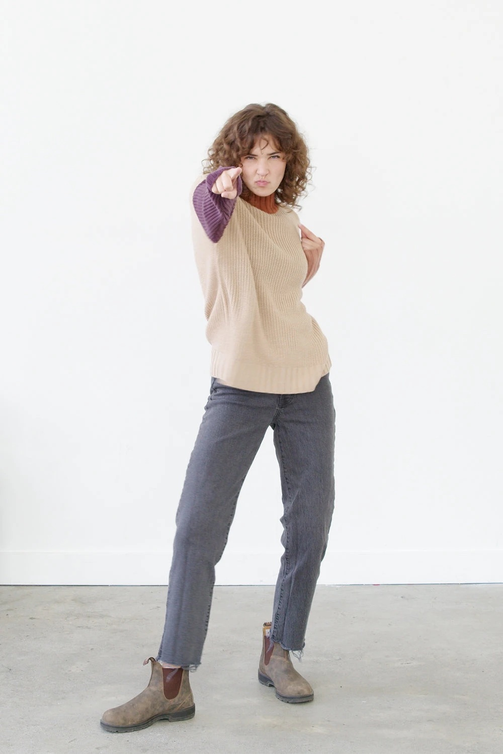 Relaxed fit, chunky ribbed fully fashioned turtleneck sweater, color blocked collar, cuffs, and hem, hip length.