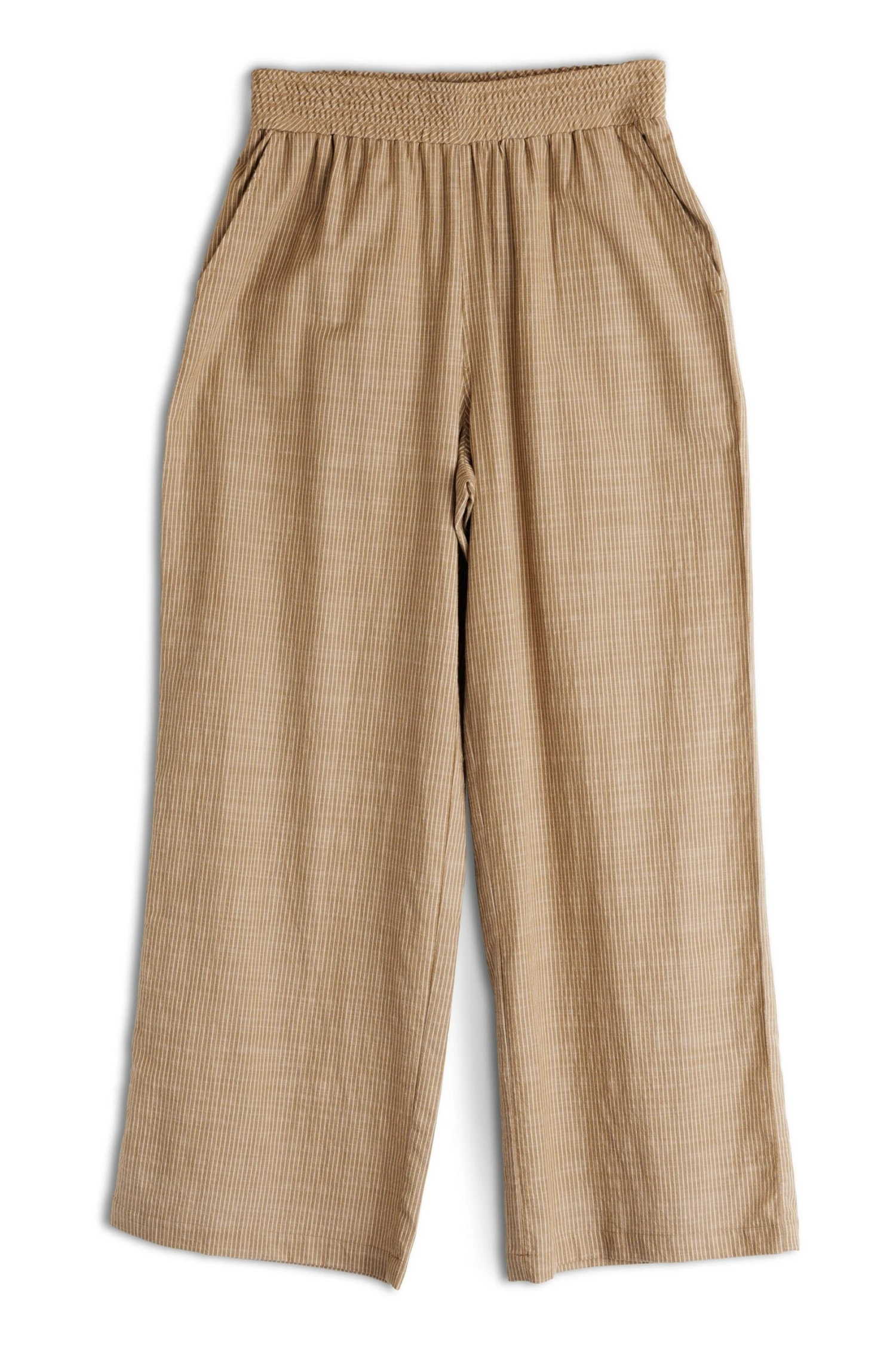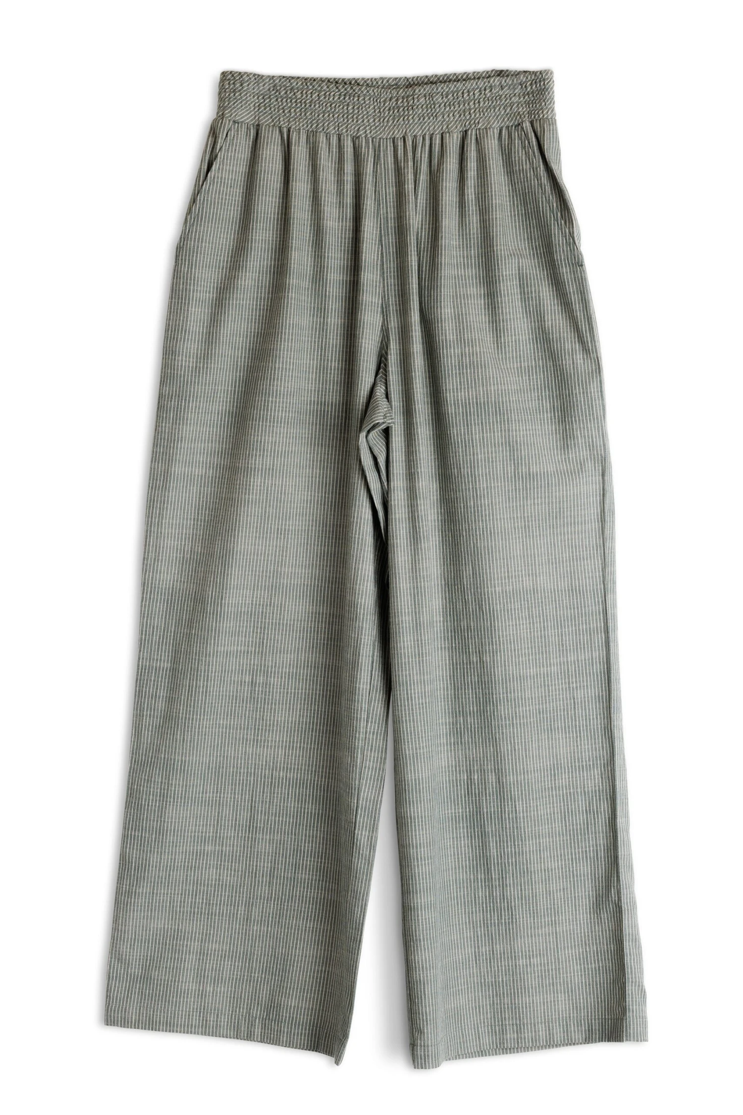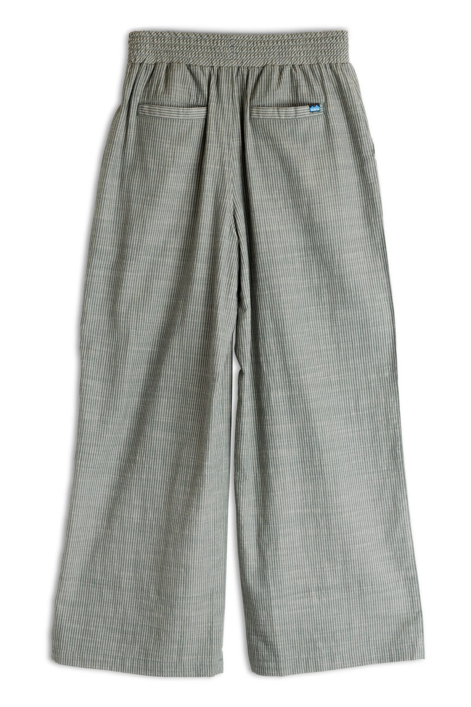 Relaxed fit mid-rise wide leg pant, elastic waistband, front pockets, back welt pockets.