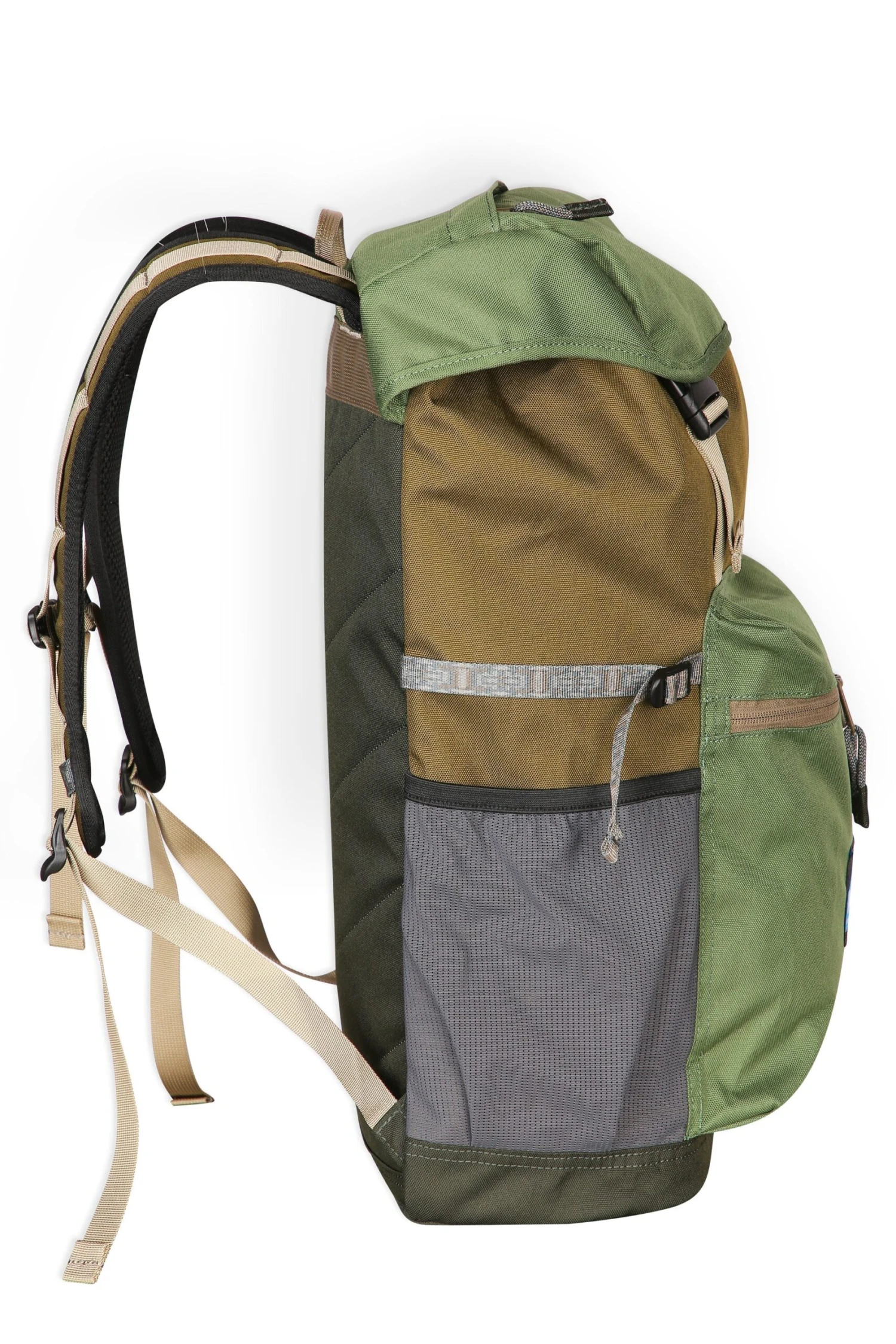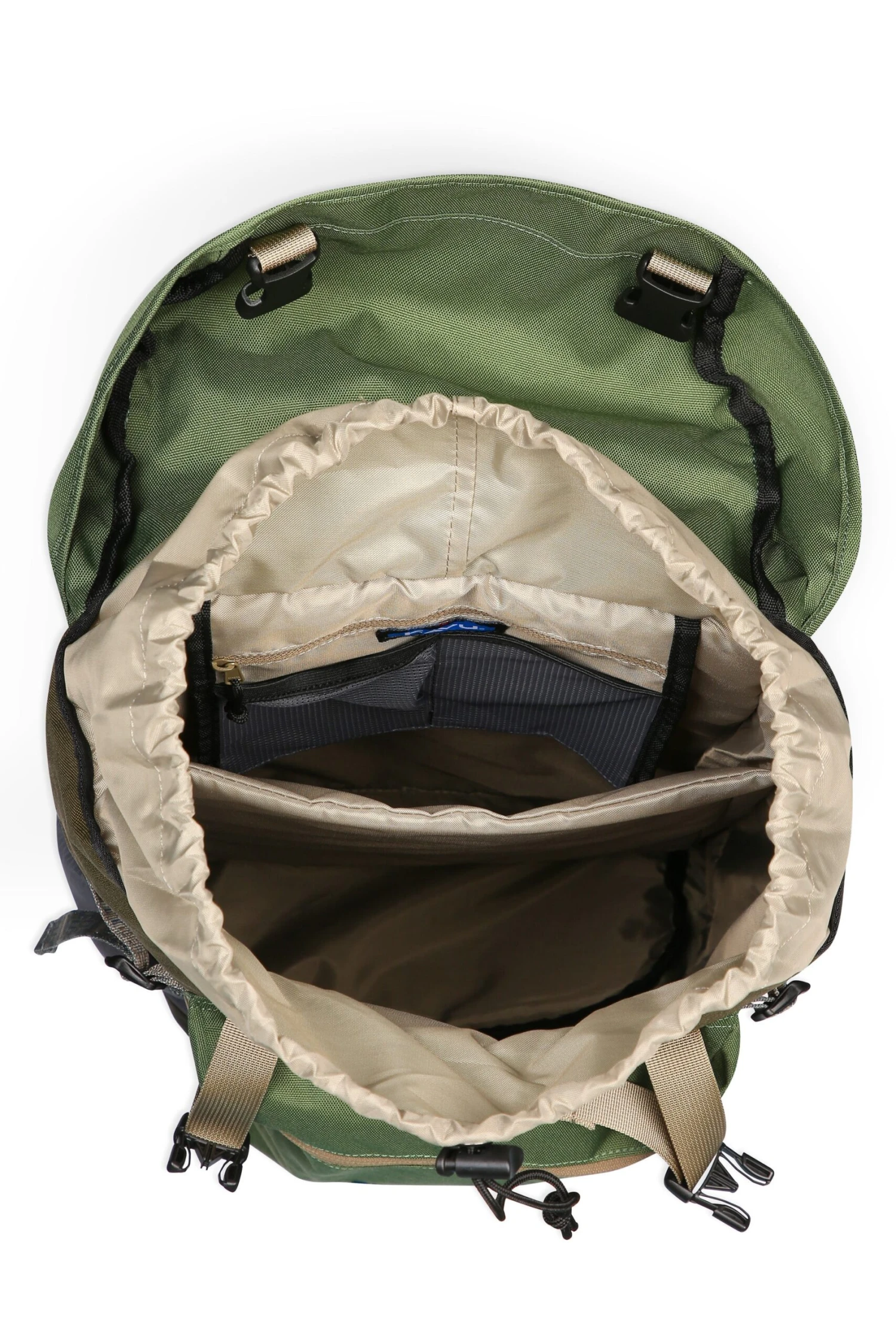 This backpack features adjustable padded contoured shoulder and chest straps with side release buckles, fixed hand strap, main compartment with cord-lock cinch and flap closure and side entry access, large internal padded pouch, zip and mesh organizational pockets, exterior zip pocket on flap and large billowed zip patch pocket on front, two side mesh pockets, rope loop zip pulls, padded bottom and back panel with security zip pocket.