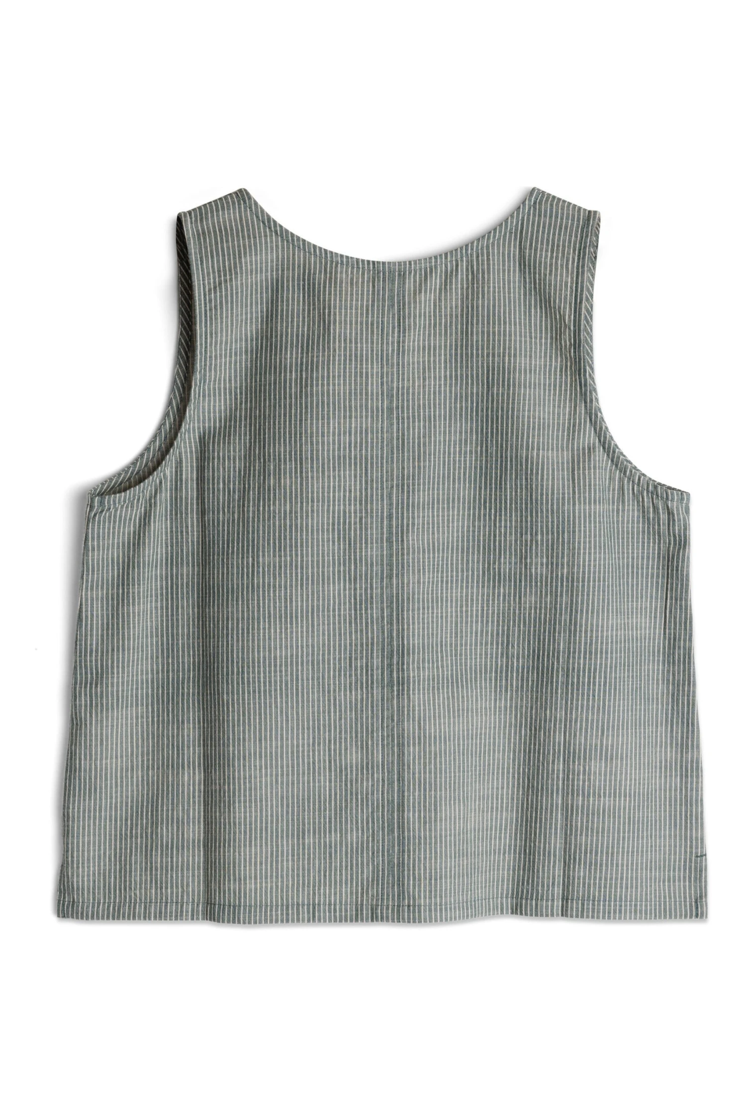 Semi-fitted, belt length tank top, v-neckline, chest pocket, front and back vertical seam styling, straight hem with side vents.