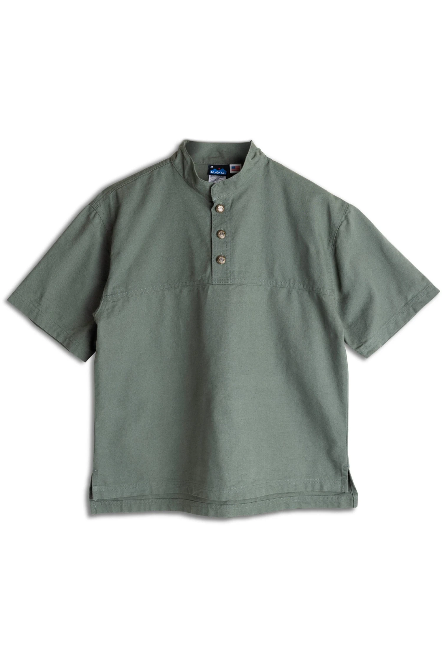 Casual fit, short sleeve popover shirt, mandarin collar, half placket with logo shank buttons, front chest yoke with logo label, high low hem with side vents, thick thread and double needle reinforced seams.