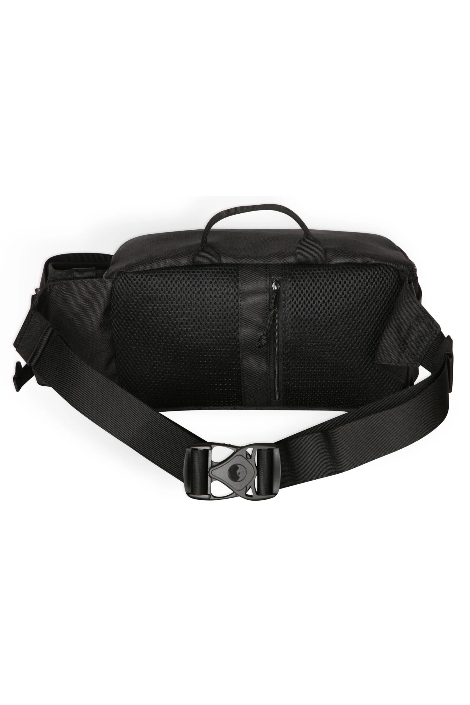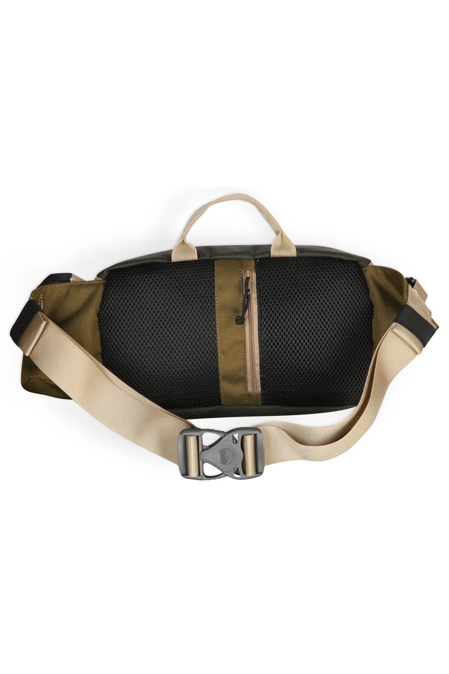 Belt bag / sling pack with adjustable straps and side release buckle, fixed hand strap, exterior rigging and cinch straps, zip pocket and canned beverage holder that can detach and be reattached on either side, main compartment with two way zip closure, one interior zip and two mesh pockets, rope loop zip pulls, padded back mesh panel with security zip pocket.
