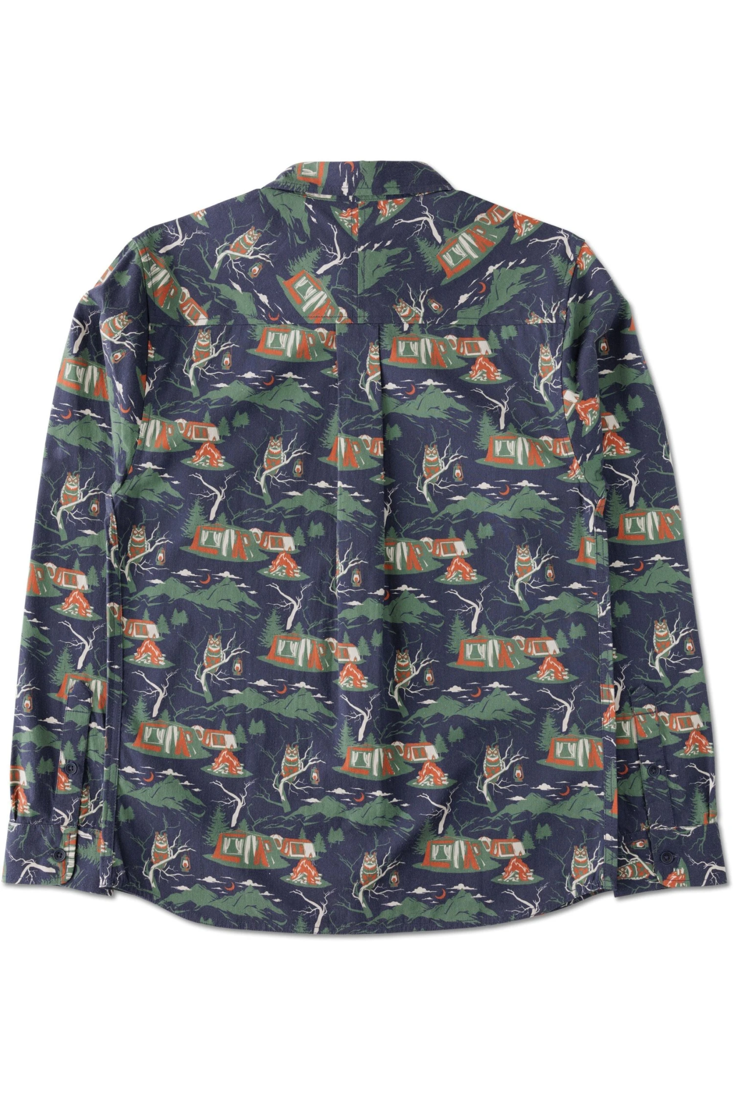 Casual fit, long sleeve button up shirt, stand collar, single chest pocket with button closure and pen pocket, logo snap hidden bottom hem pocket, adjustable cuffs, bias cut yoke with center back box pleat, chorozo buttons, curved hem.